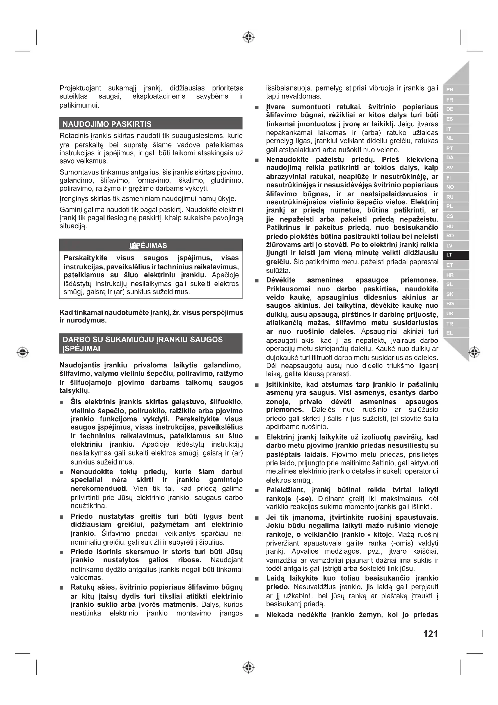 ĮSPĖJIMAI Naudojantis įrankiu privaloma laikytis galandimo, šlifavimo, valymo vieliniu šepečiu, poliravimo, raižymo ir šlifuojamojo pjovimo darbams taikomų saugos taisyklių. ■ Šis elektrinis įrankis skirtas galąstuvo, šlifuoklio, vielinio šepečio, poliruoklio, raižiklio arba pjovimo įrankio funkcijoms vykdyti. Perskaitykite visus saugos įspėjimus, visas instrukcijas, paveikslėlius ir techninius reikalavimus, pateikiamus su šiuo elektriniu įrankiu. Apačioje išdėstytų instrukcijų nesilaikymas gali sukelti elektros smūgį, gaisrą ir (ar) sunkius sužeidimus. ■ Nenaudokite tokių priedų, kurie šiam darbui specialiai nėra skirti ir įrankio gamintojo nerekomenduoti. Vien tik tai, kad priedą galima pritvirtinti prie Jūsų elektrinio įrankio, saugaus darbo neužtikrina. ■ Priedo nustatytas greitis turi būti lygus bent didžiausiam greičiui, pažymėtam ant elektrinio įrankio. Šlifavimo priedai, veikiantys sparčiau nei nominaliu greičiu, gali sulūžti ir subyrėti į šipulius. ■ Priedo išorinis skersmuo ir storis turi būti Jūsų įrankio nustatytos galios ribose. Naudojant netinkamo dydžio antgalius įrankis negali būti tinkamai valdomas. ■ Ratukų ašies, švitrinio popieriaus šlifavimo būgnų ar kitų įtaisų dydis turi tiksliai atitikti elektrinio įrankio suklio arba įvorės matmenis. Dalys, kurios neatitinka elektrinio įrankio montavimo įrangos išsibalansuoja, pernelyg stipriai vibruoja ir įrankis gali tapti nevaldomas. ■ Įtvare sumontuoti ratukai, švitrinio popieriaus šlifavimo būgnai, rėžikliai ar kitos dalys turi būti tinkamai įmontuotos į įvorę ar laikiklį. Jeigu įtvaras nepakankamai laikomas ir (arba) ratuko užlaidas pernelyg ilgas, įrankiui veikiant dideliu greičiu, ratukas gali atsipalaiduoti arba nušokti nuo veleno. ■ Nenaudokite pažeistų priedų. Prieš kiekvieną naudojimą reikia patikrinti ar tokios dalys, kaip abrazyviniai ratukai, neaplūžę ir nesutrūkinėję, ar nesutrūkinėjęs ir nesusidėvėjęs švitrinio popieriaus šlifavimo būgnas, ir ar neatsipalaidavusios ir nesutrūkinėjusios vielinio šepečio vielos. Elektrinį įrankį ar priedą numetus, būtina patikrinti, ar jie nepažeisti arba pakeisti priedą nepažeistu. Patikrinus ir pakeitus priedą, nuo besisukančio priedo plokštės būtina pasitraukti toliau bei neleisti žiūrovams arti jo stovėti. Po to elektrinį įrankį reikia įjungti ir leisti jam vieną minutę veikti didžiausiu greičiu. Šio patikrinimo metu, pažeisti priedai paprastai sulūžta. ■ Dėvėkite asmenines apsaugos priemones. Priklausomai nuo darbo paskirties, naudokite veido kaukę, apsauginius didesnius akinius ar saugos akinius. Jei taikytina, dėvėkite kaukę nuo dulkių, ausų apsaugą, pirštines ir darbinę prijuostę, atlaikančią mažas, šlifavimo metu susidariusias ar nuo ruošinio daleles. Apsauginiai akiniai turi apsaugoti akis, kad į jas nepatektų įvairaus darbo operacijų metu skriejančių dalelių. Kaukė nuo dulkių ar dujokaukė turi filtruoti darbo metu susidariusias daleles. Dėl neapsaugotų ausų nuo didelio triukšmo ilgesnį laiką, galite klausą prarasti. ■ Įsitikinkite, kad atstumas tarp įrankio ir pašalinių asmenų yra saugus. Visi asmenys, esantys darbo zonoje, privalo dėvėti asmenines apsaugos priemones. Dalelės nuo ruošinio ar sulūžusio priedo gali skrieti į šalis ir jus sužeisti, jei stovite šalia apdirbamo ruošinio. ■ Elektrinį įrankį laikykite už izoliuotų paviršių, kad darbo metu pjovimo įrankio priedas nesusiliestų su paslėptais laidais. Pjovimo metu priedas, prisilietęs prie laido, prijungto prie maitinimo šaltinio, gali aktyvuoti metalines elektrinio įrankio detales ir sukelti operatoriui elektros smūgį. ■ Paleidžiant, įrankį būtinai reikia tvirtai laikyti rankoje (-se). Didinant greitį iki maksimalaus, dėl variklio reakcijos sukimo momento įrankis gali išlinkti. ■ Jei tik įmanoma, įtvirtinkite ruošinį spaustuvais. Jokiu būdu negalima laikyti mažo rušinio vienoje rankoje, o veikiančio įrankio - kitoje. Mažą ruošinį priveržiant spaustuvais galite ranka (-omis) valdyti įrankį. Apvalios medžiagos, pvz., įtvaro kaiščiai, vamzdžiai ar vamzdeliai pjaunant dažnai ima suktis ir todėl antgalis gali įstrigti arba šoktelėti link jūsų. ■ Laidą laikykite kuo toliau besisukančio įrankio priedo. Nesuvaldžius įrankio, jis laidą gali perpjauti ar jį užkabinti, bei jūsų ranką ar plaštaką įtraukti į besisukantį priedą. ■ Niekada nedėkite įrankio žemyn, kol jo priedas122 | Lietuviškai visiškai nesustojo. Besisukantis įrankio priedas gali pagriebti paviršių ir dėl to galite įrankio nesuvaldyti. ■ Pakeitus antgalius arba pareguliavus priedus, reikia patikrinti, ar įvorės veržlė, laikiklis ar kiti reguliavimo priedai tinkamai suveržti. Atsilaisvinę reguliavimo įtaisai gali netikėtai persislinkti, tuomet įrankis taps nevaldomas, o atsilaisvinusios besisukančios dalys bus staigiai nusviestos. ■ Elektrinį prietaisą nešdami šone, prieš tai jį išjunkite. Besisukančiam įrankio priedui atsitiktinai prisilietus prie Jūsų, jis gali pagriebti drabužius ir priedas gali būti įtrauktas į Jūsų kūną. ■ Reguliariai valykite elektrinio įrankio oro ventiliacijos angeles. Variklio ventiliatorius įsiurbia į korpuso vidų dulkes ir per didelis susikaupusių metalo dalelių kiekis gali kelti su elektra susijusius pavojus. ■ Nenaudokite elektrinio įrankio šalia degių medžiagų. Kibirkštys gali šias medžiagas uždegti. ■ Nenaudokite tokių priedų, kuriems reikalingas aušinimo skystis. Naudojant vandenį ar kitą aušinimo skystį galima sukelti elektros smūgį ar nuo elektros žūti. ATATRANKA IR SU JA SUSIJĘ ĮSPĖJIMAI Atatrankos jėga yra staigi reakcija prisispaudus arba užkliuvus besisukančiam ratukui, švitrinio popieriaus juostai, šepečiui ar kitai daliai ar priedui. Prisispaudus ar