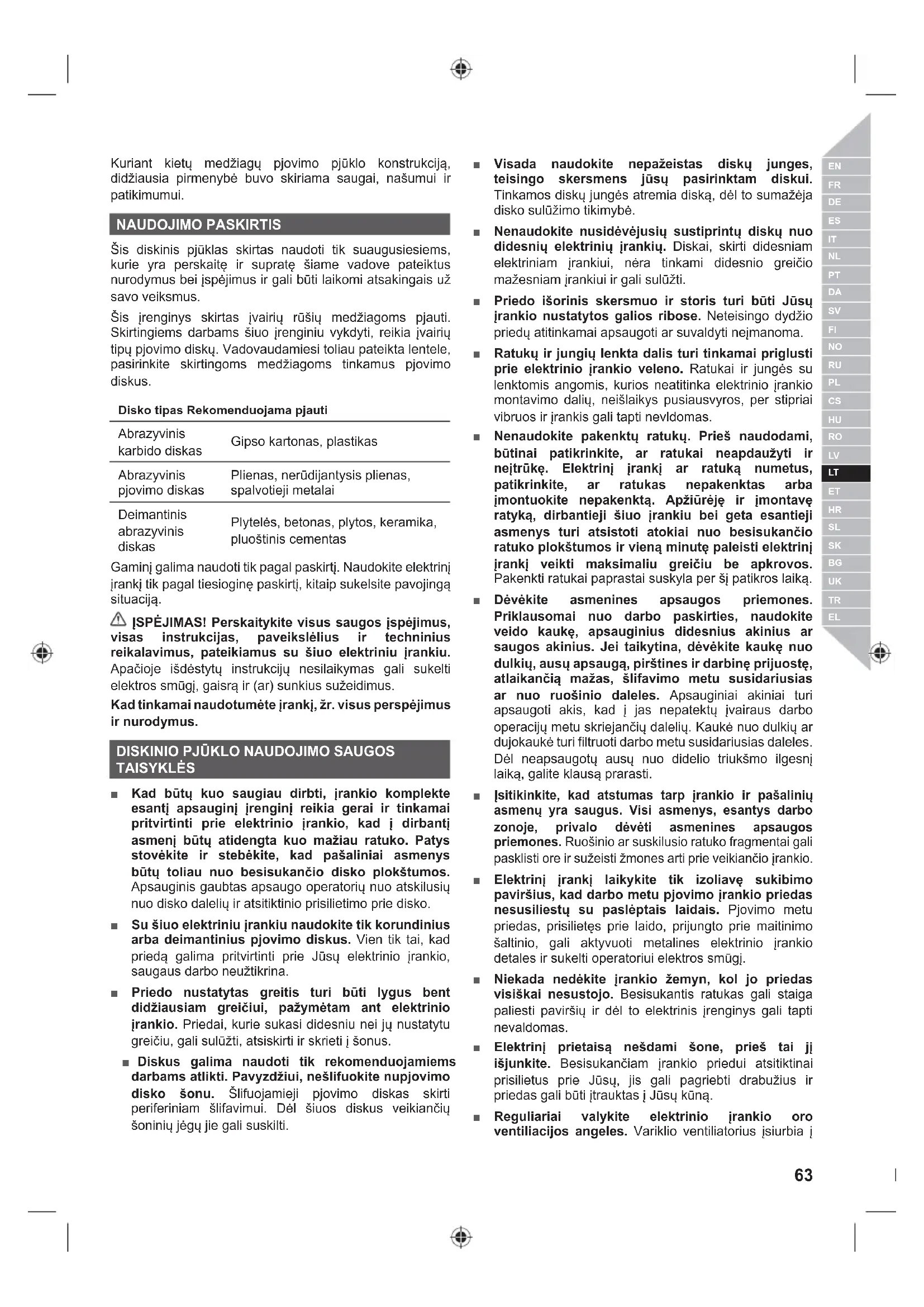 Kuriant kietų medžiagų pjovimo pjūklo konstrukciją, didžiausia pirmenybė buvo skiriama saugai, našumui ir patikimumui. NAUDOJIMO PASKIRTIS Šis diskinis pjūklas skirtas naudoti tik suaugusiesiems, kurie yra perskaitę ir supratę šiame vadove pateiktus nurodymus bei įspėjimus ir gali būti laikomi atsakingais už savo veiksmus. Šis įrenginys skirtas įvairių rūšių medžiagoms pjauti. Skirtingiems darbams šiuo įrenginiu vykdyti, reikia įvairių tipų pjovimo diskų. Vadovaudamiesi toliau pateikta lentele, pasirinkite skirtingoms medžiagoms tinkamus pjovimo diskus. Disko tipas Rekomenduojama pjauti Abrazyvinis karbido diskas Gipso kartonas, plastikas Abrazyvinis pjovimo diskas Plienas, nerūdijantysis plienas, spalvotieji metalai Deimantinis abrazyvinis diskas Plytelės, betonas, plytos, keramika, pluoštinis cementas Gaminį galima naudoti tik pagal paskirtį. Naudokite elektrinį įrankį tik pagal tiesioginę paskirtį, kitaip sukelsite pavojingą situaciją. ĮSPĖJIMAS! Perskaitykite visus saugos įspėjimus, visas instrukcijas, paveikslėlius ir techninius reikalavimus, pateikiamus su šiuo elektriniu įrankiu. Apačioje išdėstytų instrukcijų nesilaikymas gali sukelti elektros smūgį, gaisrą ir (ar) sunkius sužeidimus. Kad tinkamai naudotumėte įrankį, žr. visus perspėjimus ir nurodymus.