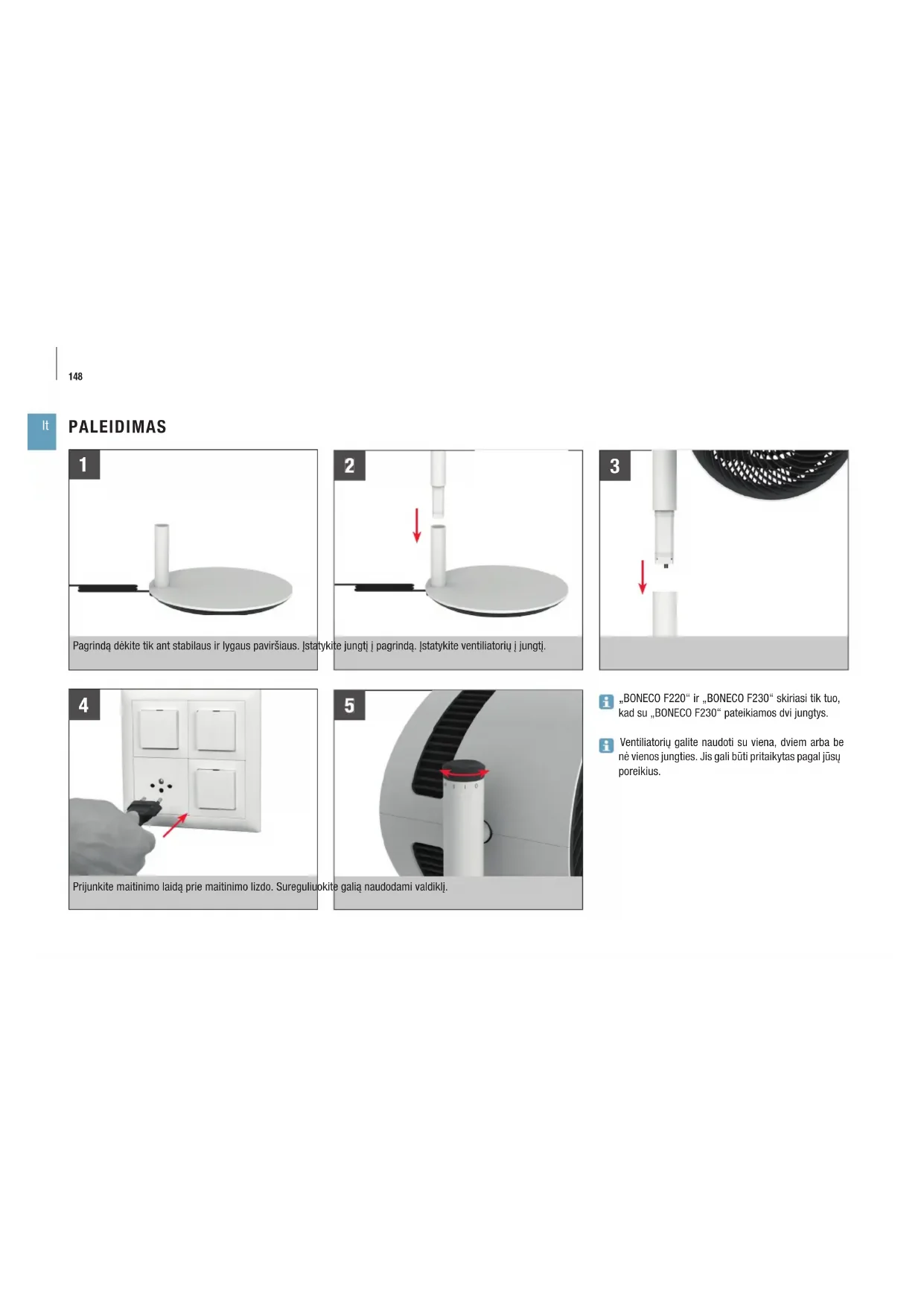 PALEIDIMAS „BONECO F220“ ir „BONECO F230“ skiriasi tik tuo, kad su „BONECO F230“ pateikiamos dvi jungtys. Ventiliatorių galite naudoti su viena, dviem arba be nė vienos jungties. Jis gali būti pritaikytas pagal jūsų poreikius. Pagrindą dėkite tik ant stabilaus ir lygaus paviršiaus. Įstatykite jungtį į pagrindą. Įstatykite ventiliatorių į jungtį. Prijunkite maitinimo laidą prie maitinimo lizdo. Sureguliuokite galią naudodami valdiklį.