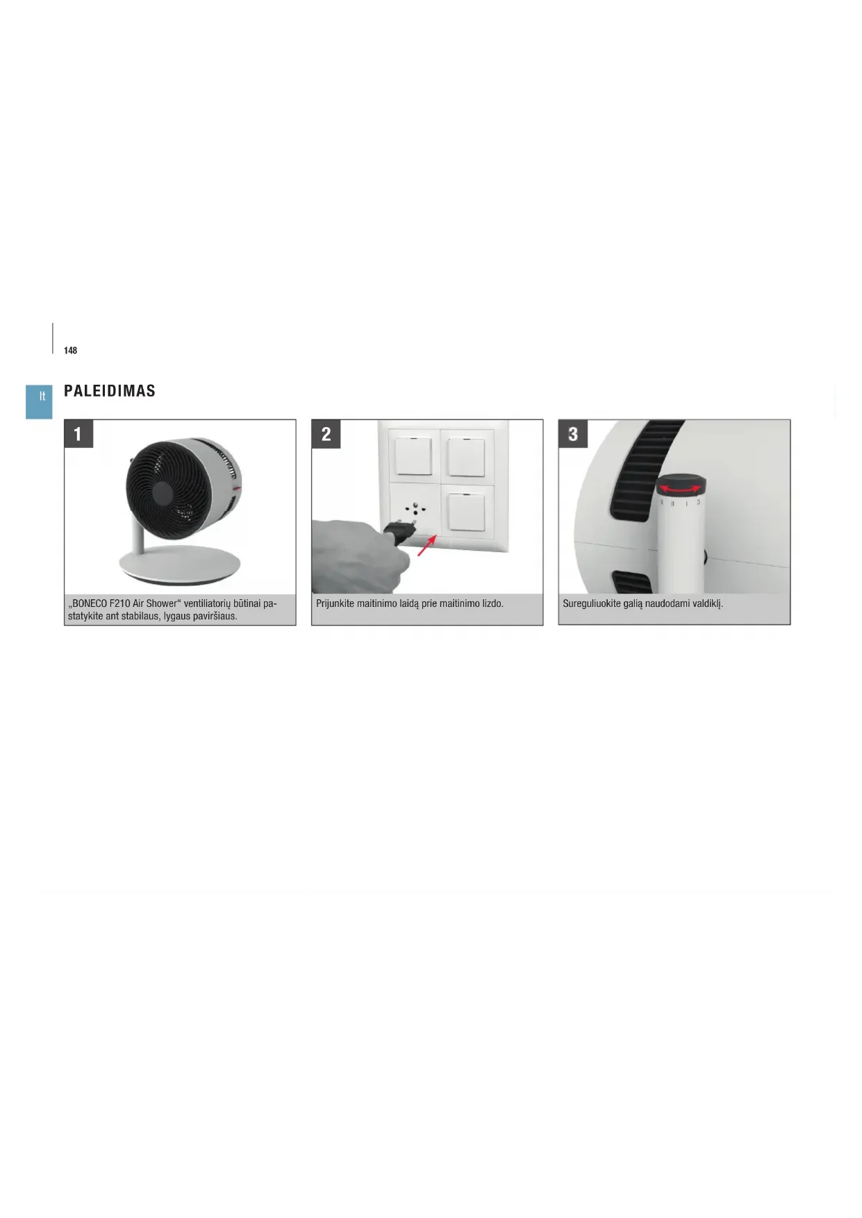 „BONECO F210 Air Shower“ ventiliatorių būtinai pa- statykite ant stabilaus, lygaus paviršiaus. Prijunkite maitinimo laidą prie maitinimo lizdo. Sureguliuokite galią naudodami valdiklį.