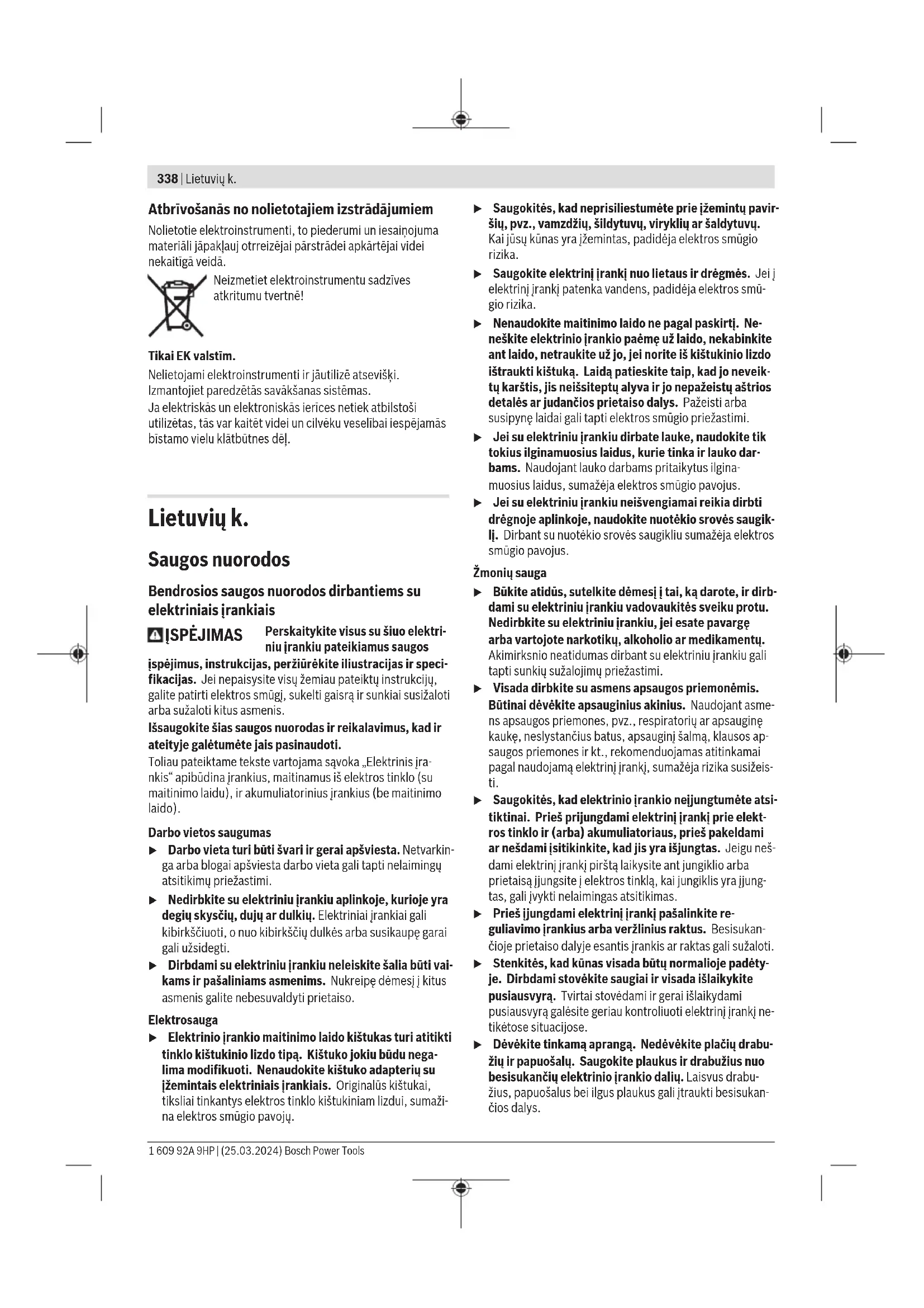 Slēdža modelis ar fiksatoru Lai nodotu ekspluatācijā elektroinstrumentu, vispirms nospiediet ieslēdzēju/izslēdzēju(2) ➊, pēc tam bīdiet uz priekšu➋. Nospiediet un pēc tam turiet nospiestu ➌. Lai fiksētu nospiesto ieslēdzēju/izslēdzēju(2) pabīdiet ieslēdzēju/izslēdzēju(2) vēl uz priekšu ➍. Lai elektroinstrumentu izslēgtu, atlaidiet ieslēdzēju/ izslēdzēju(2) vai īslaicīgi nospiediet un atlaidiet ieslēdzēju/ izslēdzēju(2), ja tas ir fiksēts ieslēgtā stāvoklī. Slēdža modelis bez fiksatora Lai nodotu ekspluatācijā elektroinstrumentu, vispirms nospiediet ieslēdzēju/izslēdzēju(2) ➊, pēc tam bīdiet uz priekšu➋. Nospiediet un pēc tam turiet nospiestu ➌. Lai elektroinstrumentu izslēgtu, atlaidiet ieslēdzēju(2). u Ik reizi pirms lietošanas pārbaudiet slīpēšanas darbinstrumentu. Slīpēšanas darbinstrumentam jābūt pareizi iestiprinātam un jāspēj brīvi griezties. Veiciet slīpēšanas darbinstrumenta pārbaudi, to vismaz 1 minūti ilgi darbinot bez slodzes. Nelietojiet bojātus, neapaļus vai vibrējošus slīpēšanas darbinstrumentus. Bojāti slīpēšanas darbinstrumenti var salūzt un radīt savainojumus. Apkalpošana un apkope Apkalpošana un tīrīšana u Pirms elektroinstrumenta apkopes vai apkalpošanas izvelciet tā elektrokabeļa kontaktdakšu no barojošā elektrotīkla kontaktligzdas. u Lai elektroinstruments darbotos droši un bez atteikumiem, regulāri tīriet tā korpusu un ventilācijas atveres. u Strādājot ekstremālos apstākļos, ja iespējams, lietojiet ārējo putekļu uzsūkšanas ierīci. Pēc iespējas biežāk izpūtiet ventilācijas atveres ar saspiestu gaisu un pievienojiet instrumentu elektrotīklam caur noplūdes strāvas aizsargreleju (PRCD). Izmantojot elektroinstrumentu metāla apstrādei, tā korpusa iekšpusē var uzkrāties strāvu vadoši putekļi. Tas var nelabvēlīgi ietekmēt elektroinstrumenta aizsargizolācijas sistēmu. Rūpīgi glabājiet un uzmanīgi lietojiet elektroinstrumenta piederumus. Ja nepieciešams nomainīt instrumenta elektrokabeli, tas jāveic firmas Bosch elektroinstrumentu servisa centrā vai pilnvarotā Bosch elektroinstrumentu remonta darbnīcā, jo tikai tā ir iespējams saglabāt vajadzīgo darba drošības līmeni. Putekļu tvertne Lai nodrošinātu optimālu aizsardzību pret putekļiem, putekļu tvertni(3) ir ieteicams tīrīt reizi dienā vai regulāros intervālos pēc lietošanas. Tīrīšanas intervāli ir atkarīgi no lietojuma. Klientu apkalpošanas dienests un konsultācijas par lietošanu Klientu apkalpošanas dienests atbildēs uz Jūsu jautājumiem par izstrādājumu remontu un apkalpošanu, kā arī par to rezerves daļām. Kopsalikuma attēlus un informāciju par rezerves daļām Jūs varat atrast interneta vietnē: www.bosch-pt.com Bosch konsultantu grupa palīdzēs Jums vislabākajā veidā rast atbildes uz jautājumiem par mūsu izstrādājumiem un to piederumiem. Pieprasot konsultācijas un pasūtot rezerves daļas, noteikti paziņojiet 10zīmju izstrādājuma numuru, kas norādīts uz izstrādājuma marķējuma plāksnītes. Latvijas Republika Robert Bosch SIA Bosch elektroinstrumentu servisa centrs Mūkusalas ielā 97 LV-1004 Rīga Tālr.: 67146262 Telefakss: 67146263 E-pasts: service-pt@lv.bosch.com Papildu klientu apkalpošanas dienesta adreses skatiet šeit: www.bosch-pt.com/serviceaddresses Bosch Power Tools 1 609 92A 9HP | (25.03.2024)338 | Lietuvių k. Atbrīvošanās no nolietotajiem izstrādājumiem Nolietotie elektroinstrumenti, to piederumi un iesaiņojuma materiāli jāpakļauj otrreizējai pārstrādei apkārtējai videi nekaitīgā veidā. Neizmetiet elektroinstrumentu sadzīves atkritumu tvertnē! Tikai EK valstīm. Nelietojami elektroinstrumenti ir jāutilizē atsevišķi. Izmantojiet paredzētās savākšanas sistēmas. Ja elektriskās un elektroniskās ierīces netiek atbilstoši utilizētas, tās var kaitēt videi un cilvēku veselībai iespējamās bīstamo vielu klātbūtnes dēļ. Lietuvių k. Saugos nuorodos Bendrosios saugos nuorodos dirbantiems su elektriniais įrankiais ĮSPĖJIMAS Perskaitykite visus su šiuo elektri- niu įrankiu pateikiamus saugos įspėjimus, instrukcijas, peržiūrėkite iliustracijas ir speci- fikacijas. Jei nepaisysite visų žemiau pateiktų instrukcijų, galite patirti elektros smūgį, sukelti gaisrą ir sunkiai susižaloti arba sužaloti kitus asmenis. Išsaugokite šias saugos nuorodas ir reikalavimus, kad ir ateityje galėtumėte jais pasinaudoti. Toliau pateiktame tekste vartojama sąvoka „Elektrinis įra- nkis“ apibūdina įrankius, maitinamus iš elektros tinklo (su maitinimo laidu), ir akumuliatorinius įrankius (be maitinimo laido). Darbo vietos saugumas u Darbo vieta turi būti švari ir gerai apšviesta. Netvarkin- ga arba blogai apšviesta darbo vieta gali tapti nelaimingų atsitikimų priežastimi. u Nedirbkite su elektriniu įrankiu aplinkoje, kurioje yra degių skysčių, dujų ar dulkių. Elektriniai įrankiai gali kibirkščiuoti, o nuo kibirkščių dulkės arba susikaupę garai gali užsidegti. u Dirbdami su elektriniu įrankiu neleiskite šalia būti vai- kams ir pašaliniams asmenims. Nukreipę dėmesį į kitus asmenis galite nebesuvaldyti prietaiso. Elektrosauga u Elektrinio įrankio maitinimo laido kištukas turi atitikti tinklo kištukinio lizdo tipą. Kištuko jokiu būdu nega- lima modifikuoti. Nenaudokite kištuko adapterių su įžemintais elektriniais įrankiais. Originalūs kištukai, tiksliai tinkantys elektros tinklo kištukiniam lizdui, sumaži- na elektros smūgio pavojų. u Saugokitės, kad neprisiliestumėte prie įžemintų pavir- šių, pvz., vamzdžių, šildytuvų, viryklių ar šaldytuvų. Kai jūsų kūnas yra įžemintas, padidėja elektros smūgio rizika. u Saugokite elektrinį įrankį nuo lietaus ir drėgmės. Jei į elektrinį įrankį patenka vandens, padidėja elektros smū- gio rizika. u Nenaudokite maitinimo laido ne pagal paskirt