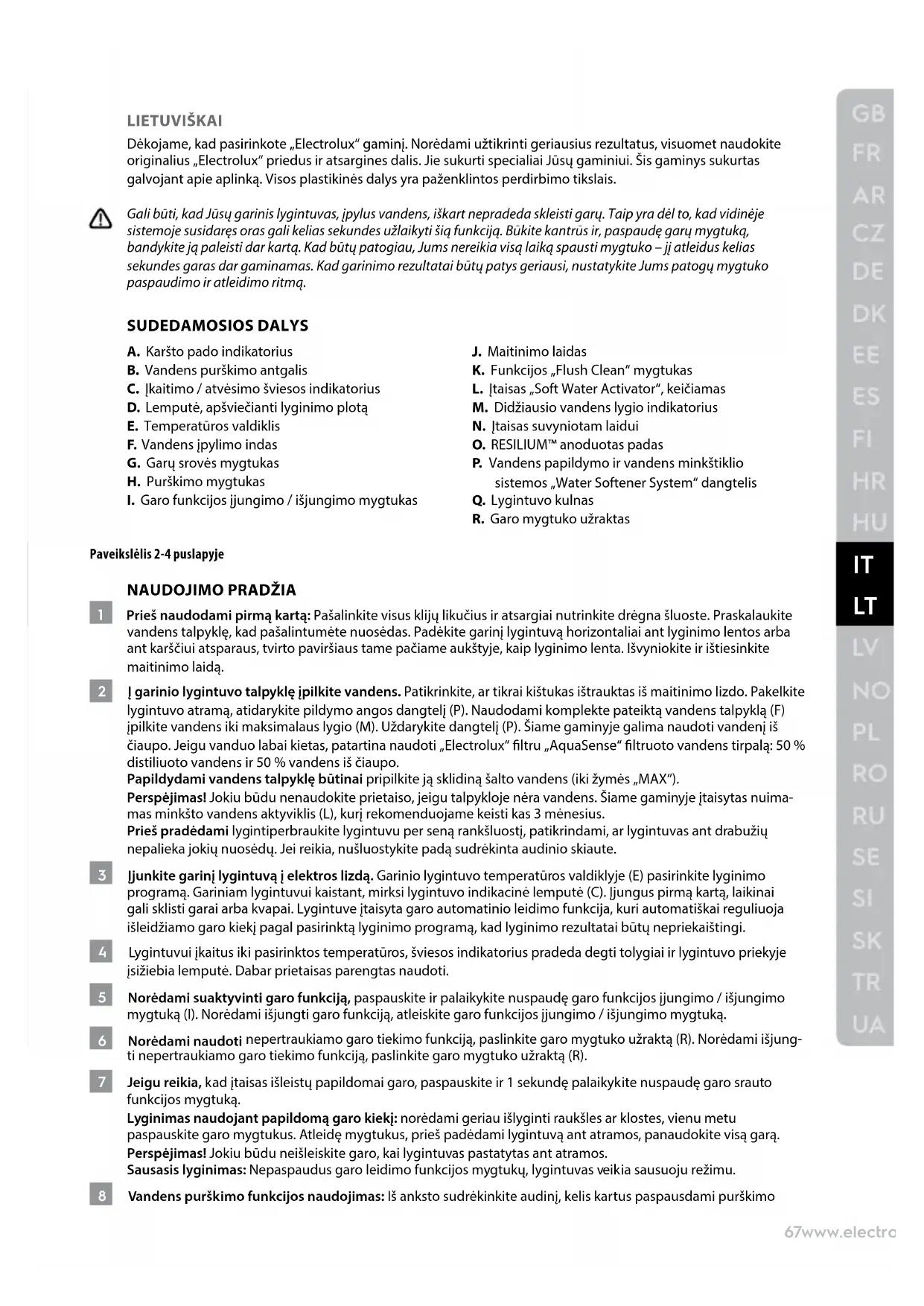 LIETUVIŠKAI Dėkojame, kad pasirinkote „Electrolux“ gaminį. Norėdami užtikrinti geriausius rezultatus, visuomet naudokite originalius „Electrolux“ priedus ir atsargines dalis. Jie sukurti specialiai Jūsų gaminiui. Šis gaminys sukurtas galvojant apie aplinką. Visos plastikinės dalys yra paženklintos perdirbimo tikslais. Gali būti, kad Jūsų garinis lygintuvas, įpylus vandens, iškart nepradeda skleisti garų. Taip yra dėl to, kad vidinėje sistemoje susidaręs oras gali kelias sekundes užlaikyti šią funkciją. Būkite kantrūs ir, paspaudę garų mygtuką, bandykite ją paleisti dar kartą. Kad būtų patogiau, Jums nereikia visą laiką spausti mygtuko – jį atleidus kelias sekundes garas dar gaminamas. Kad garinimo rezultatai būtų patys geriausi, nustatykite Jums patogų mygtuko paspaudimo ir atleidimo ritmą. SUDEDAMOSIOS DALYS A. Karšto pado indikatorius B. Vandens purškimo antgalis C. Įkaitimo / atvėsimo šviesos indikatorius D. Lemputė, apšviečianti lyginimo plotą E. Temperatūros valdiklis F. Vandens įpylimo indas G. Garų srovės mygtukas H. Purškimo mygtukas