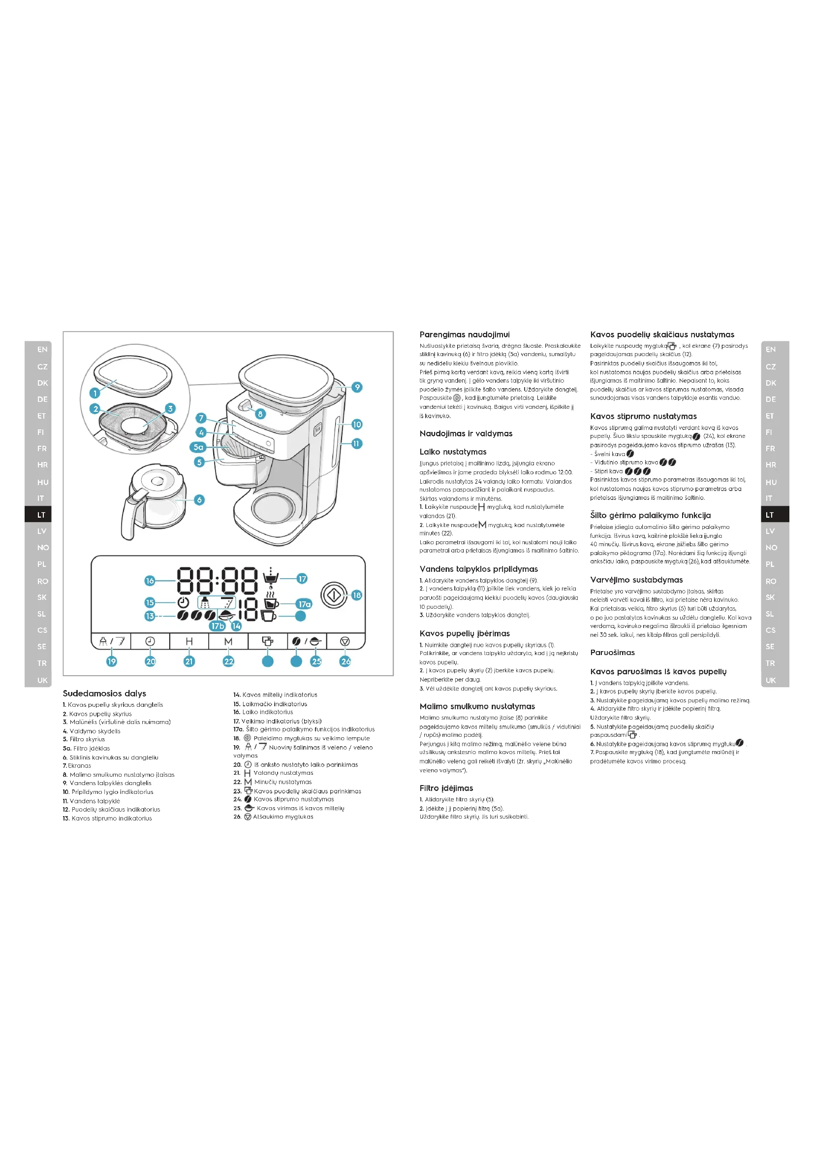 3. Jeigu ruošiate kavą iš kavos miltelių, paspauskite mygtuką prieš nustatydami laikmatį. Ekrane pasirodys simbolis (14). 4. Spauskite laikmačio mygtuką , kol ekrane pradės blyksėti laiko indikatorius (16). 5. Spauskite ir mygtukus, kad nustatytumėte pageidaujamą virimo pradžios laiką. Jeigu ruošiate kavą iš kavos pupelių, mygtuku (24) nustatykite pageidaujamą kavos stiprumą. 6. Norėdami suaktyvinti iš anksto nustatytą laiką, paleidimo mygtuką Paspauskite dar kartą. Ekrane pasirodys simbolis (15). Iš anksto nustatytas laikas suaktyvintas. Atėjus iš anksto nustatytam laikui, prietaisas įsijungia automatiškai. Veikimo lemputė įsižiebia ir ekrane pradeda blyksėti simbolis (17). Iš anksto nustatyto laiko pasyvinimas Norėdami pasyvinti iš anksto nustatyto laiko nuostatą, paspauskite CANCEL mygtuką (26). Simbolis (15) liaujasi šviesti ir programavimas pasyvinamas. Tačiau iš anksto nustatytas laikas išsaugomas ir jį galima iš naujo aktyvinti bet kada, kol suprogramuojamas naujas iš anksto nustatytas laikas arba prietaisas išjungiamas iš maitinimo šaltinio. Valymas ir priežiūra Prietaisui valyti nenaudokite toksinių, korozinių ar abrazyvinių valymo priemonių bei šiurkščių šveitimo kempinėlių. Šios priemonės gali pakenkti prietaiso paviršius. Kavos puodelių skaičiaus nustatymas Laikykite nuspaudę mygtuką , kol ekrane (7) pasirodys pageidaujamas puodelių skaičius (12).Pasirinktas puodelių skaičius išsaugomas iki tol, kol nustatomas naujas puodelių skaičius arba prietaisas išjungiamas iš maitinimo šaltinio. Nepaisant to, koks puodelių skaičius ar kavos stiprumas nustatomas, visada sunaudojamas visas vandens talpykloje esantis vanduo. Kavos stiprumo nustatymas Kavos stiprumą galima nustatyti verdant kavą iš kavos pupelių. Šiuo tikslu spauskite mygtuką (24), kol ekrane pasirodys pageidaujamo kavos stiprumo užrašas (13).- Švelni kava- Vidutinio stiprumo kava- Stipri kavaPasirinktas kavos stiprumo parametras išsaugomas iki tol, kol nustatomas naujas kavos stiprumo parametras arba prietaisas išjungiamas iš maitinimo šaltinio. Šilto gėrimo palaikymo funkcija Prietaise įdiegta automatinio šilto gėrimo palaikymo funkcija. Išvirus kavą, kaitrinė plokštė lieka įjungta 40 minučių. Išvirus kavą, ekrane įsižiebs šilto gėrimo palaikymo piktograma (17a). Norėdami šią funkciją išjungti anksčiau laiko, paspauskite mygtuką (26), kad atšauktumėte. Varvėjimo sustabdymas Prietaise yra varvėjimo sustabdymo įtaisas, skirtas neleisti varvėti kavai iš filtro, kai prietaise nėra kavinuko. Kai prietaisas veikia, filtro skyrius (5) turi būti uždarytas,o po juo pastatytas kavinukas su uždėtu dangteliu. Kol kava verdama, kavinuko negalima ištraukti iš prietaiso ilgesniam nei 30 sek. laikui, nes kitaip filtras gali persipildyti. Paruošimas Kavos paruošimas iš kavos pupelių 1. Į vandens talpyklą įpilkite vandens.2. Į kavos pupelių skyrių įberkite kavos pupelių. 3. Nustatykite pageidaujamą kavos pupelių malimo režimą.4. Atidarykite filtro skyrių ir įdėkite popierinį filtrą. Uždarykite filtro skyrių.5. Nustatykite pageidaujamą puodelių skaičių paspausdami .6. Nustatykite pageidaujamą kavos stiprumą mygtuku . 7. Paspauskite mygtuką (18), kad įjungtumėte malūnėlį ir pradėtumėte kavos virimo procesą. Sudedamosios dalys