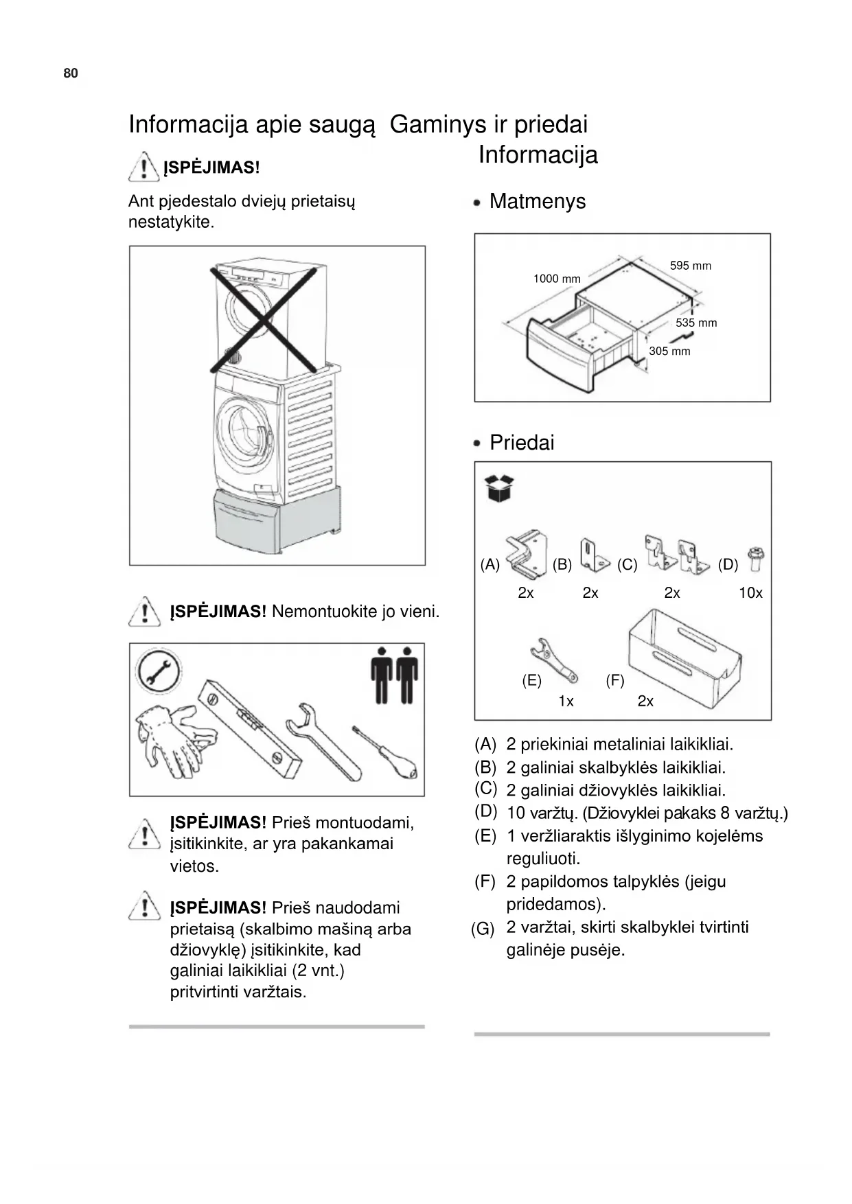 (A) (B) (C) (D) (E) (F) (G) 2 priekiniai metaliniai laikikliai. 2 galiniai skalbyklės laikikliai. 2 galiniai džiovyklės laikikliai. 10 varžtų. (Džiovyklei pakaks 8 varžtų.) 1 veržliaraktis išlyginimo kojelėms reguliuoti. 2 papildomos talpyklės (jeigu pridedamos). 2 varžtai, skirti skalbyklei tvirtinti galinėje pusėje.