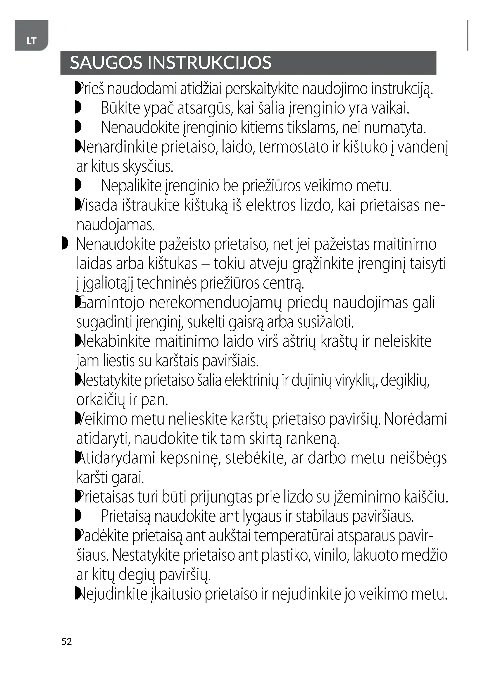 Prietaisas nėra skirtas naudoti su išoriniais laikmačiais arba atskira nuotolinio valdymo sistema. Prietaisas skirtas naudoti tik namuose.