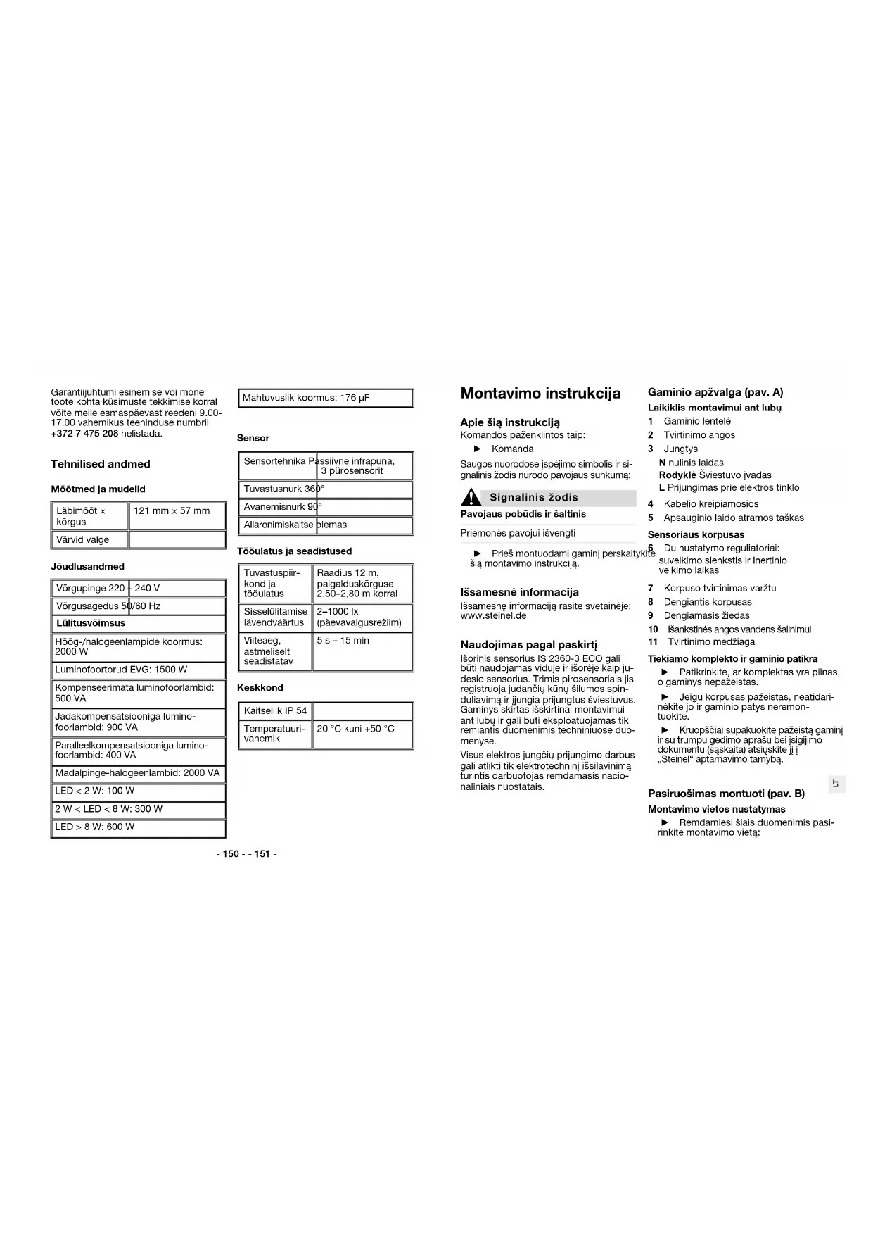 Signalinis žodis Pavojaus pobūdis ir šaltinis Priemonės pavojui išvengti ► Prieš montuodami gaminį perskaitykite šią montavimo instrukciją. Išsamesnė informacija Išsamesnę informaciją rasite svetainėje: www.steinel.de Naudojimas pagal paskirtį Išorinis sensorius IS 2360-3 ECO gali būti naudojamas viduje ir išorėje kaip ju- desio sensorius. Trimis pirosensoriais jis registruoja judančių kūnų šilumos spin- duliavimą ir įjungia prijungtus šviestuvus. Gaminys skirtas išskirtinai montavimui ant lubų ir gali būti eksploatuojamas tik remiantis duomenimis techniniuose duo- menyse. Visus elektros jungčių prijungimo darbus gali atlikti tik elektrotechninį išsilavinimą turintis darbuotojas remdamasis nacio- naliniais nuostatais. Gaminio apžvalga (pav. A) Laikiklis montavimui ant lubų 1 Gaminio lentelė 2 Tvirtinimo angos 3 Jungtys N nulinis laidas Rodyklė Šviestuvo įvadas LPrijungimas prie elektros tinklo 4 Kabelio kreipiamosios 5 Apsauginio laido atramos taškas Sensoriaus korpusas 6 Du nustatymo reguliatoriai: suveikimo slenkstis ir inertinio veikimo laikas 7 Korpuso tvirtinimas varžtu 8 Dengiantis korpusas 9 Dengiamasis žiedas 10 Išankstinės angos vandens šalinimui 11 Tvirtinimo medžiaga Tiekiamo komplekto ir gaminio patikra ► Patikrinkite, ar komplektas yra pilnas, o gaminys nepažeistas. ► Jeigu korpusas pažeistas, neatidari- nėkite jo ir gaminio patys neremon- tuokite. ► Kruopščiai supakuokite pažeistą gaminį ir su trumpu gedimo aprašu bei įsigijimo dokumentu (sąskaita) atsiųskite jį į „Steinel“ aptarnavimo tarnybą. Pasiruošimas montuoti (pav. B) Montavimo vietos nustatymas ► Remdamiesi šiais duomenimis pasi- rinkite montavimo vietą: Garantiijuhtumi esinemise või mõne toote kohta küsimuste tekkimise korral võite meile esmaspäevast reedeni 9.00-