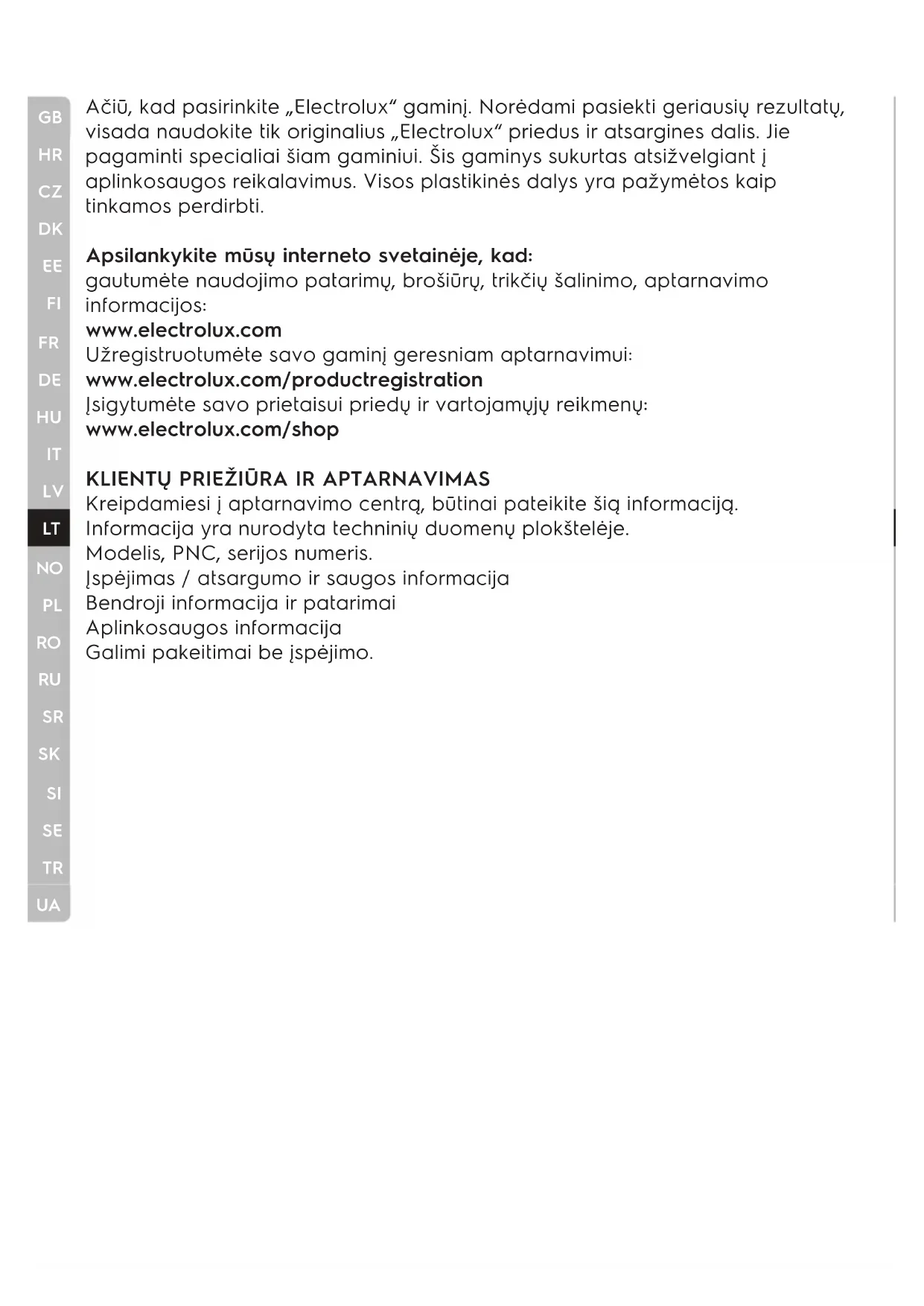 Ačiū, kad pasirinkite „Electrolux“ gaminį. Norėdami pasiekti geriausių rezultatų, visada naudokite tik originalius „Electrolux“ priedus ir atsargines dalis. Jie pagaminti specialiai šiam gaminiui. Šis gaminys sukurtas atsižvelgiant į aplinkosaugos reikalavimus. Visos plastikinės dalys yra pažymėtos kaip tinkamos perdirbti. Apsilankykite mūsų interneto svetainėje, kad: gautumėte naudojimo patarimų, brošiūrų, trikčių šalinimo, aptarnavimo informacijos: www.electrolux.com Užregistruotumėte savo gaminį geresniam aptarnavimui: www.electrolux.com/productregistration Įsigytumėte savo prietaisui priedų ir vartojamųjų reikmenų: www.electrolux.com/shop
