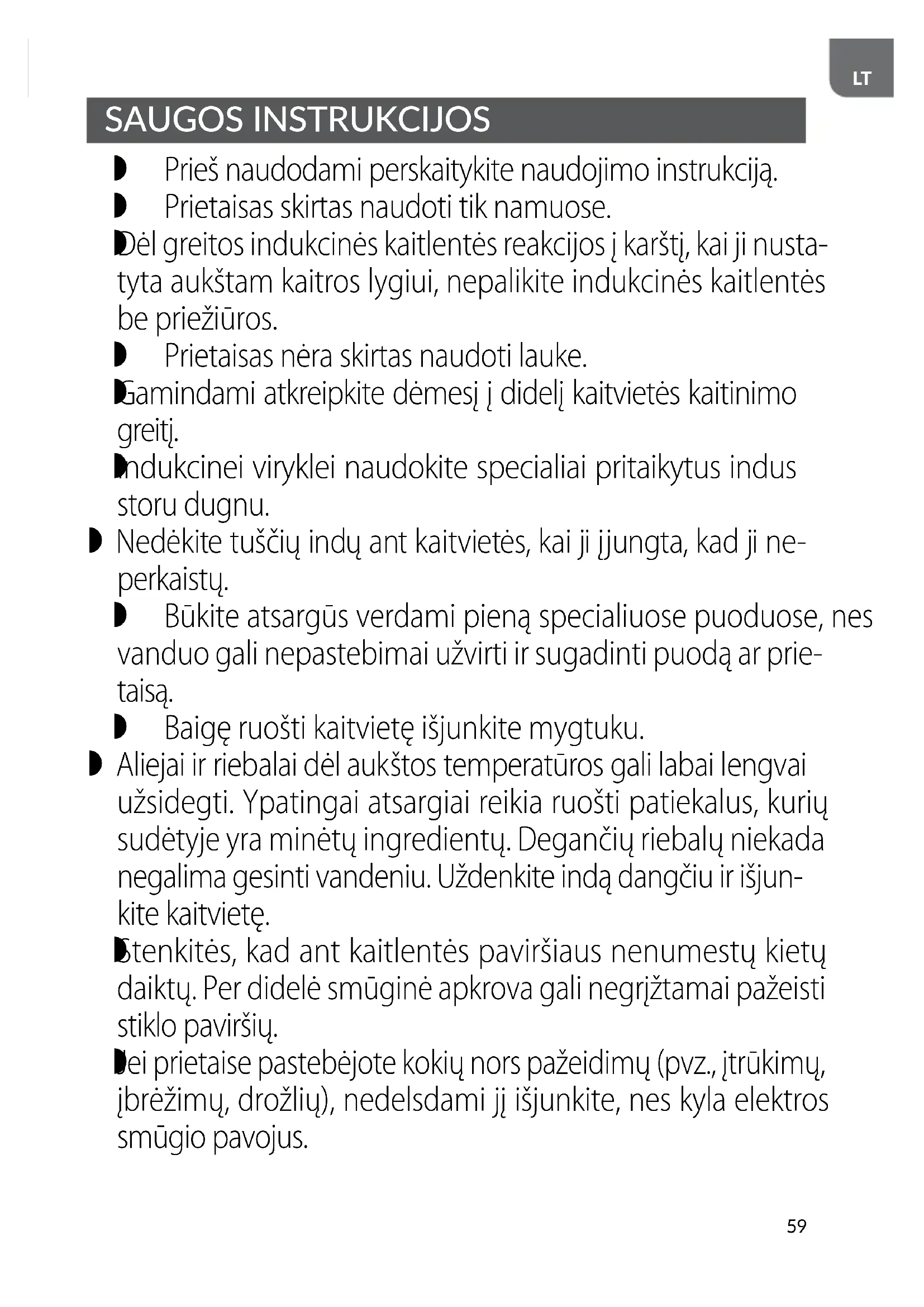 Dėl greitos indukcinės kaitlentės reakcijos į karštį, kai ji nusta- tyta aukštam kaitros lygiui, nepalikite indukcinės kaitlentės be priežiūros. Prietaisas nėra skirtas naudoti lauke.
