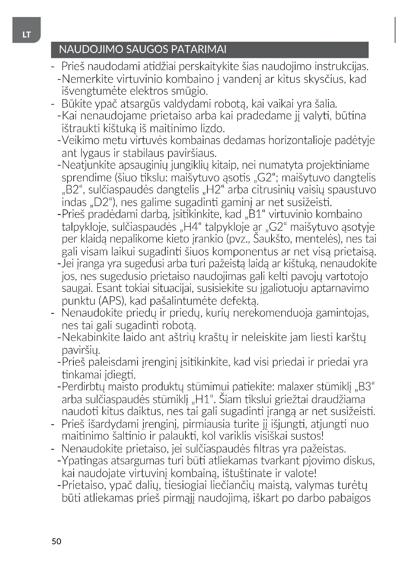 Prieš pradėdami darbą, įsikinkite, kad „B1“ virtuvinio kombaino talpykloje, sulčiaspaudės „H4“ talpykloje ar „G2“ maišytuvo ąsotyje per klaidą nepalikome kieto įrankio (pvz., Šaukšto, mentelės), nes tai gali visam laikui sugadin šiuos komponentus ar net visą prietaisą.