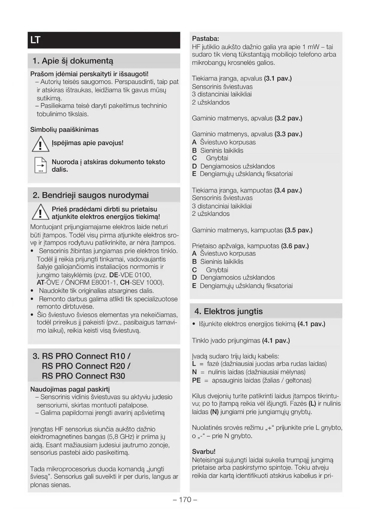 RS PRO Connect R20 / RS PRO Connect R30 Naudojimas pagal paskirtį – Sensorinis vidinis šviestuvas su aktyviu judesio sensoriumi, skirtas montuoti patalpose. – Galima papildomai įrengti avarinį apšvietimą Įrengtas HF sensorius siunčia aukšto dažnio elektromagnetines bangas (5,8 GHz) ir priima jų aidą. Esant mažiausiam judesiui jautrumo zonoje, sensorius pastebi aido pasikeitimą. Tada mikroprocesorius duoda komandą „jungti šviesą”. Sensorius gali suveikti ir per duris, langus ar plonas sienas. Pastaba: HF jutiklio aukšto dažnio galia yra apie 1 mW – tai sudaro tik vieną tūkstantąją mobiliojo telefono arba mikrobangų krosnelės galios. Tiekiama įranga, apvalus (3.1 pav.) Sensorinis šviestuvas 3 distanciniai laikikliai 2 užsklandos Gaminio matmenys, apvalus (3.2 pav.) Gaminio matmenys, apvalus (3.3 pav.) A Šviestuvo korpusas B Sieninis laikiklis C Gnybtai D Dengiamosios užsklandos E Dengiamųjų užsklandų fiksatoriai Tiekiama įranga, kampuotas (3.4 pav.) Sensorinis šviestuvas 3 distanciniai laikikliai 2 užsklandos Gaminio matmenys, kampuotas (3.5 pav.) Prietaiso apžvalga, kampuotas (3.6 pav.) A Šviestuvo korpusas B Sieninis laikiklis C Gnybtai D Dengiamosios užsklandos E Dengiamųjų užsklandų fiksatoriai