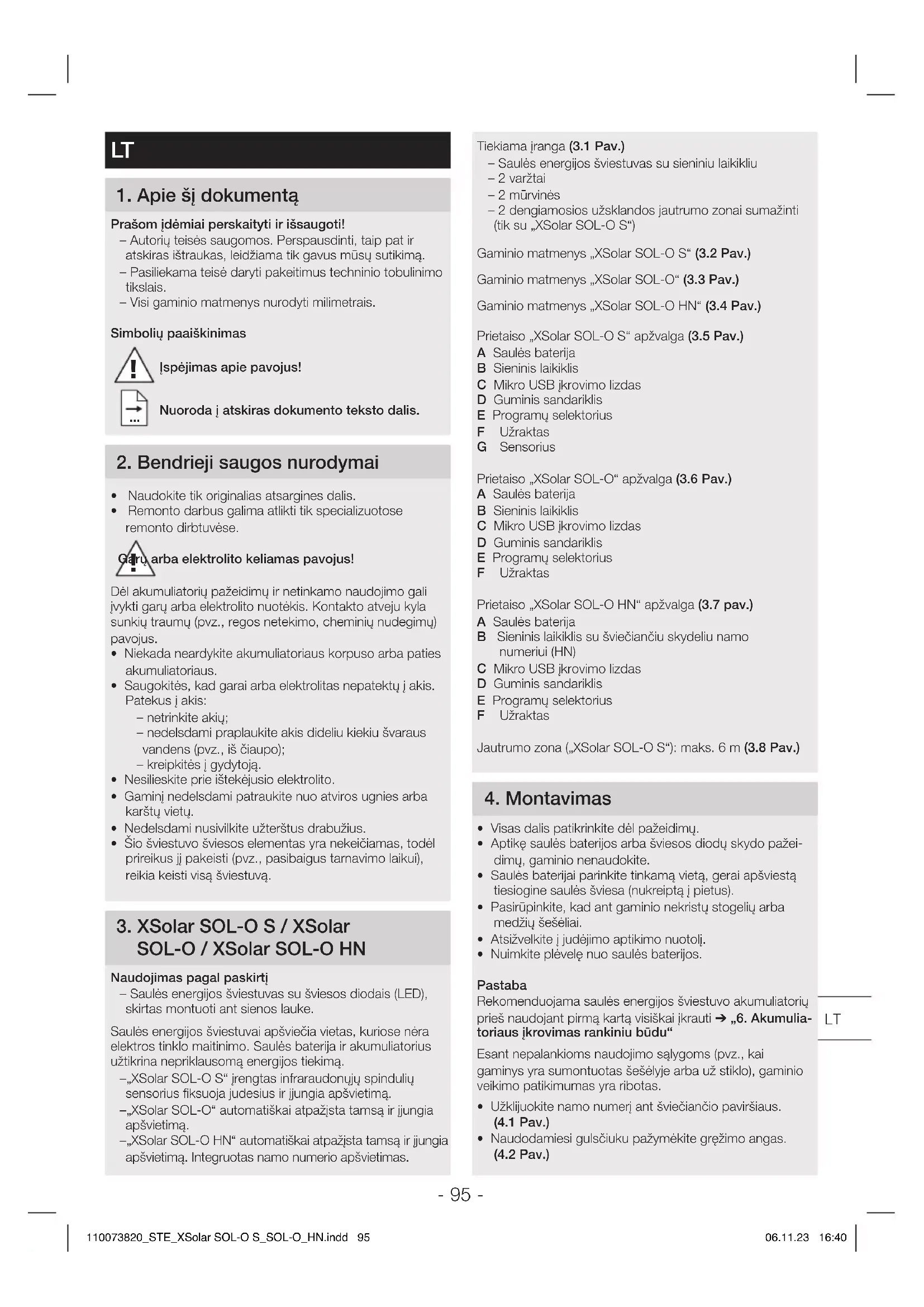 - saulės bateriją nuvalykite minkšta pašluoste ir silpnu valikliu. 110073820_STE_XSolar SOL-O S_SOL-O_HN.indd 96110073820_STE_XSolar SOL-O S_SOL-O_HN.indd 96 06.11.23 16:4006.11.23 16:40- 97 - 8 Šalinimas Elektros prietaisai, priedai ir pakuotės turi būti perdirbami aplinkai nekenksmingu būdu. Neišmeskite elektros prietaisų kartu su buitinėmis atliekomis!Tik ES šalimsRemiantis galiojančia Europos Sąjungos Direktyva dėl elektros ir elektronikos įrangos atliekų ir jos perkėlimo į nacionalinę teisę, nebetinkami naudoti elektros prietaisai turi būti renkami atskirai ir perdirbami aplinkai nekenksmin-gu būdu. Senų prietaisų, akumuliatorių ar baterijų nemeskite į buitinių atliekų konteinerį, ugnį arba vandenį. Akumuliatorius ir baterijas reikia surinkti, perdirbti arba pašalinti aplinkai nekenksmingu būdu.Tik ES šalimsPagal Direktyvą 2006/66/EB, sugedusius arba netinkamus naudoti akumuliatorius ir baterijas būtina perdirbti. Nebetinkamus naudoti akumuliatorius ar baterijas galima grąžinti pardavėjui arba priduoti į kenksmingų atliekų surinkimo vietą. 9 Gamintojo garantija Gamintojo garantija STEINEL GmbH, Dieselstraße 80-84, DE-33442 Herzebrock-Clarholz, VokietijaŠis „Steinel“ produktas pagamintas itin kruopščiai, pagal galiojančias normas patikrintos jo funkcijos ir saugumas bei papildomai atlikta pasirinktų prietaisų patikra. „Steinel“ suteikia prietaisui garantiją. Garantinis laikotarpis – 36mė-nesiai. Jis skaičiuojamas nuo prietaiso pardavimo vartotojui dienos. Mes pašalinsime defektus, susijusius su medžiagų arba gamybos broku; garantiniu laikotarpiu, mūsų nuožiūra, prietaisas nemokamai remontuojamas arba keičiamos sugedusios dalys. Garantija netaikoma susidėvinčioms dalims, taip pat jei prietaisas sugenda dėl netinkamo naudojimo arba netinkamos priežiūros. Kitiems daiktams padaryta žala neatlyginama. Garantija taikoma tik tuo atveju, jei neišar-dytas prietaisas kartu su trumpu gedimo aprašymu, kasos čekiu arba sąskaita (pirkimo data ir pardavėjo antspaudu), tinkamai supakuotas atsiunčiamas į atitinkamą techninės priežiūros tarnybos vietą. Remontas: pasibaigus garantinio aptarnavimo laikotarpiui arba esant gedimams, kuriems garantinė priežiūra negalioja, dėl remonto galimybių teiraukitės arti-miausiame aptarnavimo centre. 10 Techniniai duomenys Techniniai saulės energijos šviestuvo duomenys XSolarSOL-OS XSolarSOL-O XSolarSOL-OHN Matmenys (PxAxGmm) 242×53×91 242×38×91 242×183×91Galingumas maks.3,3W maks.0,1W maks.0,1WApimties kampas 360° - -Jautrumo zona maks.6m - -Prieblandos lygio nustatymas 2liuksai Švietimo trukmės nustatymas 10 – 30sek.automatiškai - - Naktinis apšvietimas 3% - - Šviesos srautas maks.273lm maks.7,5lm maks.7,5lm Efektyvumas 83lm/W 75lm/W 75lm/W Spalvinė temperatūra 3.000K LED tarnavimo trukmė 50.000hSaugos klasė IP44Apsaugos klasė IIITemperatūros diapazonas nuo-20°Ciki+40°CAkumuliatoriaus techniniai duomenys XSolarSOL-OS XSolarSOL-O XSolarSOL-OHNTipas Ličio geležies fosfatas (LiFePO4)Talpa 2×2.000mAH 2.000mAH 2.000mAHMaks. tarnavimo trukmė 20dienų, esant 20perjungimų per naktį.Mikro USB įkrovimo lizdas 5V,maks.1A GAMINTOJO