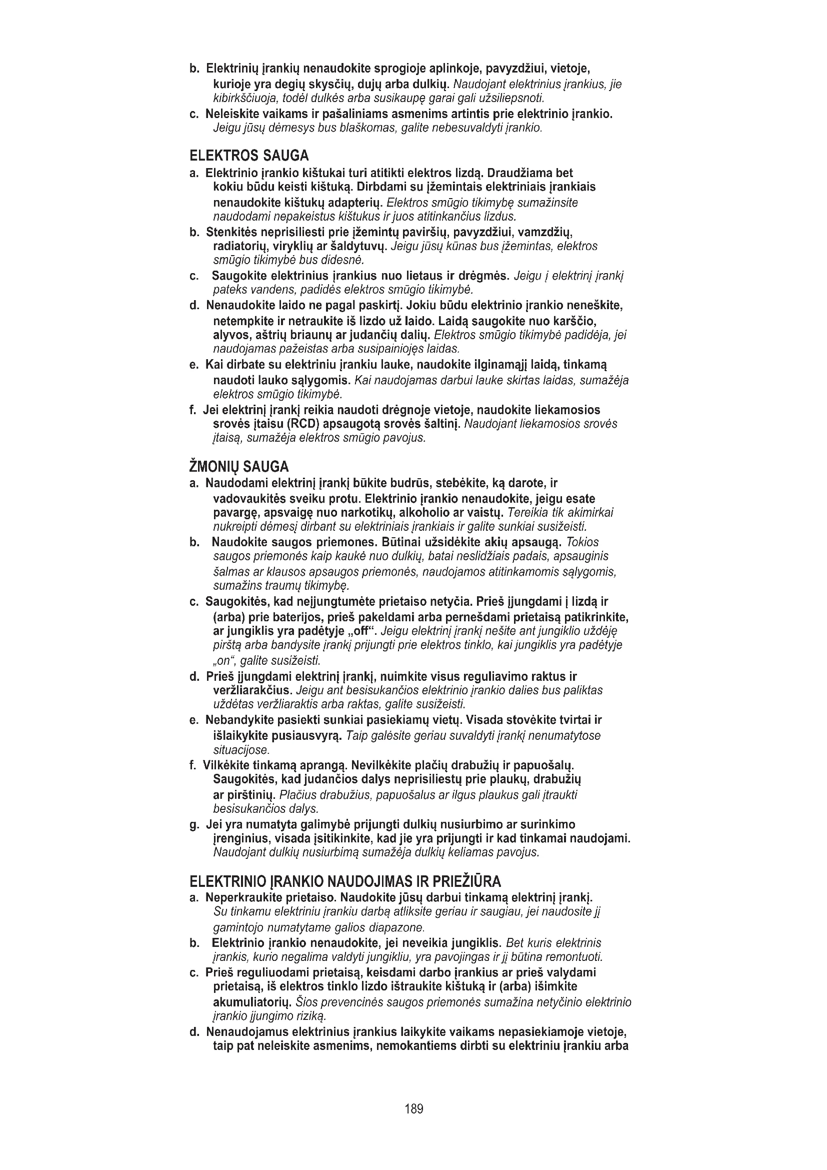 a. Naudokite elektrinius įrankius tik su specialiai jiems sukurtais akumuliatoriais. Jei naudosite kitus akumuliatorius, yra rizika apsideginti arba kitaip susižeisti. b. Kai akumuliatorius nenaudojamas, jį laikykite toliau nuo kitų metalinių objektų, pvz.: popieriaus segtukų, monetų, vinių, varžtų arba kitų objektų, galinčių sujungti vieną terminalą su kitu. Jei įvyksta dviejų terminalų trumpinimas, galite apsideginti arba susižeisti. c. Išskirtinėmis aplinkybėmis iš akumuliatoriaus gali išbėgti skystis, todėl venkite prie jo prisiliesti. Jei įvyko nelaimingas atsitikimas, nuplaukite skystį vandeniu. Jei skysčio patenka į akis, kreipkitės į mediką. Iš akumuliatoriaus išbėgęs skystis gali sudirginti arba nudeginti akis. TECHNINIS APTARNAVIMAS a. Jūsų elekrinio įrankio techninę priežiūrą atlikti turi kvalikuotas asmuo, naudodamas tik identiškas atsargines dalis. Taip galima garantuoti, jog elektrinis įrankis išliks saugus naudoti.