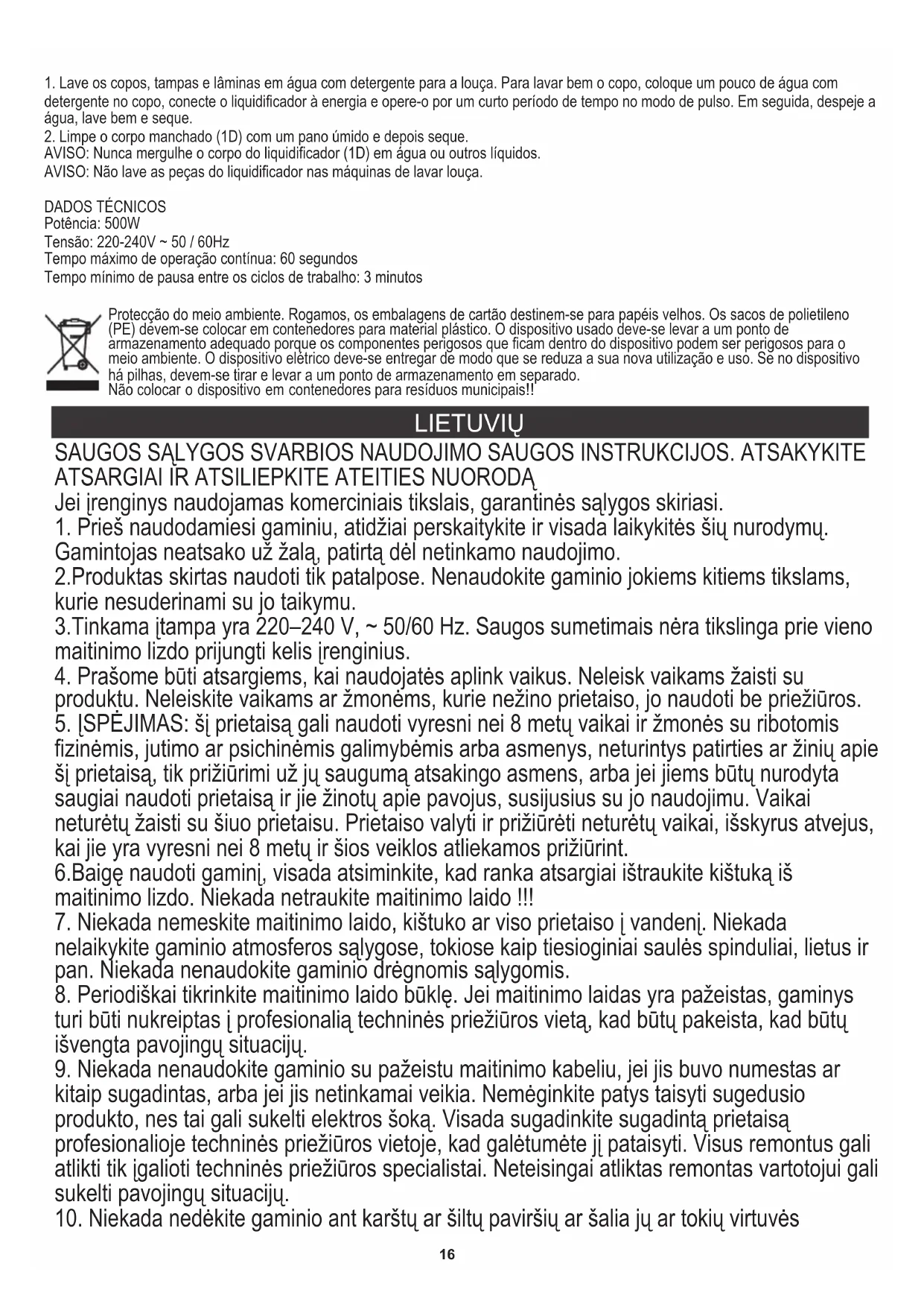 PASTABA: Niekada nemerkite maišytuvo korpuso (1D) į vandenį ar kitus skysčius. PASTABA: pulsavimo režimas: paspaudus mygtuką „Pulse“ (2A), maišytuvas staiga pradeda maišytis maksimaliu greičiu. TECHNINIAI DUOMENYS PASTABA: neleiskite maišytuvui nepertraukiamai veikti ilgiau nei 60 sekundžių. Maksimalus nepertraukiamo veikimo laikas: 60 sekundžių 1. Puodelius, dangtelius ir geležtes nuplaukite vandeniu su plovimo skysčiu. Norėdami kruopščiai nuplauti puodelį, į puodelį įpilkite šiek tiek vandens su skalbimo skysčiu, prijunkite maišytuvą prie maitinimo šaltinio ir trumpą laiką dirbkite impulsiniu režimu. Tada išpilkite vandenį, gerai nuplaukite ir nusausinkite. Įtampa: 220–240 V ~ 50/60 Hz 8. Po to, kai sumaišyti produktai bus pakankamai vienodi, išjunkite maišytuvą, atleisdami mygtuką „Pulse“ (2A) arba sukdami greičio reguliavimo rankenėlę (1E) į „off“ padėtį (2B). Palaukite, kol ašmenys sustos. Ištraukite maitinimo kištuką iš maitinimo lizdo. Nuimkite puodelį. Šis maišytuvo indas netinka šlifavimui. Galia: 500W SAUGA Įsitikinkite, kad maišytuvas atjungtas nuo maitinimo. Minimalus pertraukos laikas tarp darbo ciklų: 3 minutės Blenderyje yra du apsauginiai jungikliai. Vienas maišytuvo rankenoje, o antrasis maišytuvo bazėje. Visada patikrinkite, ar dangtelis (1B) ir puodelis (1C) yra tinkamai pastatyti ant maišytuvo puodelio (1G) ir korpuso (1D). Jei ne, maišytuvas nepradės veikti. Maišymo metu atidarius dangtį (1B) mašina nustos veikti. Jei maišytuvas perkrautas, variklis nustos veikti. Palaukite apie 45 minutes, kol variklis atvės. Rūpinantis aplinka. Kartono pakuotes atiduoti į makulatūrą. Polietileno (PE) maišelius mesti į plastikui skirtą konteinerį. Susidėvėjusį prietaisą atiduoti į atitinkamą atliekų surinkimo vietą, nes prietaise esančios pavojingos medžiagos gali kelti grėsmę aplinkai. Elektrinį prietaisą atiduoti tokį, kad nebūtų galima jo pakartotinai naudoti ir panaudoti. Jeigu prietaise yra baterijos, būtina jas išimti ir atskirai atiduoti į atliekų surinkimo vietą. Nemesti prietaiso į buitinių atliekų konteinerį! LATVIEŠU