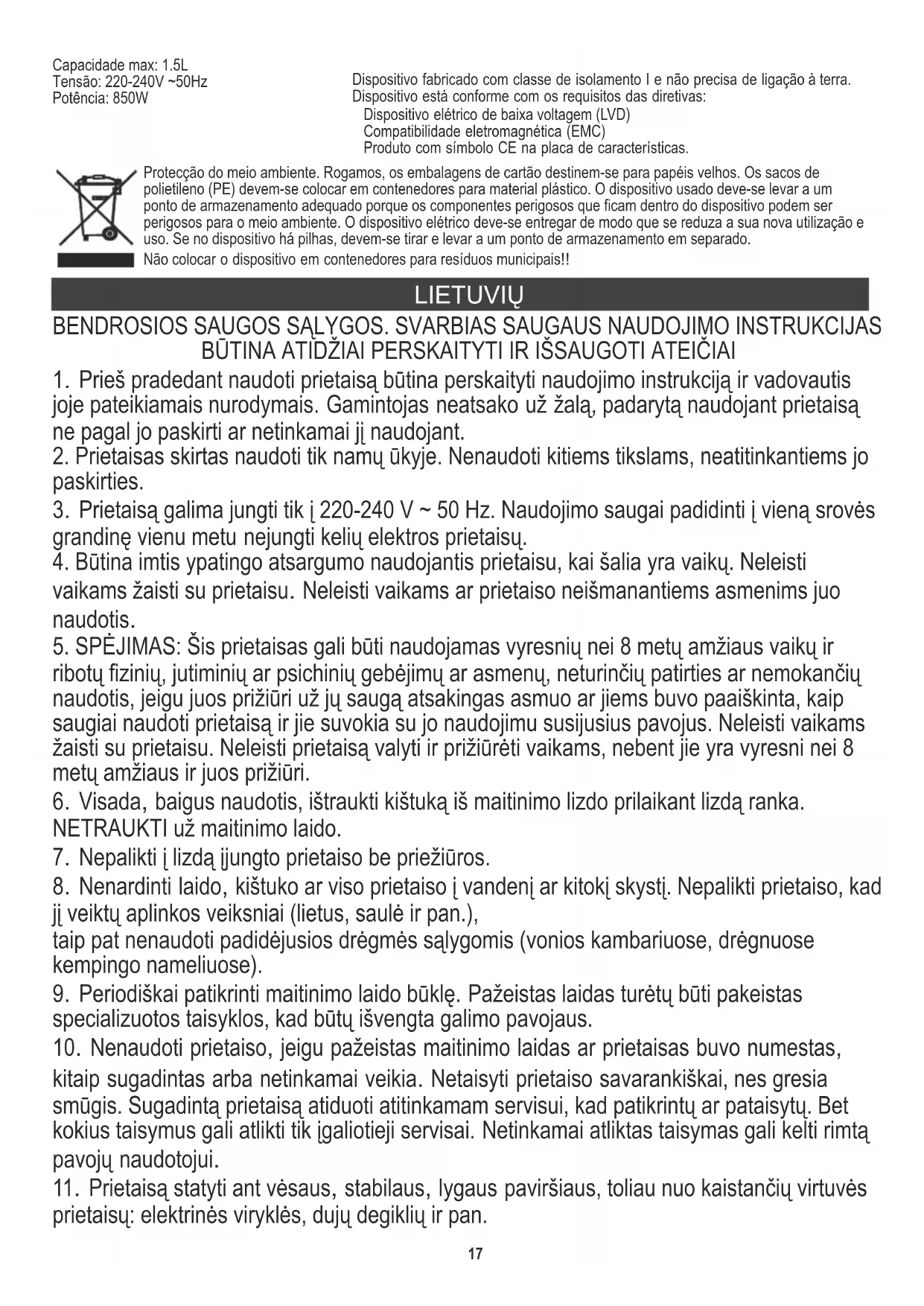 Rūpinantis aplinka. Kartono pakuotes atiduoti į makulatūrą. Polietileno (PE) maišelius mesti į plastikui skirtą konteinerį. Susidėvėjusį prietaisą atiduoti į atitinkamą atliekų surinkimo vietą, nes prietaise esančios pavojingos medžiagos gali kelti grėsmę aplinkai. Elektrinį prietaisą atiduoti tokį, kad nebūtų galima jo pakartotinai naudoti ir panaudoti. Jeigu prietaise yra baterijos, būtina jas išimti ir atskirai atiduoti į atliekų surinkimo vietą. Nemesti prietaiso į buitinių atliekų konteinerį! Prietaisas yra I izoliacijos klasės ir būtina jį įžeminti. Prietaisas atitinka direktyvų reikalavimus: Elektrinis žemos įtampos prietaisas (LVD) Elektromagnetinis suderinamumas (EMC) Prietaisas turi CE ženklą vardinėje lentelėje. LATVIEŠU VISPĀRĪGI DROŠĪBAS NOTEIKUMI. SVARĪGI DROŠAS IZMANTOŠANAS NORĀDĪJUMI. LŪDZU, UZMANĪGI IZLASIET UN SAGLABĀJIET