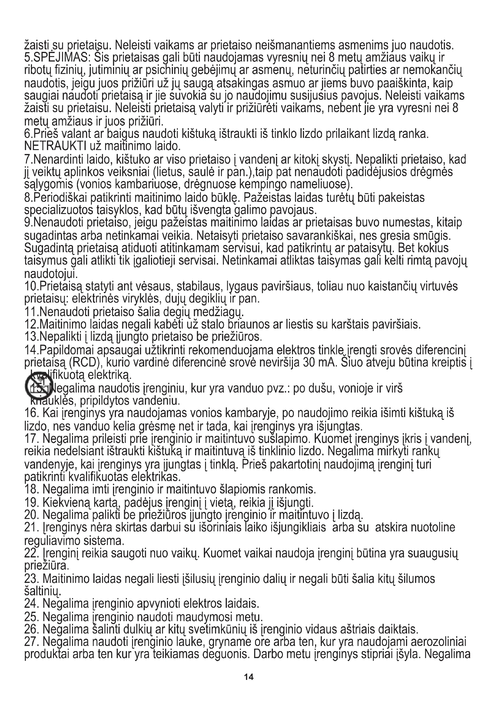 kriauklės, pripildytos vandeniu. 14.Papildomai apsaugai užtikrinti rekomenduojama elektros tinkle įrengti srovės diferencinį prietaisą (RCD), kurio vardinė diferencinė srovė neviršija 30 mA. Šiuo atveju būtina kreiptis į kvalifikuotą elektriką. 13.Nepalikti į lizdą įjungto prietaiso be priežiūros. 12.Maitinimo laidas negali kabėti už stalo briaunos ar liestis su karštais paviršiais. 11.Nenaudoti prietaiso šalia degių medžiagų. 10.Prietaisą statyti ant vėsaus, stabilaus, lygaus paviršiaus, toliau nuo kaistančių virtuvės prietaisų: elektrinės viryklės, dujų degiklių ir pan. 9.Nenaudoti prietaiso, jeigu pažeistas maitinimo laidas ar prietaisas buvo numestas, kitaip sugadintas arba netinkamai veikia. Netaisyti prietaiso savarankiškai, nes gresia smūgis. Sugadintą prietaisą atiduoti atitinkamam servisui, kad patikrintų ar pataisytų. Bet kokius taisymus gali atlikti tik įgaliotieji servisai. Netinkamai atliktas taisymas gali kelti rimtą pavojų naudotojui. 8.Periodiškai patikrinti maitinimo laido būklę. Pažeistas laidas turėtų būti pakeistas specializuotos taisyklos, kad būtų išvengta galimo pavojaus. 7.Nenardinti laido, kištuko ar viso prietaiso į vandenį ar kitokį skystį. Nepalikti prietaiso, kad jį veiktų aplinkos veiksniai (lietus, saulė ir pan.),taip pat nenaudoti padidėjusios drėgmės sąlygomis (vonios kambariuose, drėgnuose kempingo nameliuose). 6.Prieš valant ar baigus naudoti kištuką ištraukti iš tinklo lizdo prilaikant lizdą ranka. NETRAUKTI už maitinimo laido. 5.SPĖJIMAS: Šis prietaisas gali būti naudojamas vyresnių nei 8 metų amžiaus vaikų ir ribotų fizinių, jutiminių ar psichinių gebėjimų ar asmenų, neturinčių patirties ar nemokančių naudotis, jeigu juos prižiūri už jų saugą atsakingas asmuo ar jiems buvo paaiškinta, kaip saugiai naudoti prietaisą ir jie suvokia su jo naudojimu susijusius pavojus. Neleisti vaikams žaisti su prietaisu. Neleisti prietaisą valyti ir prižiūrėti vaikams, nebent jie yra vyresni nei 8 metų amžiaus ir juos prižiūri. žaisti su prietaisu. Neleisti vaikams ar prietaiso neišmanantiems asmenims juo naudotis.