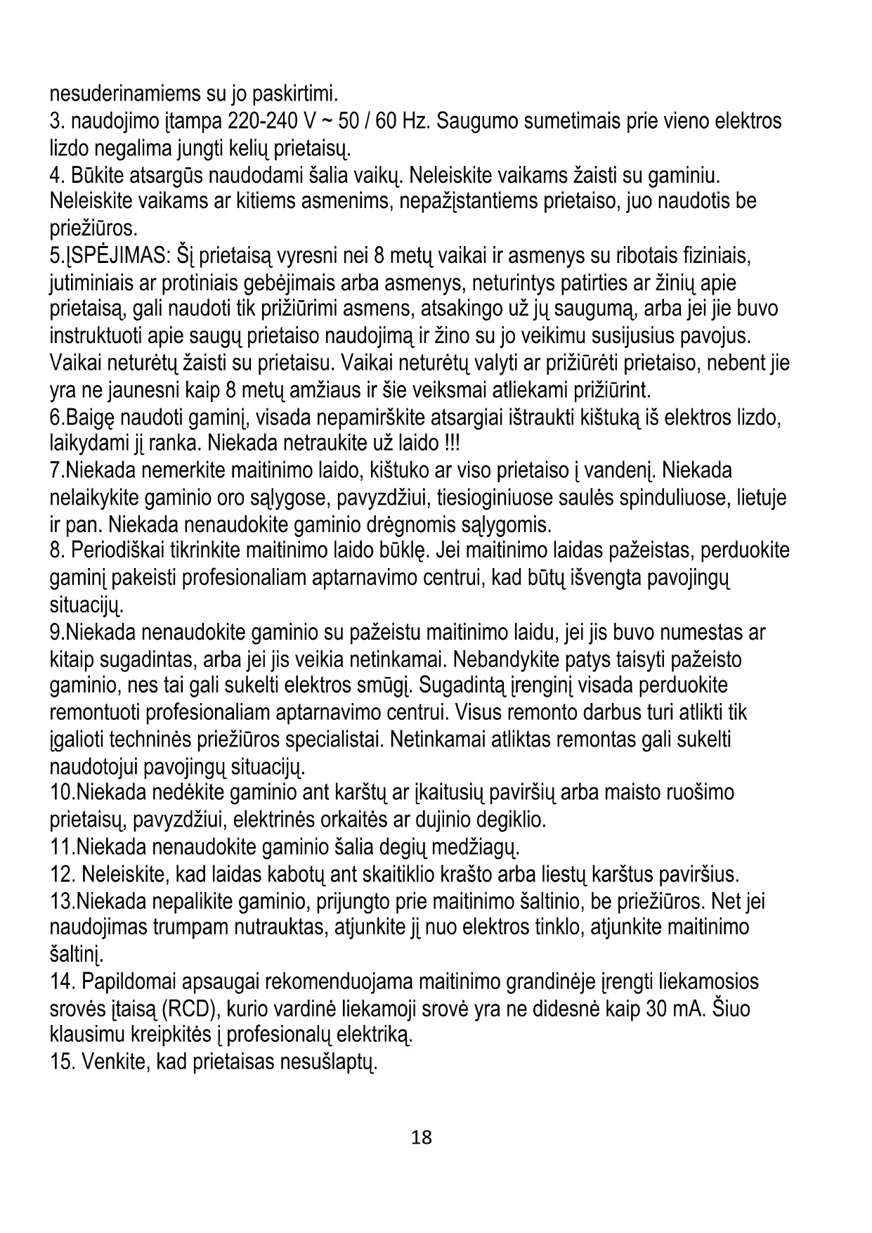 Neleiskite vaikams ar kitiems asmenims, nepažįstantiems prietaiso, juo naudotis be priežiūros. 5.ĮSPĖJIMAS: Šį prietaisą vyresni nei 8 metų vaikai ir asmenys su ribotais fiziniais, jutiminiais ar protiniais gebėjimais arba asmenys, neturintys patirties ar žinių apie prietaisą, gali naudoti tik prižiūrimi asmens, atsakingo už jų saugumą, arba jei jie buvo instruktuoti apie saugų prietaiso naudojimą ir žino su jo veikimu susijusius pavojus. Vaikai neturėtų žaisti su prietaisu. Vaikai neturėtų valyti ar prižiūrėti prietaiso, nebent jie yra ne jaunesni kaip 8 metų amžiaus ir šie veiksmai atliekami prižiūrint. 6.Baigę naudoti gaminį, visada nepamirškite atsargiai ištraukti kištuką iš elektros lizdo, laikydami jį ranka. Niekada netraukite už laido !!! 7.Niekada nemerkite maitinimo laido, kištuko ar viso prietaiso į vandenį. Niekada nelaikykite gaminio oro sąlygose, pavyzdžiui, tiesioginiuose saulės spinduliuose, lietuje ir pan. Niekada nenaudokite gaminio drėgnomis sąlygomis.