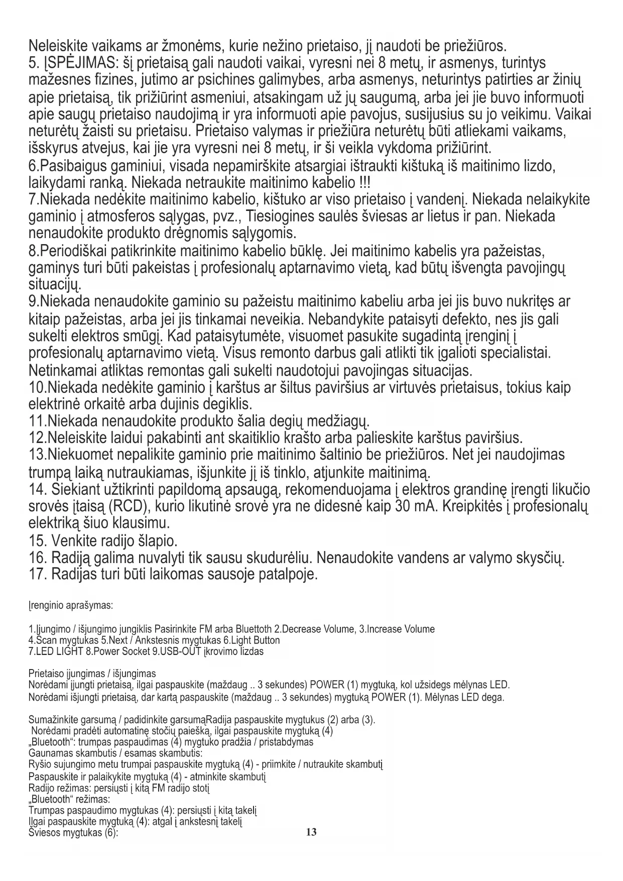 Įrenginio aprašymas: 1.Įjungimo / išjungimo jungiklis Pasirinkite FM arba Bluettoth 2.Decrease Volume, 3.Increase Volume 4.Scan mygtukas 5.Next / Ankstesnis mygtukas 6.Light Button 7.LED LIGHT 8.Power Socket 9.USB-OUT įkrovimo lizdas Prietaiso įjungimas / išjungimas Norėdami įjungti prietaisą, ilgai paspauskite (maždaug .. 3 sekundes) POWER (1) mygtuką, kol užsidegs mėlynas LED. Norėdami išjungti prietaisą, dar kartą paspauskite (maždaug .. 3 sekundes) mygtuką POWER (1). Mėlynas LED dega. Sumažinkite garsumą / padidinkite garsumąRadija paspauskite mygtukus (2) arba (3). Norėdami pradėti automatinę stočių paiešką, ilgai paspauskite mygtuką (4) „Bluetooth“: trumpas paspaudimas (4) mygtuko pradžia / pristabdymas Gaunamas skambutis / esamas skambutis: Ryšio sujungimo metu trumpai paspauskite mygtuką (4) - priimkite / nutraukite skambutį Paspauskite ir palaikykite mygtuką (4) - atminkite skambutį Radijo režimas: persiųsti į kitą FM radijo stotį „Bluetooth“ režimas: Trumpas paspaudimo mygtukas (4): persiųsti į kitą takelį Ilgai paspauskite mygtuką (4): atgal į ankstesnį takelį Šviesos mygtukas (6): 13Pirmas paspaudimas - ilgas paspaudimas (apytiksliai 3 sekundės), kad įjungtumėte šviesos funkcijos šviesą, mirksės 3 kartus. Jei kambarys yra pakankamai ryškus, šviesa bus išjungta. Jei kambarys yra tamsus, šviesa įsijungs automatiškai. Antrasis paspaudimas - ilgas paspaudimas (maždaug 3 sekundės), šviesa mirksi 3 kartus ir šviesa įsijungs 3. paspaudimas - ilgas paspaudimas (apytiksliai 3 sekundės), lemputė išsijungs.LED LightPower socketUSB-OUT CHARGE įkrovimo lizdas BLUETOOTH JUNGTIS Galite atkurti muzikos failus, išsaugotus mobiliajame telefone su „Bluetooth“, kad galėtumėte atkurti maitinimo lizdo radiją.