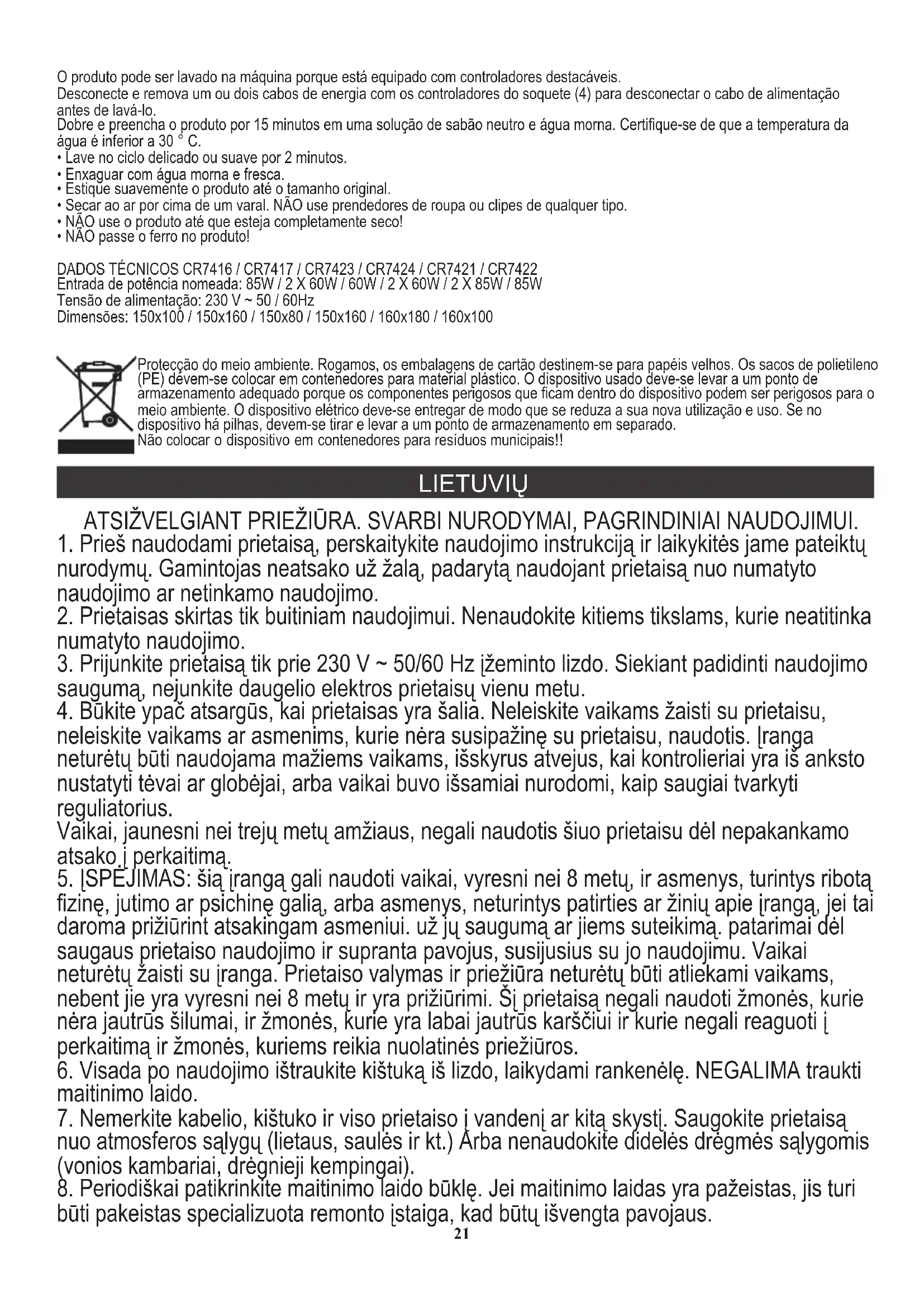- NEGALIMA geležies gaminio! TECHNINIAI DUOMENYS CR7416 / CR7417 / CR7423 / CR7424 / CR7421 / CR7422 Nominali galia: 85W / 2 X 60W / 60W / 2 X 60W / 2 X 85W / 85W Maitinimo įtampa: 230 V ~ 50 / 60Hz Matmenys: 150x100 / 150x160 / 150x80 / 150x160 / 160x180 / 160x100 Rūpinantis aplinka. Kartono pakuotes atiduoti į makulatūrą. Polietileno (PE) maišelius mesti į plastikui skirtą konteinerį. Susidėvėjusį prietaisą atiduoti į atitinkamą atliekų surinkimo vietą, nes prietaise esančios pavojingos medžiagos gali kelti grėsmę aplinkai. Elektrinį prietaisą atiduoti tokį, kad nebūtų galima jo pakartotinai naudoti ir panaudoti. Jeigu prietaise yra baterijos, būtina jas išimti ir atskirai atiduoti į atliekų surinkimo vietą. Nemesti prietaiso į buitinių atliekų konteinerį! 23LIETUVIŲ LATVIEŠU LŪDZU LŪDZAM UZMANĪGI. SVARĪGI NORĀDĪJUMI, NEPIECIEŠAMS LIETOŠANAI.