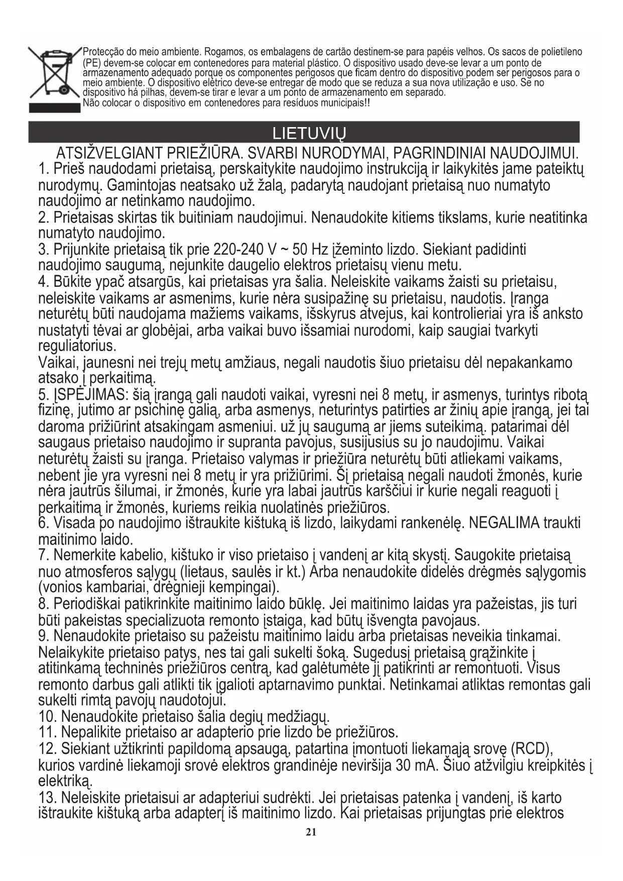 13. Neleiskite prietaisui ar adapteriui sudrėkti. Jei prietaisas patenka į vandenį, iš karto