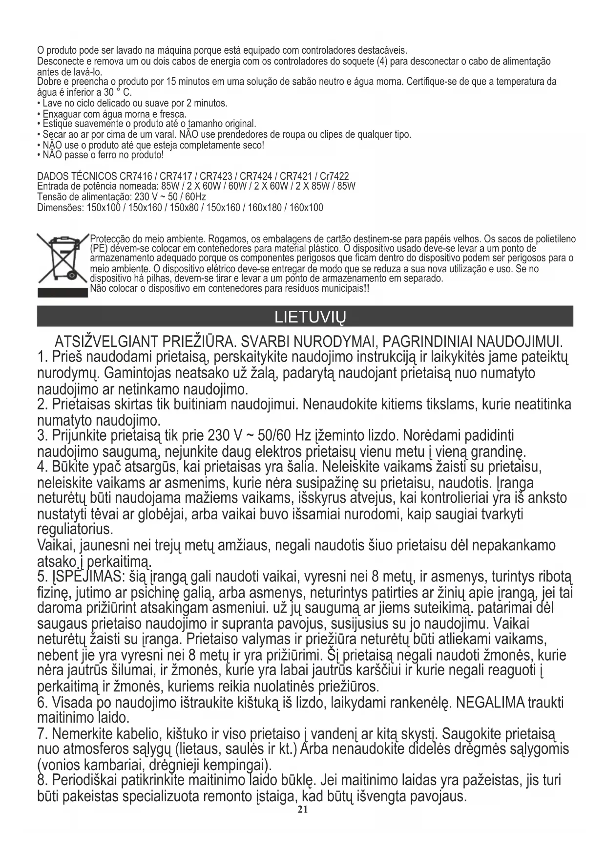 - NEGALIMA geležies gaminio! TECHNINIAI DUOMENYS CR7416 / CR7417 / CR7423 / CR7424 / CR7421 / Cr7422 Nominali galia: 85W / 2 X 60W / 60W / 2 X 60W / 2 X 85W / 85W Maitinimo įtampa: 230 V ~ 50 / 60Hz Matmenys: 150x100 / 150x160 / 150x80 / 150x160 / 160x180 / 160x100 Rūpinantis aplinka. Kartono pakuotes atiduoti į makulatūrą. Polietileno (PE) maišelius mesti į plastikui skirtą konteinerį. Susidėvėjusį prietaisą atiduoti į atitinkamą atliekų surinkimo vietą, nes prietaise esančios pavojingos medžiagos gali kelti grėsmę aplinkai. Elektrinį prietaisą atiduoti tokį, kad nebūtų galima jo pakartotinai naudoti ir panaudoti. Jeigu prietaise yra baterijos, būtina jas išimti ir atskirai atiduoti į atliekų surinkimo vietą. Nemesti prietaiso į buitinių atliekų konteinerį! 23LIETUVIŲ LATVIEŠU LŪDZU LŪDZAM UZMANĪGI. SVARĪGI NORĀDĪJUMI, NEPIECIEŠAMS LIETOŠANAI.