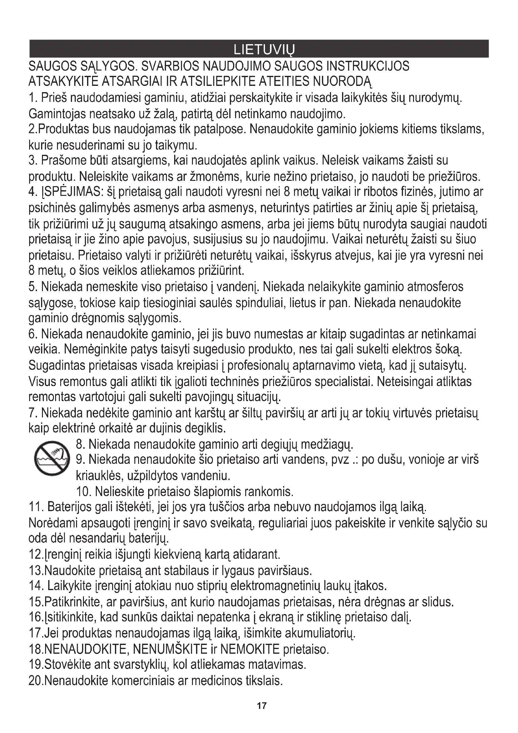 9. Niekada nenaudokite šio prietaiso arti vandens, pvz .: po dušu, vonioje ar virš