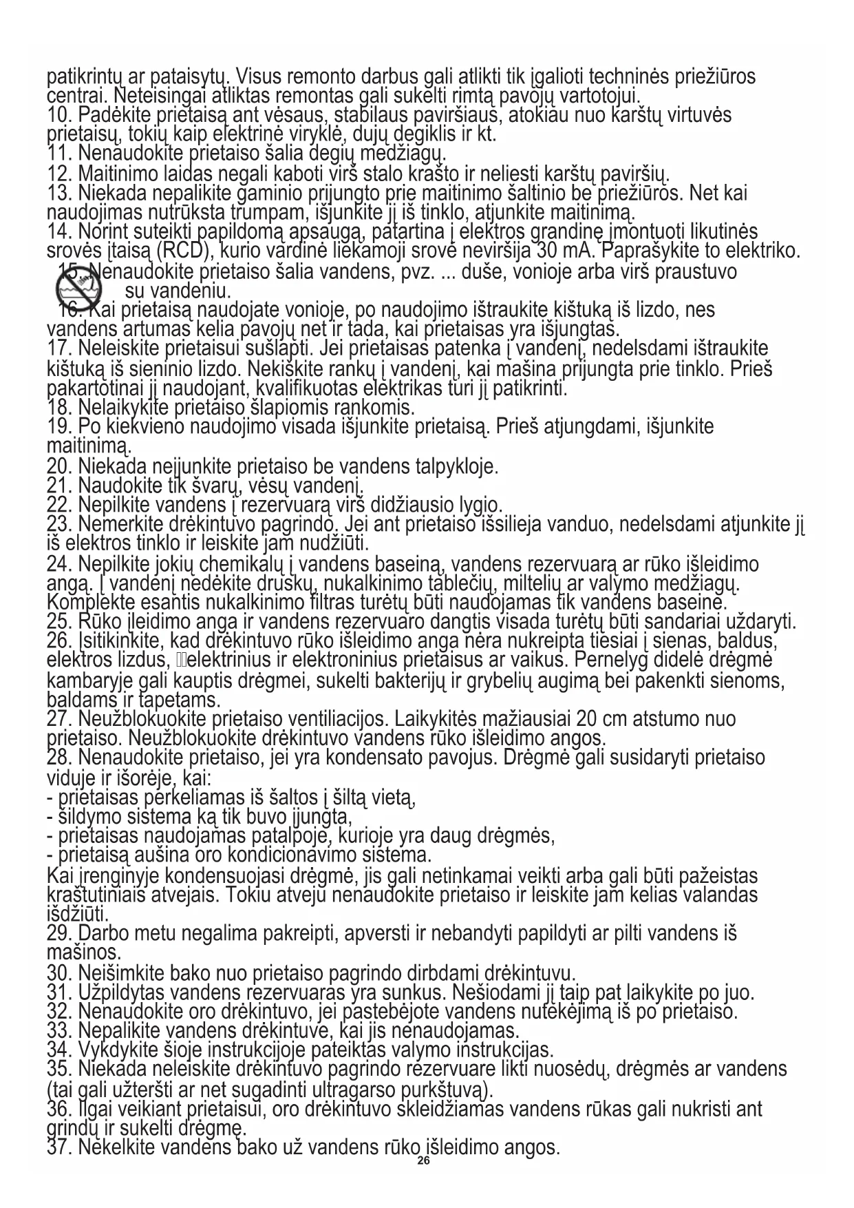 36. Ilgai veikiant prietaisui, oro drėkintuvo skleidžiamas vandens rūkas gali nukristi ant
