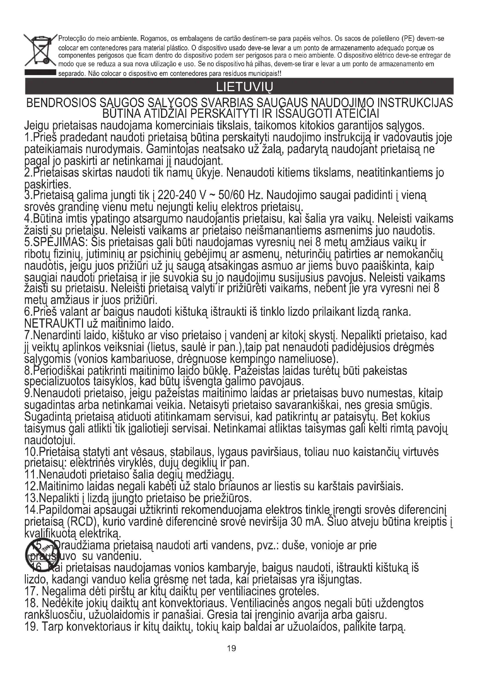 Protecção do meio ambiente. Rogamos, os embalagens de cartão destinem-se para papéis velhos. Os sacos de polietileno (PE) devem-se colocar em contenedores para material plástico. O dispositivo usado deve-se levar a um ponto de armazenamento adequado porque os componentes perigosos que ficam dentro do dispositivo podem ser perigosos para o meio ambiente. O dispositivo elétrico deve-se entregar de modo que se reduza a sua nova utilização e uso. Se no dispositivo há pilhas, devem-se tirar e levar a um ponto de armazenamento em separado. Não colocar o dispositivo em contenedores para resíduos municipais!! LIETUVIŲ20