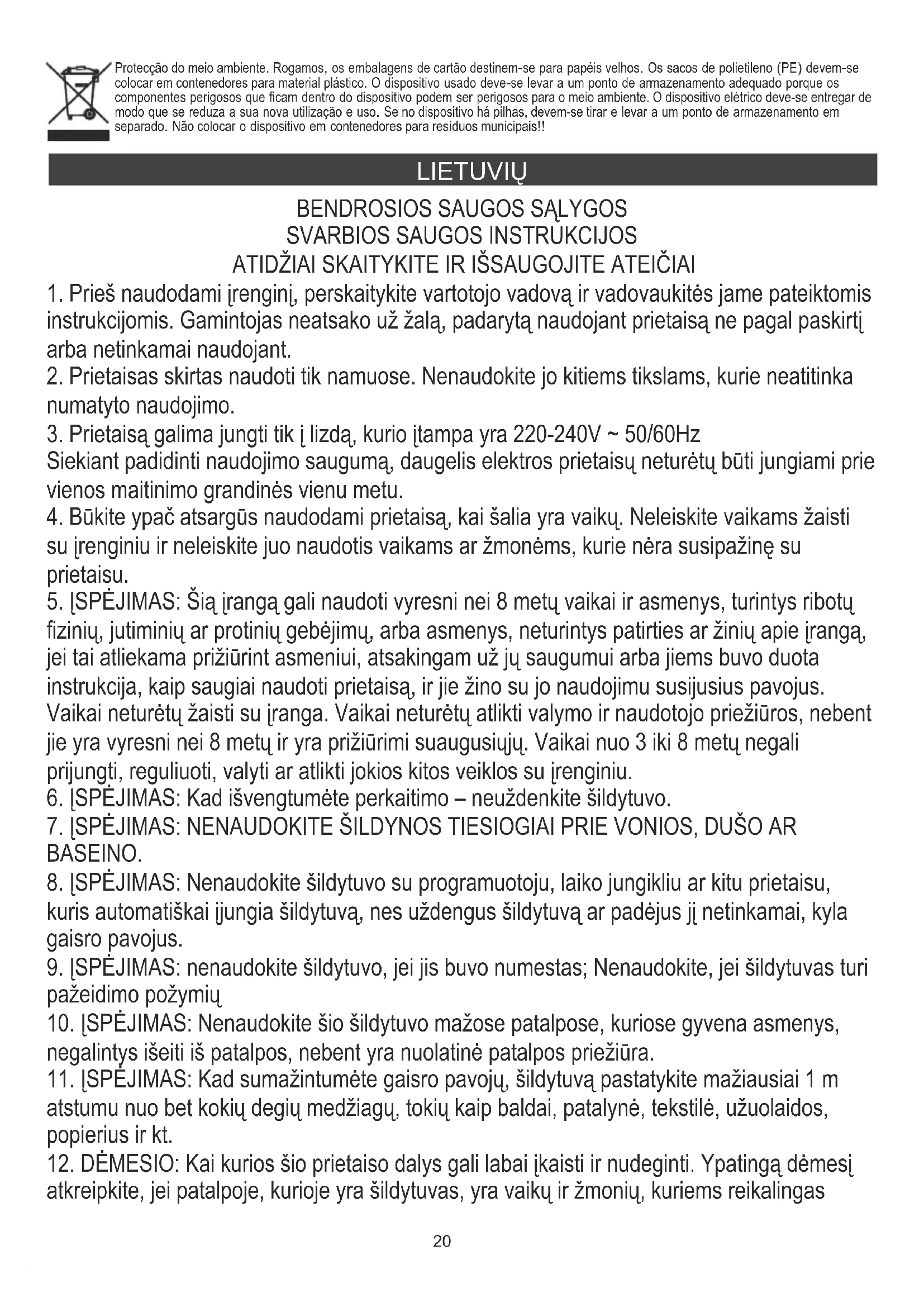 atkreipkite, jei patalpoje, kurioje yra šildytuvas, yra vaikų ir žmonių, kuriems reikalingas LIETUVIŲ Protecção do meio ambiente. Rogamos, os embalagens de cartão destinem-se para papéis velhos. Os sacos de polietileno (PE) devem-se colocar em contenedores para material plástico. O dispositivo usado deve-se levar a um ponto de armazenamento adequado porque os componentes perigosos que ficam dentro do dispositivo podem ser perigosos para o meio ambiente. O dispositivo elétrico deve-se entregar de modo que se reduza a sua nova utilização e uso. Se no dispositivo há pilhas, devem-se tirar e levar a um ponto de armazenamento em separado. Não colocar o dispositivo em contenedores para resíduos municipais!!21 specialus gydymas.