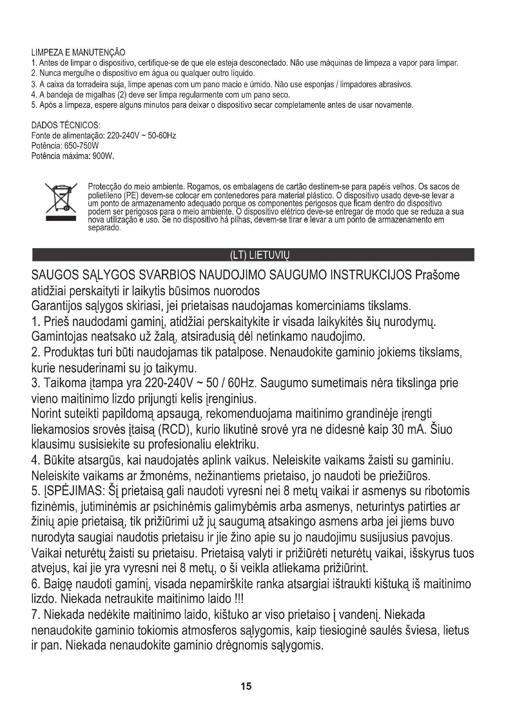 Galia: 650-750W Maksimali galia: 900W Maitinimas: 220–240 V ~ 50–60 Hz TECHNINIAI DUOMENYS:
