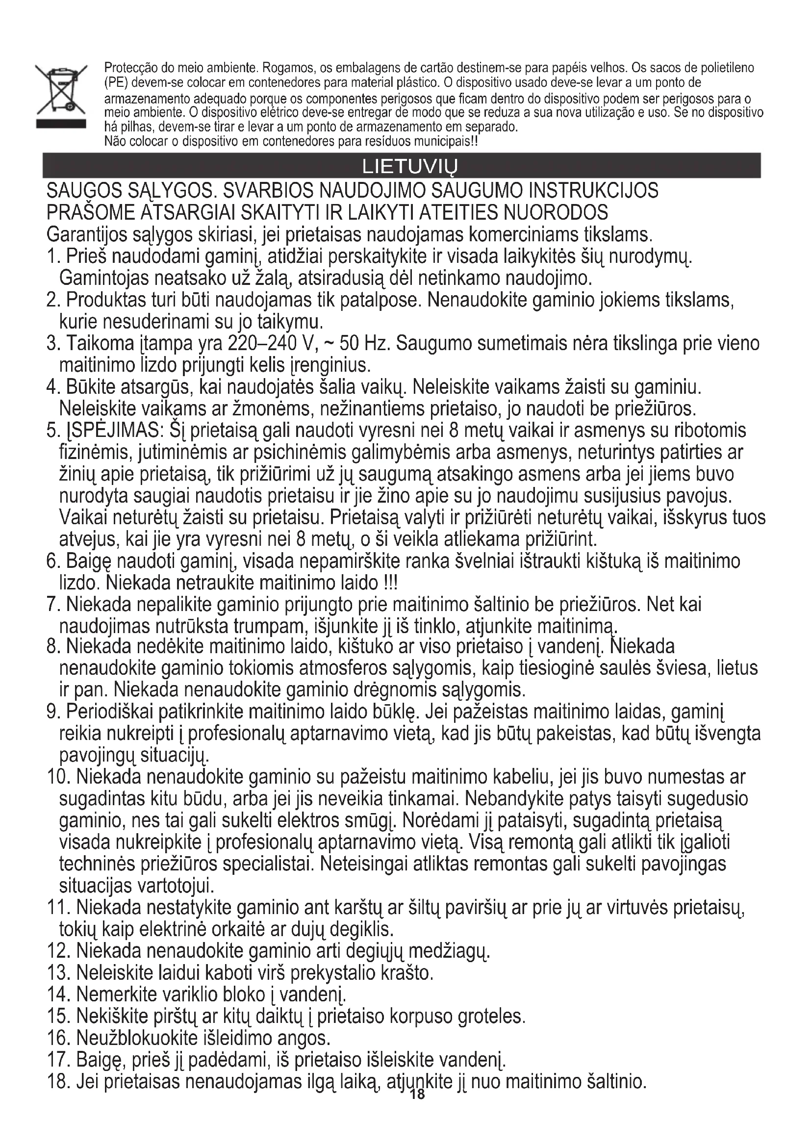 Neleiskite vaikams ar žmonėms, nežinantiems prietaiso, jo naudoti be priežiūros. PRAŠOME ATSARGIAI SKAITYTI IR LAIKYTI ATEITIES NUORODOS Garantijos sąlygos skiriasi, jei prietaisas naudojamas komerciniams tikslams. SAUGOS SĄLYGOS. SVARBIOS NAUDOJIMO SAUGUMO INSTRUKCIJOS
