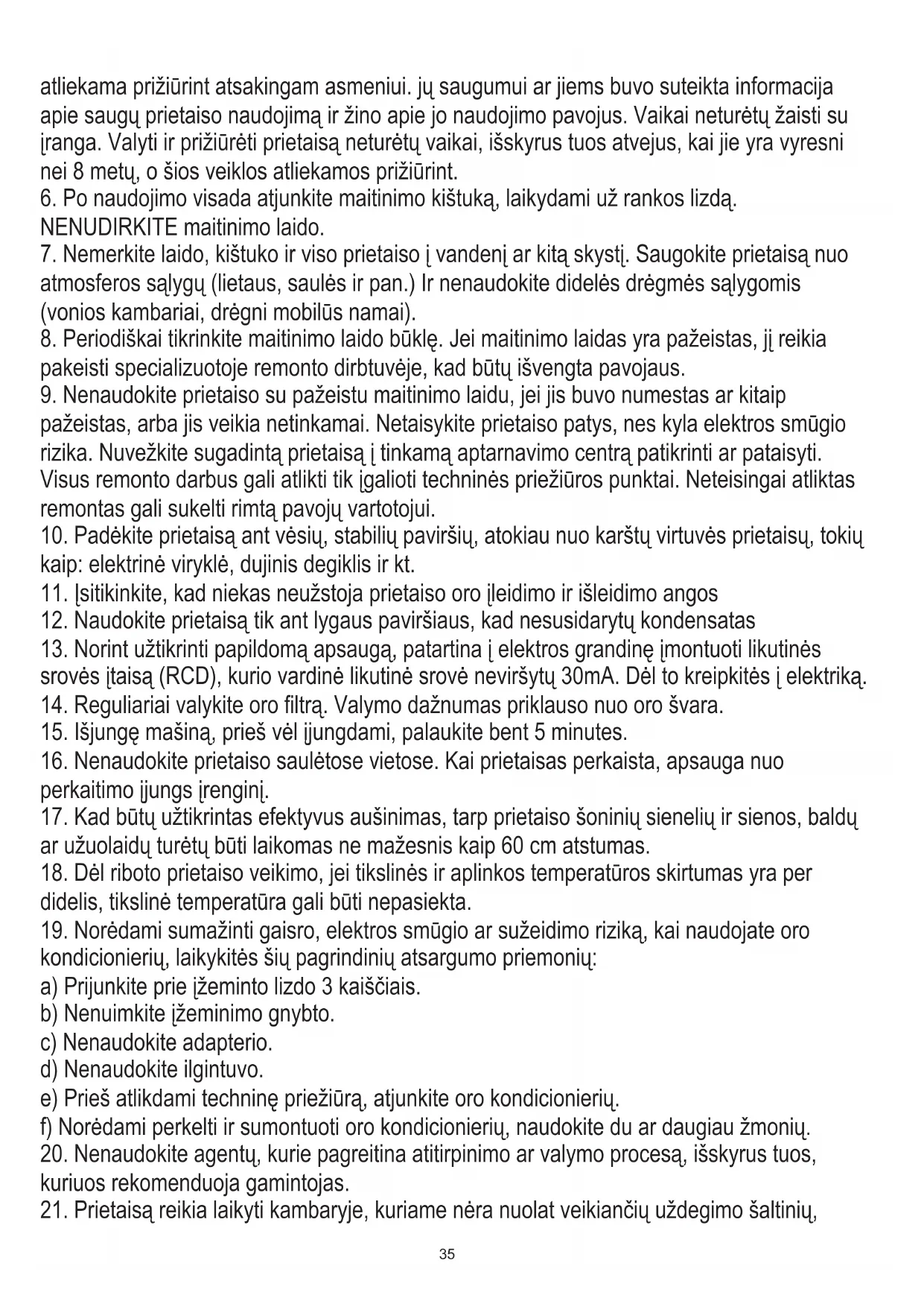 kondicionierių, laikykitės šių pagrindinių atsargumo priemonių: a) Prijunkite prie įžeminto lizdo 3 kaiščiais. c) Nenaudokite adapterio. f) Norėdami perkelti ir sumontuoti oro kondicionierių, naudokite du ar daugiau žmonių. e) Prieš atlikdami techninę priežiūrą, atjunkite oro kondicionierių.