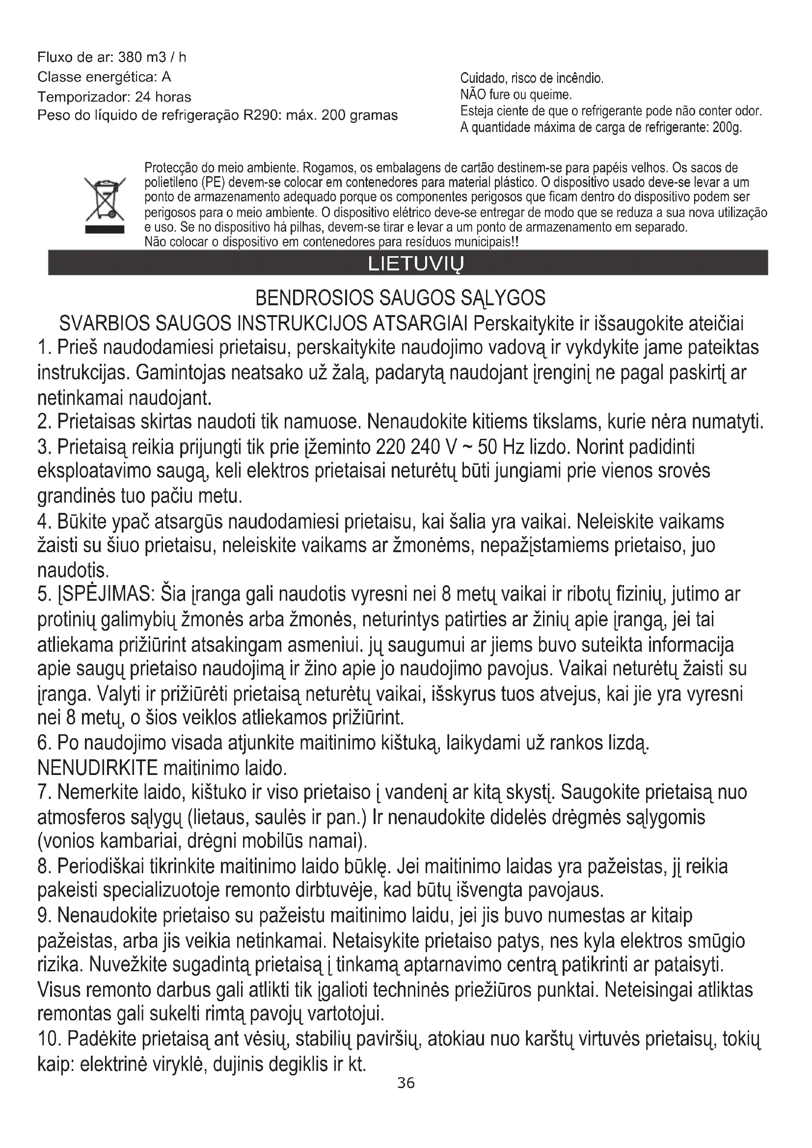 TECHNINIAI DUOMENYS: Aušinimo galia BTU: 9000 BTU / val Aušinimo galia vatais: 2600 Energijos sąnaudos (aušinimas) W: 950 W Tūris: <= 65 dB Oro srautas: 380 m3 / h Energijos klasė: A Laikmatis: 24 valandos R290 aušinimo skysčio svoris: maks. 200 gramų Rūpinantis aplinka. Kartono pakuotes atiduoti į makulatūrą. Polietileno (PE) maišelius mesti į plastikui skirtą konteinerį. Susidėvėjusį prietaisą atiduoti į atitinkamą atliekų surinkimo vietą, nes prietaise esančios pavojingos medžiagos gali kelti grėsmę aplinkai. Elektrinį prietaisą atiduoti tokį, kad nebūtų galima jo pakartotinai naudoti ir panaudoti. Jeigu prietaise yra baterijos, būtina jas išimti ir atskirai atiduoti į atliekų surinkimo vietą. Nemesti prietaiso į buitinių atliekų konteinerį! LATVIEŠU VISPĀRĪGIE DROŠĪBAS NOSACĪJUMI SVARĪGAS DROŠĪBAS INSTRUKCIJAS RŪPĪGI LASĪT UN SAUDZĒT NĀKOTNĒM
