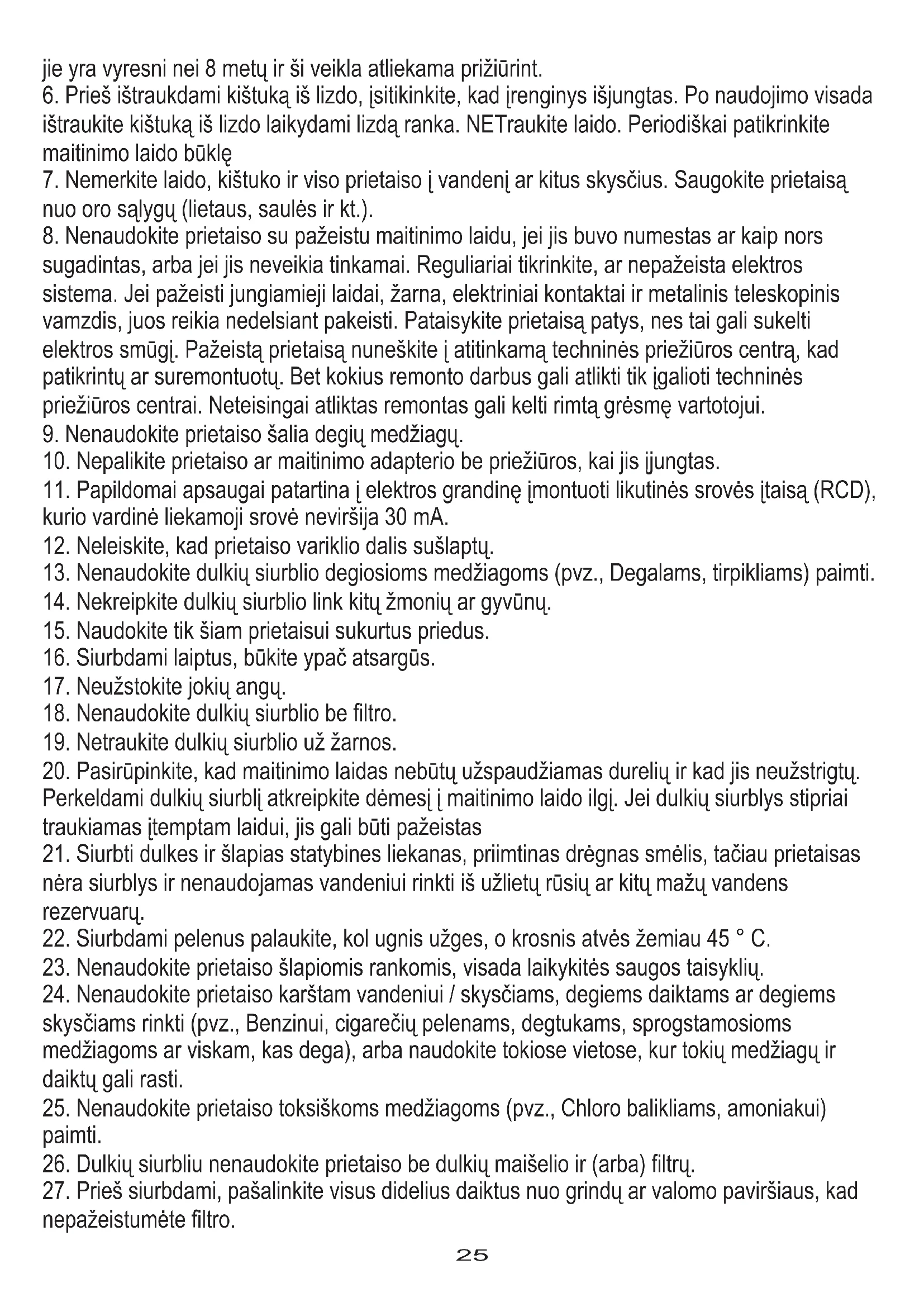 25. Nenaudokite prietaiso toksiškoms medžiagoms (pvz., Chloro balikliams, amoniakui)