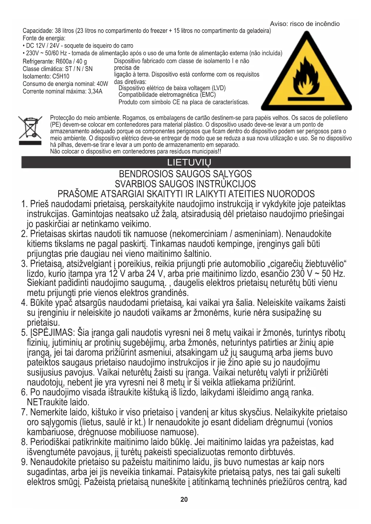 - DC 12V / 24V - automobilio žiebtuvėlių lizdas23 Rūpinantis aplinka. Kartono pakuotes atiduoti į makulatūrą. Polietileno (PE) maišelius mesti į plastikui skirtą konteinerį. Susidėvėjusį prietaisą atiduoti į atitinkamą atliekų surinkimo vietą, nes prietaise esančios pavojingos medžiagos gali kelti grėsmę aplinkai. Elektrinį prietaisą atiduoti tokį, kad nebūtų galima jo pakartotinai naudoti ir panaudoti. Jeigu prietaise yra baterijos, būtina jas išimti ir atskirai atiduoti į atliekų surinkimo vietą. Nemesti prietaiso į buitinių atliekų konteinerį! LATVIEŠU VISPĀRĪGI DROŠĪBAS NOSACĪJUMI