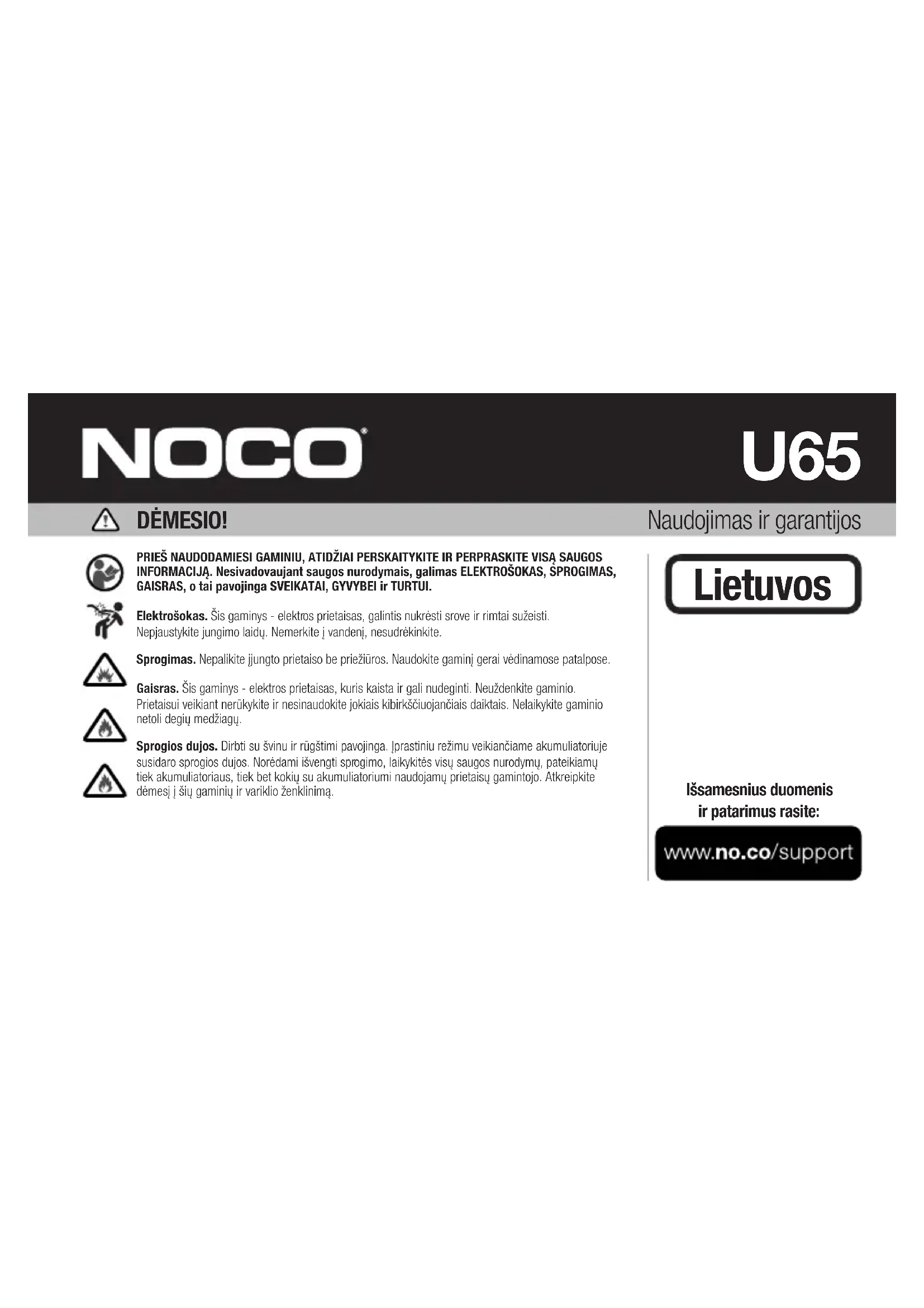Need tingimused kehtivad tootele ainult garantiiaja jooksul. Tasuta garantii kaotab kehtivuse alates ettenähtud aja möödumisest ostukuupäevast (seerianumbri kuupäevast alates, kui puudub ostutõend) või vastavalt selles dokumendis varem loetletud tingimustele. Tagastage toode koos asjakohaste dokumentidega. Kviitungiga: 1 aasta:TASUTA. Ostutõendiga algab garantiiaeg ostukuupäevast Kviitungita: 1 aasta: TASUTA. Ostutõendita algab garantiiaeg seerianumbri kuupäevast. Ostutõendite üleslaadimiseks ja kehtivate garantiikuupäevade pikendamiseks soovitame oma NOCO toode registreerida. Võite oma NOCO toote registreerida veebis aadressil: no.co/register. Kui teil on garantii või toote kohta küsimusi, pöörduge NOCO klienditoe poole (e-posti aadress ja telefoninumber ülal) või kirjutage aadressile: The NOCO Company, aadressil 30339 Diamond Parkway, 102, Glenwillow, OH 44139 USA.U65 DĖMESIO! PRIEŠ NAUDODAMIESI GAMINIU, ATIDŽIAI PERSKAITYKITE IR PERPRASKITE VISĄ SAUGOS INFORMACIJĄ. Nesivadovaujant saugos nurodymais, galimas ELEKTROŠOKAS, SPROGIMAS, GAISRAS, o tai pavojinga SVEIKATAI, GYVYBEI ir TURTUI. Elektrošokas. Šis gaminys - elektros prietaisas, galintis nukrėsti srove ir rimtai sužeisti. Nepjaustykite jungimo laidų. Nemerkite į vandenį, nesudrėkinkite. Sprogimas. Nepalikite įjungto prietaiso be priežiūros. Naudokite gaminį gerai vėdinamose patalpose. Gaisras. Šis gaminys - elektros prietaisas, kuris kaista ir gali nudeginti. Neuždenkite gaminio. Prietaisui veikiant nerūkykite ir nesinaudokite jokiais kibirkščiuojančiais daiktais. Nelaikykite gaminio netoli degių medžiagų. Sprogios dujos. Dirbti su švinu ir rūgštimi pavojinga. Įprastiniu režimu veikiančiame akumuliatoriuje susidaro sprogios dujos. Norėdami išvengti sprogimo, laikykitės visų saugos nurodymų, pateikiamų tiek akumuliatoriaus, tiek bet kokių su akumuliatoriumi naudojamų prietaisų gamintojo. Atkreipkite dėmesį į šių gaminių ir variklio ženklinimą. Naudojimas ir garantijos Išsamesnius duomenis ir patarimus rasite: LietuvosKalifornijos valstijos geriamojo vandens saugos įstatymas. Naudodami šį produktą galite turėti sąlytį su chemikalais, kurie, kaip žinoma Kalifornijos valstijoje, gali sukelti vėžį, apsigimimus ir kitą su reprodukcija susijusią žalą. Adapteriai. Šio produkto veikimo parametrai: 100-240 V, 50-60 Hz. Į komplektaciją įeina keturi (4) adapteriai priklausomai nuo jūsų geografinio regiono: A tipo (Jungtinėse Valstijose), C tipo (Europoje), G tipo (Jungtinėje Karalystėje) ir I tipo (Australijoje). Pasirinkite jūsų regionui tinkantį adapterį prieš pradėdami naudoti produktą. Asmeninės atsargumo priemonės. Naudokite produktą tik pagal paskirtį. Kažkas turėtų būti netoliese, kad girdėtų jūsų balsą, arba būti pakankamai arti, kad ateitų jums padėti nelaimingo atsitikimo atveju. Nepilnamečiai. Jei pirkėjas ketina duoti naudoti produktą nepilnamečiui, perkantysis suaugęs asmuo sutinka prieš naudojimą pateikti nepilnamečiui detalius nurodymus ir įspėjimus. Jei to nesilaikoma, atsakomybė taikoma tik pirkėjui, kuris sutinka atlyginti „NOCO“ žalą už nepilnamečio naudojimąsi produktu be priežiūros ar netinkamą naudojimąsi. Pavojus uždusti. Prarijęs detalę vaikas gali uždusti. Nepalikite vaikų vienų prie gaminio ar bet kokių jo priedų. Šis gaminys nėra žaislas. Priežiūra. Įprasto naudojimo metu produktas gali labai įšilti. Ilgalaikis sąlytis su šiltais paviršiais gali sukelti diskomfortą ir sužalojimus. Užtikrinkite tinkamą vėdinimą aplink maitinimo adapterį ir su juo elkitės atsargiai. Nedėkite maitinimo adapterio po antklode, pagalve ar po savo kūnu, kai adapteris yra prijungtas prie maitinimo šaltinio. Venkite situacijų, kai jūsų oda turi ilgalaikį sąlytį su prie maitinimo šaltinio prijungtu maitinimo adapteriu. Elkitės ypač atsargiai, jei jums pasireiškusi fizinė būklė, paveikianti jūsų gebėjimą jausti karštį. Nenaudokite produkto, jei adapterio kištukas, kištuko kojelės arba korpusas pažeisti. Nenaudokite produkto su pažeistu laidu. Drėgmė ir skysčiai gali pažeisti produktą. Nenaudokite produkto ar jo elektrinių dalių šalia skysčių (pvz., kriauklės, vonios ar dušo). Laikykite ir naudokite produktą sausoje vietoje. Nenaudokite produkto, jei jis sušlampa. Jei naudojamas produktas sušlampa, nedelsdami jį atjunkite. Neprijunkite ir neatjunkite maitinimo adapterio šlapiomis rankomis. Pakeitimai. Nebandykite pakeisti, modifikuoti ar remontuoti jokios produkto dalies. Produkto išardymas galim lemti susižalojimą, mirtį arba turto apgadinimą. Jei produktas yra pažeistas, netinkamai funkcionuoja arba turi sąlytį su vandeniu, nustokite jį naudoti ir susisiekite su „NOCO“. Atlikus bet kokius produkto pakeitimus garantija nustoja galioti. Priedai. Produktas turėtų būti naudojamas tik su „NOCO“ patvirtintais priedais. „NOCO“ neatsako už naudotojo saugumą ar žalą, kai naudojami „NOCO“ nepatvirtinti priedai. Vietos parinkimas. Nenaudokite produkto apribotoje erdvėje ar erdvėje, kurioje prastas vėdinimas. Valymas. Atjunkite produktą prieš vykdydami jo priežiūrą ar jį valydami. Nuvalykite ir nusausinkite produktą, jei jis turi sąlytį su skysčiu ar teršalais. Naudokite minkštą, nepūkuotą (mikropluošto) audinį. Stenkitės, kad drėgmė nepatektų į angas. Sprogimo pavojus. Paisykite visų žymėjimų ir nurodymų. Nenaudokite produkto sprogioje aplinkoje, įskaitant degalų tiekimo vietas arba vietas, kuriose yra chemikalų ar dalelių, tokių kaip grūdai, dulkės ar metalo milteliai. Pavojinga veikla. Produktas neskirtas naudoti, kai netinkamas jo naudojimas gali sukelti sužalojimą, mirtį ar rimtą žalą aplinkai. Naudokite U65 65W USB-C maitinimo adapterį ir pridėtą USB-C laidą, kad pakrautumėte „NOCO Boost X UltraSafe“ užvediklį ar bet kokį kitą USB-C įrenginį. Prij