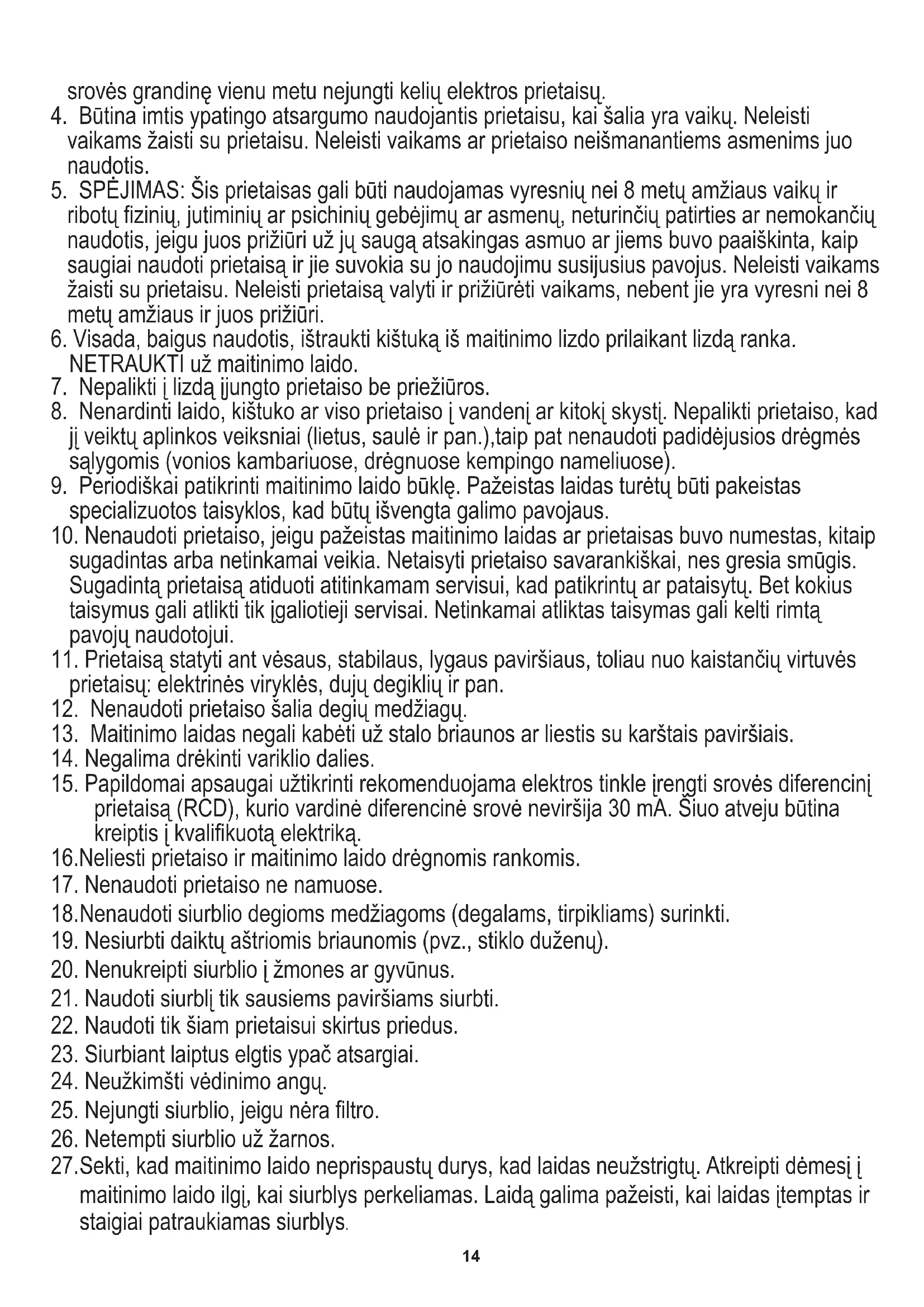 prietaisą (RCD), kurio vardinė diferencinė srovė neviršija 30 mA. Šiuo atveju būtina kreiptis į kvalifikuotą elektriką. 16.Neliesti prietaiso ir maitinimo laido drėgnomis rankomis.