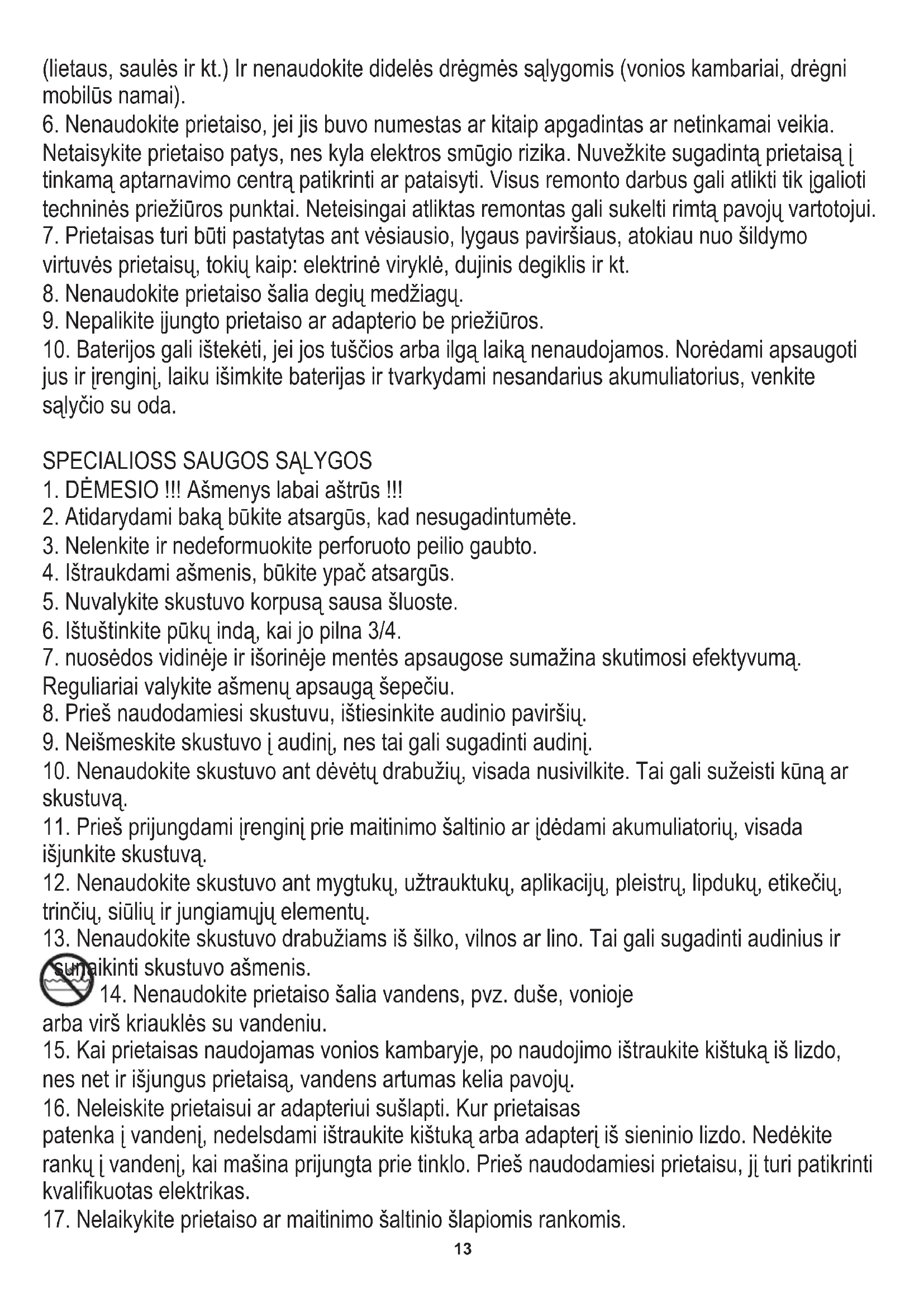 nes net ir išjungus prietaisą, vandens artumas kelia pavojų. patenka į vandenį, nedelsdami ištraukite kištuką arba adapterį iš sieninio lizdo. Nedėkite rankų į vandenį, kai mašina prijungta prie tinklo. Prieš naudodamiesi prietaisu, jį turi patikrinti kvalifikuotas elektrikas.14
