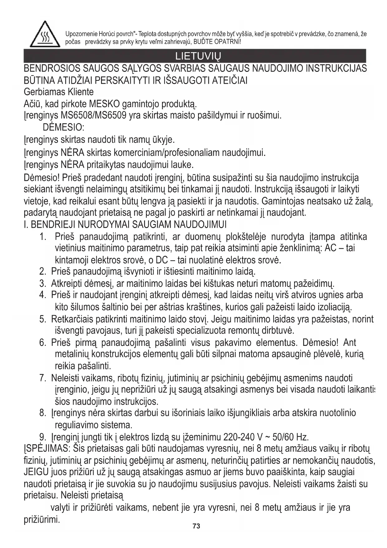 vietinius maitinimo parametrus, taip pat reikia atsiminti apie ženklinimą: AC – tai kintamoji elektros srovė, o DC – tai nuolatinė elektros srovė. Dėmesio! Prieš pradedant naudoti įrenginį, būtina susipažinti su šia naudojimo instrukcija siekiant išvengti nelaimingų atsitikimų bei tinkamai jį naudoti. Instrukciją išsaugoti ir laikyti vietoje, kad reikalui esant būtų lengva ją pasiekti ir ja naudotis. Gamintojas neatsako už žalą, padarytą naudojant prietaisą ne pagal jo paskirti ar netinkamai jį naudojant. Gerbiamas Kliente Įrenginys MS6508/MS6509 yra skirtas maisto pašildymui ir ruošimui. Įrenginys NĖRA pritaikytas naudojimui lauke.