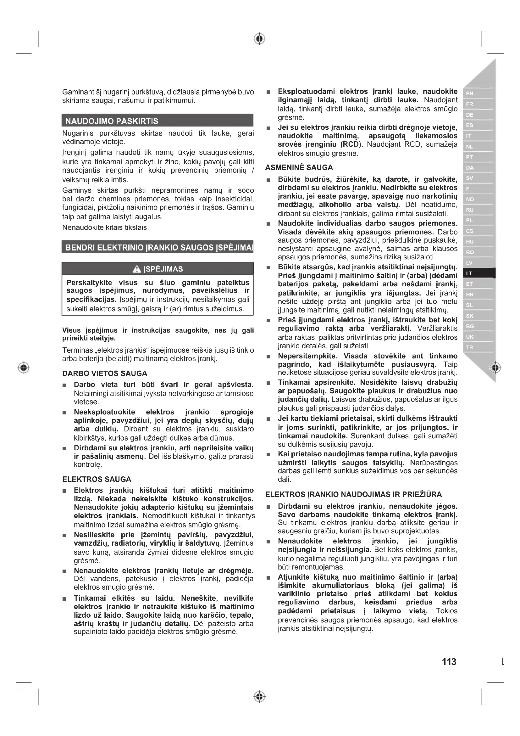 ■ Jokiu būdu neleiskite naudoti krūmapjovės vaikams, asmenims su fiziniais, jutiminiais ar psichiniais sutrikimais, ar žmonėms, neturintiems reikiamos patirties ir žinių, arba nesusipažinusiems su šiomis instrukcijomis. ■ Purškiamame plote negali būti pašalinių asmenų vaikų ir gyvūnų. ■ Žinokite, kokius pavojus gali kelti purškiamos medžiagos. Prieš purškiant gaminiu pesticidus ar kitas medžiagas, reikia atidžiai perskaityti etiketę ant originalios pakuotės ir vadovautis nurodymais. ■ Prieš naudodami gaminį, patikrinkite, ar purškimo svirtelė saugiai pritvirtinta prie jai skirtos rankenėlės. Jei reikia, tvirtinti purškimo svirtelę prie jai skirtos rankenėlės replėmis. ■ Įpylus skysčio į purškimo rezervuarą, būtinai reikia pakeisti ir sandariai uždėti rezervuaro dangtelį. ■ Naudoti tik nepramonines vandenines vejų ir sodo bei daržo purškimo chemines priemones. ■ Nenaudoti komercinių cheminių priemonių ar komercinės ar pramoninės paskirties chemikalų. ■ Nepilti į gaminį kaustinių (šarminių) savaime įkaistančių ar koroziją keliančių (rūgštinių) skysčių. Jos gali ėsti metalines dalis arba pakenkti rezervuarą ir žarną. ■ Panaudojus gaminį negalima palikti likučio ar purškiamos medžiagos purškimo rezervuare. Valyti po kiekvieno naudojimo. ■ Nepilti į purškimo rezervuarą karštų ar verdančių skysčių. Jos gali pakenkti ar pažeisti žarną ar purškimo rezervuarą. ■ Neperpildyti rezervuaro. ■ Purškiamas plotas turi būti gerai vėdinamas. ■ Naudojant gaminį negalima rūkyti, valgyti ar gerti. ■ Stenkitės, kad purškiamųjų medžiagų nepatektų ant odos. ■ Purškimo medžiagos negali susiliesti su oda. Patekus, nedelsiant nuplauti muilu ir gausiu kiekiu vandens. ■ Nukreipkite antgalį tiesiai į augalus ir purškiamus objektus. ■ Patikrinkite, ar purškiamos medžiagos nukreiptos į plotą, kurio jos nepažeis ir neapgadins. ■ Elektros smūgio pavojus. Nepurkšti į elektros lizdus. ■ Po kiekvieno naudojimo kruopščiai nusiplaukite rankas ir kitas vietas, kurios lietėsi su purškalu. ■ Prieš išleidžiant iš gaminio skystį, valant ar padedant į sandėlį, reikia išimti bateriją, kad gaminys netyčia neįsijungtų. Rodo, kad įrangai gali būti taikomi nacionaliniai teisės aktai dėl reguliaraus paskirtų įstaigų tikrinimo, kaip numatyta 2009 m. spalio 21 d. Europos Parlamento ir Tarybos direktyvoje 2009/128/EB, nustatančioje Bendrijos veiksmų pagrindus siekiant tausiojo pesticidų naudojimo.
