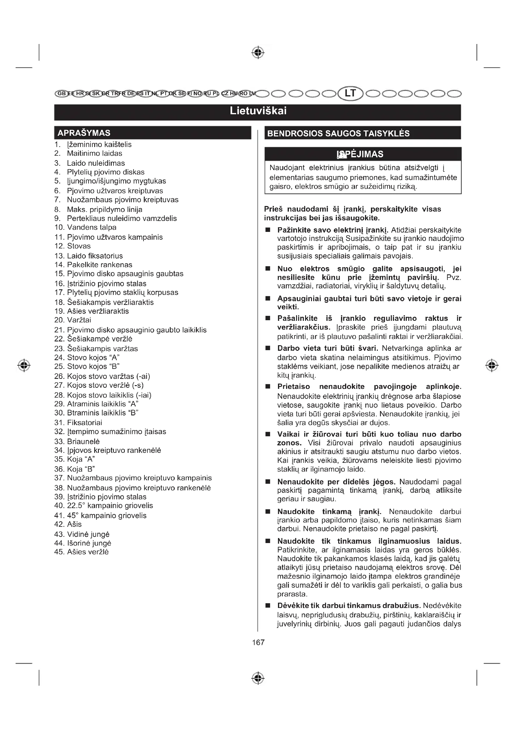 GB EE HR SI SK GR TRFR DE ES IT NL PT DK SE FI NO RU PL CZ HU RO LV ir jus įtraukti. Dirbant lauke rekomenduojama mūvėti gumines pirštines ir avėti batus neslystančiais padais (batus guminiais padais). Jei turite ilgus plaukus, dėvėkite apsauginį galvos apdangalą. Visada dėvėkite apsauginius akinius su šonine apsauga. Kasdieniniuose akiniuose yra tik smūgiui atsparūs lęšiai, šie akiniai NĖRA apsauginiai akiniai. Ruošinį pritvirtinkite. Jei praktiška, ruošinį prispauskite spaustuvais ar gnybtais, nes tai yra saugiau, nei jį prispaudžiant rankomis, o taip pat rankos lieka laisvos darbui įrankiu atlikti. Nesiekite per toli. Visada tvirtai stovėkite ir išlaikykite pusiausvyrą. Įrankius prižiūrėkite rūpestingai. Siekiant geresnių rezultatų ir kad darbas būtų atliktas saugiai, įrankiai turi būti aštrūs ir švarūs. Laikykitės tepimo ir papildomų detalių keitimo instrukcijų. Reguliariai patikrinkite įrankio laidus, jei jie apgadinti, juos remontuoti pristatykite tik įgaliotą techninės priežiūros centrą. Pastoviai patikrinkite ilginamuosius laidus ir pakeiskite juos, jei jie pažeisti. Rankenas reikia visada sausai nuvalyti, kad jos nebūtų suteptos alyva ir tepalais. Atjunkite įrankius nuo maitinimo šaltinio. Kai įrankis nenaudojamas ar prieš atliekant techninę priežiūrą, keičiant priedus, pjovimo diskus, antgalius, pjoviklius ir t. t., visus įrankius būtina atjungti nuo maitinimo šaltinio. Prieš reguliuodami įrankį, atlikdami techninės priežiūros darbus visada ištraukite kištuką iš maitinimo lizdo. Saugokitės, kad įrankis atsitiktinai neįsijungtų. Prieš prijungdami bet kokį įrankį prie maitinimo šaltinio, visada patikrinkite, ar jungiklis yra išjungtas (OFF padėtyje). Naudokite rekomenduojamus priedus. Informacijos dėl rekomenduojamų priedų ieškokite vartotojo instrukcijoje. Netinkamų papildomų detalių naudojimas gali sukelti sužeidimų pavojų. Niekada nelipkite ant prietaiso. Prie pjovimo įrankio prisilietus arba netyčia jį prilietus galima sunkiai susižeisti. Patikrinkite, ar nėra pažeistų detalių. Prieš pradėdami naudoti įrankį, apžiūrėkite, ar nėra sugadintų detalių.Jei detalė šiek tiek sugadinta, atsargiai nustatykite, ar prietaisas tinkamai veiks ir atliks numatytą darbą. Patikrinkite judančių detalių centravimą, sukibimą, sulūžusias detales, sumontavimą ir kita, kas galėtų turėti neigiamos įtakos darbui. Siekiant išvengti sužeidimų, pažeistus apsauginius įtaisus arba kitas prietaiso detales prieš pradedant darbą reikia suremontuoti arba pakeisti įgaliotoje techninės priežiūros įmonėje. Ruošinį stumkite tik teisinga kryptimi. Ruošinį stumkite link pjovimo disko tik prieš disko ar pjoviklio sukimosi kryptį. Niekada nepalikite veikiančio įrankio be priežiūros. Išjunkite įrankį. Neatsitraukite nuo įrankio, kol jis visiškai nesustojo. Saugokite plaučius. Dėvėkite veido kaukę arba kaukę nuo dulkių, jei tektų dirbti ten, kur išsiskiria dulkės. Saugokite klausą. Dirbdami ilgesnį laiką, dėvėkite klausos apsaugos priemones. Laidą naudokite pagal jo paskirtį. Niekada netraukite už laido, norėdami atjungti įrankį nuo maitinimo šaltinio. Saugokite maitinimo laidą nuo karščio, tepalų ir aštrių kampų. Pjovimo disko apsauginis gaubtas visada turi būti pritvirtintas ir gerai veikiantis. Rankas laikykite toliau nuo pjovimo zonos. Rankas laikykite toliau nuo pjovimo disko. Kai pjovimo diskas sukasi, nesiekite po ruošiniu ar aplink jį, o taip pat virš pjovimo disko. Pjovimo diskui judant ruošinio nebandykite ištraukti. Stakles išjungus, pjovimo diskas lengvai sukasi. Niekada nedirbkite aplinkoje, kurioje gresia sprogimo pavojus. Įprastinis variklio kibirkščiavimas gali uždegti degius garus. Pastoviai tikrinkite įrankio laidus. Jei pažeistas, jį turi suremontuoti kvalifikuotas technikas įgaliotame techninės priežiūros centre. Pastoviai patikrinkite ilginamuosius laidus ir pakeiskite juos, jei jie pažeisti. Įžeminkite visus įrankius. Jei įrankis yra su trijų smaigalių kištuku, jį būtina prijungti prie trijų skylių elektros maitinimo šaltinio. Jei įžeminimo instrukcijas nevisiškai suprantate arba jei kyla abejonių, ar produktas tinkamai įžemintas, pagalbos kreipkitės pas kvalifi kuotą elektriką ar paslaugas teikiančius darbuotojus. Naudokite tik tinkamus elektrinius įtaisus: naudokite tik 3-ų laidų ilginamuosius laidus su 3 įžeminimo kištuko smaigaliais ir 3 polių patronus, kuriems tinkamas įrankio kištukas. Pridedamo kištuko nekeiskite. Jei kištukas lizdui netinka, kvalifi kuotas elektrikas turi įrengti tinkamą kištukinį lizdą. Pasirūpinkite, kad įrankis būtų sausas, švarus nuvalykite nuo jo alyvos arba tepalo pėdsakus. Prietaisą visada valykite švaria šluoste. Prietaiso niekada nevalykite stabdžių skysčiu, benzinu, naftos produktais ar kitais tirpikliais. Būkite budrūs ir kontroliuokite situaciją. Stebėkite, ką darote ir vadovaukitės sveika nuovoka. Nedirbkite įrankiu, kai esate pavargę. Neskubėkite.169 Lietuviškai