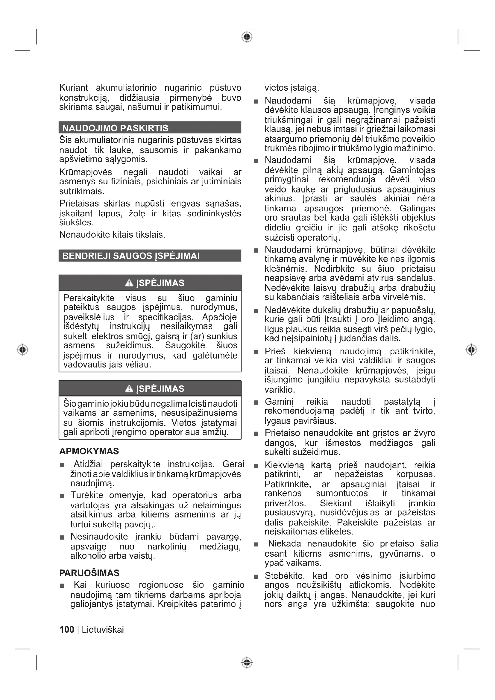 TRKuriant akumuliatorinio nugarinio pnjstuvo konstrukciją, didžiausia pirmenybơ buvo skiriama saugai, našumui ir patikimumui. NAUDOJIMO PASKIRTIS Šis akumuliatorinis nugarinis pnjstuvas skirtas naudoti tik lauke, sausomis ir pakankamo apšvietimo sąlygomis. Krnjmapjovơs negali naudoti vaikai ar asmenys su ¿ ziniais, psichiniais ar jutiminiais sutrikimais. Prietaisas skirtas nupnjsti lengvas sąnašas, Ƴskaitant lapus, žolĊ ir kitas sodininkystơs šiukšles. Nenaudokite kitais tikslais.