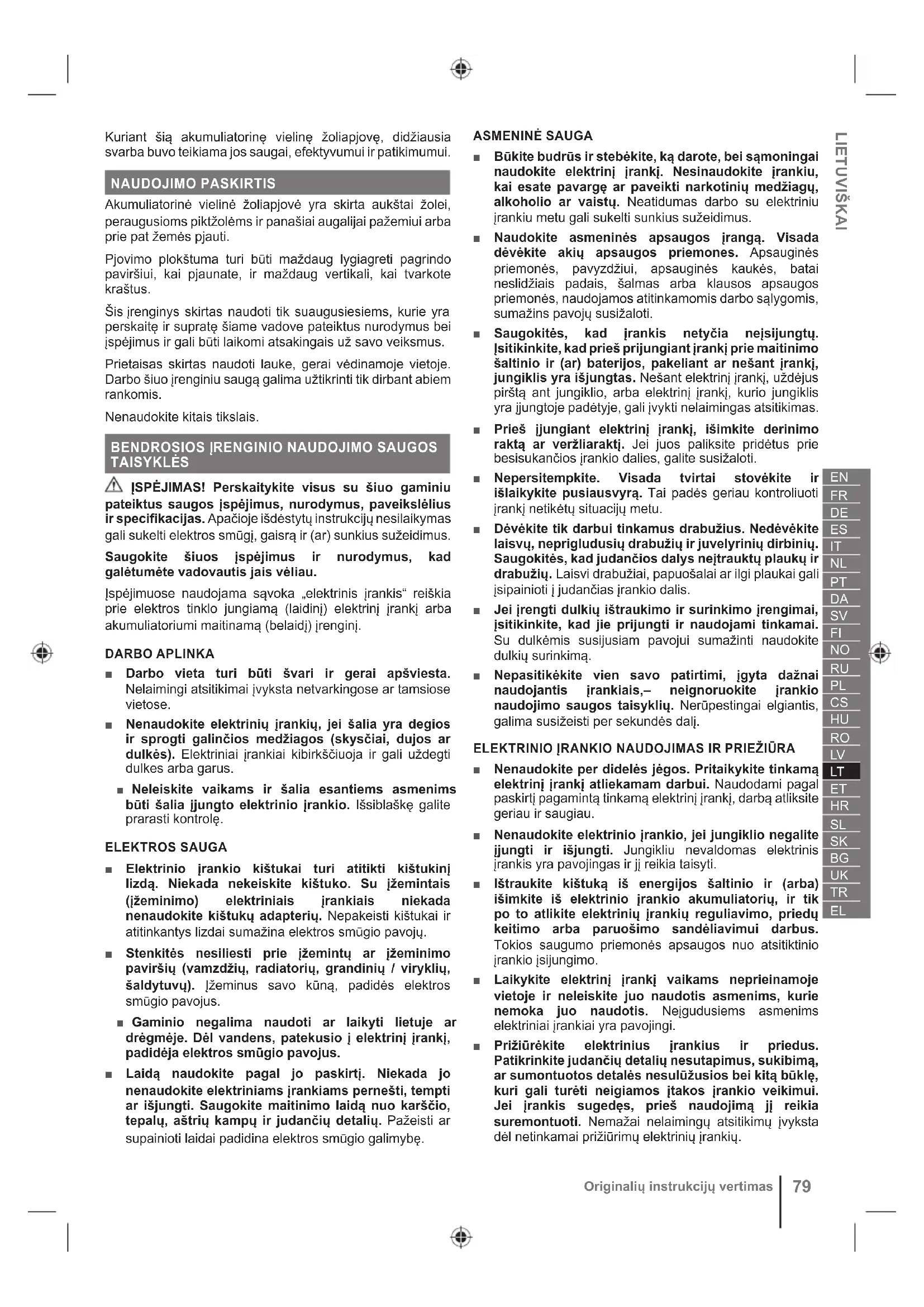 TAISYKLĖS ĮSPĖJIMAS! Perskaitykite visus su šiuo gaminiu pateiktus saugos įspėjimus, nurodymus, paveikslėlius ir specifikacijas. Apačioje išdėstytų instrukcijų nesilaikymas gali sukelti elektros smūgį, gaisrą ir (ar) sunkius sužeidimus. Saugokite šiuos įspėjimus ir nurodymus, kad galėtumėte vadovautis jais vėliau. Įspėjimuose naudojama sąvoka „elektrinis įrankis“ reiškia prie elektros tinklo jungiamą (laidinį) elektrinį įrankį arba akumuliatoriumi maitinamą (belaidį) įrenginį. DARBO APLINKA ■ Darbo vieta turi būti švari ir gerai apšviesta. Nelaimingi atsitikimai įvyksta netvarkingose ar tamsiose vietose. ■ Nenaudokite elektrinių įrankių, jei šalia yra degios ir sprogti galinčios medžiagos (skysčiai, dujos ar dulkės). Elektriniai įrankiai kibirkščiuoja ir gali uždegti dulkes arba garus. ■ Neleiskite vaikams ir šalia esantiems asmenims būti šalia įjungto elektrinio įrankio. Išsiblaškę galite prarasti kontrolę. ELEKTROS SAUGA ■ Elektrinio įrankio kištukai turi atitikti kištukinį lizdą. Niekada nekeiskite kištuko. Su įžemintais (įžeminimo) elektriniais įrankiais niekada nenaudokite kištukų adapterių. Nepakeisti kištukai ir atitinkantys lizdai sumažina elektros smūgio pavojų. ■ Stenkitės nesiliesti prie įžemintų ar įžeminimo paviršių (vamzdžių, radiatorių, grandinių / viryklių, šaldytuvų). Įžeminus savo kūną, padidės elektros smūgio pavojus. ■ Gaminio negalima naudoti ar laikyti lietuje ar drėgmėje. Dėl vandens, patekusio į elektrinį įrankį, padidėja elektros smūgio pavojus. ■ Laidą naudokite pagal jo paskirtį. Niekada jo nenaudokite elektriniams įrankiams pernešti, tempti ar išjungti. Saugokite maitinimo laidą nuo karščio, tepalų, aštrių kampų ir judančių detalių. Pažeisti ar supainioti laidai padidina elektros smūgio galimybę. ASMENINĖ SAUGA ■ Būkite budrūs ir stebėkite, ką darote, bei sąmoningai naudokite elektrinį įrankį. Nesinaudokite įrankiu, kai esate pavargę ar paveikti narkotinių medžiagų, alkoholio ar vaistų. Neatidumas darbo su elektriniu įrankiu metu gali sukelti sunkius sužeidimus. ■ Naudokite asmeninės apsaugos įrangą. Visada dėvėkite akių apsaugos priemones. Apsauginės priemonės, pavyzdžiui, apsauginės kaukės, batai neslidžiais padais, šalmas arba klausos apsaugos priemonės, naudojamos atitinkamomis darbo sąlygomis, sumažins pavojų susižaloti. ■ Saugokitės, kad įrankis netyčia neįsijungtų. Įsitikinkite, kad prieš prijungiant įrankį prie maitinimo šaltinio ir (ar) baterijos, pakeliant ar nešant įrankį, jungiklis yra išjungtas. Nešant elektrinį įrankį, uždėjus pirštą ant jungiklio, arba elektrinį įrankį, kurio jungiklis yra įjungtoje padėtyje, gali įvykti nelaimingas atsitikimas. ■ Prieš įjungiant elektrinį įrankį, išimkite derinimo raktą ar veržliaraktį. Jei juos paliksite pridėtus prie besisukančios įrankio dalies, galite susižaloti. ■ Nepersitempkite. Visada tvirtai stovėkite ir išlaikykite pusiausvyrą. Tai padės geriau kontroliuoti įrankį netikėtų situacijų metu. ■ Dėvėkite tik darbui tinkamus drabužius. Nedėvėkite laisvų, neprigludusių drabužių ir juvelyrinių dirbinių. Saugokitės, kad judančios dalys neįtrauktų plaukų ir drabužių. Laisvi drabužiai, papuošalai ar ilgi plaukai gali įsipainioti į judančias įrankio dalis. ■ Jei įrengti dulkių ištraukimo ir surinkimo įrengimai, įsitikinkite, kad jie prijungti ir naudojami tinkamai. Su dulkėmis susijusiam pavojui sumažinti naudokite dulkių surinkimą. ■ Nepasitikėkite vien savo patirtimi, įgyta dažnai naudojantis įrankiais,– neignoruokite įrankio naudojimo saugos taisyklių. Nerūpestingai elgiantis, galima susižeisti per sekundės dalį. ELEKTRINIO ĮRANKIO NAUDOJIMAS IR PRIEŽIŪRA ■ Nenaudokite per didelės jėgos. Pritaikykite tinkamą elektrinį įrankį atliekamam darbui. Naudodami pagal paskirtį pagamintą tinkamą elektrinį įrankį, darbą atliksite geriau ir saugiau. ■ Nenaudokite elektrinio įrankio, jei jungiklio negalite įjungti ir išjungti. Jungikliu nevaldomas elektrinis įrankis yra pavojingas ir jį reikia taisyti. ■ Ištraukite kištuką iš energijos šaltinio ir (arba) išimkite iš elektrinio įrankio akumuliatorių, ir tik po to atlikite elektrinių įrankių reguliavimo, priedų keitimo arba paruošimo sandėliavimui darbus. Tokios saugumo priemonės apsaugos nuo atsitiktinio įrankio įsijungimo. ■ Laikykite elektrinį įrankį vaikams neprieinamoje vietoje ir neleiskite juo naudotis asmenims, kurie nemoka juo naudotis. Neįgudusiems asmenims elektriniai įrankiai yra pavojingi. ■ Prižiūrėkite elektrinius įrankius ir priedus. Patikrinkite judančių detalių nesutapimus, sukibimą, ar sumontuotos detalės nesulūžusios bei kitą būklę, kuri gali turėti neigiamos įtakos įrankio veikimui. Jei įrankis sugedęs, prieš naudojimą jį reikia suremontuoti. Nemažai nelaimingų atsitikimų įvyksta dėl netinkamai prižiūrimų elektrinių įrankių.80 Originalių instrukcijų vertimas ■ Pjovimo įrankius reikia pastoviai galąsti ir valyti. Tinkamai prižiūrėti aštriais ašmenimis pjovimo įrankiai mažiau stringa ir juos lengviau valdyti. ■ Naudokite elektrinius įrankius, atsargines detales, grąžtus ir t. t., pagal šias instrukcijas ir atsižvelgdami į darbo sąlygas bei turimą atlikti darbą. Naudokite elektrinį įrankį tik pagal tiesioginę paskirtį, kitaip sukelsite pavojingą situaciją. ■ Rankenos ir suėmimo paviršiai turi būti sausi, švarūs ir nesutepti alyva ar tepalais. Jeigu rankenos ar suėmimo paviršiai slidūs, krūmapjovę naudoti ir valdyti nesaugu netikėtomis situacijomis.