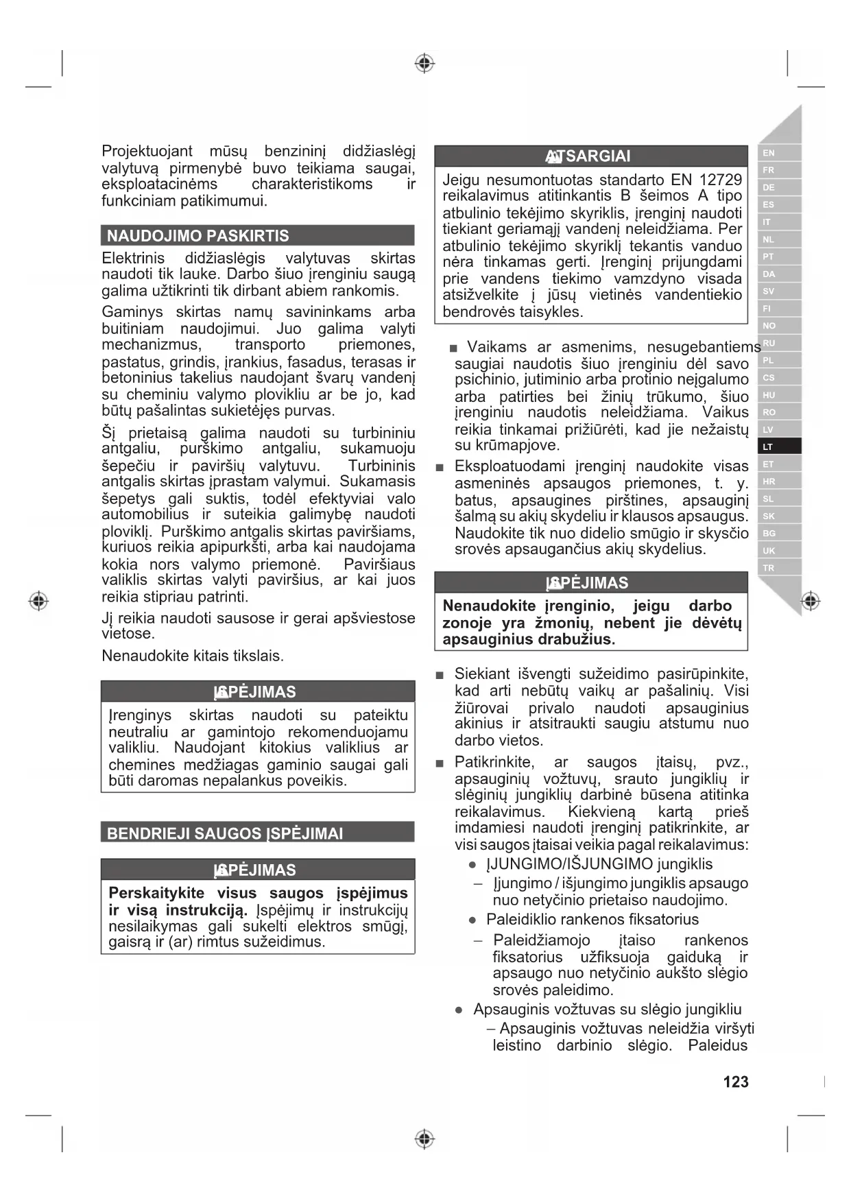 Elektrinis didziaslegis valytuvas skirtas naudoti tik lauke. Darbo siuo jrenginiu sauga galima uztkrinti tik dirbant abiem rankomis.