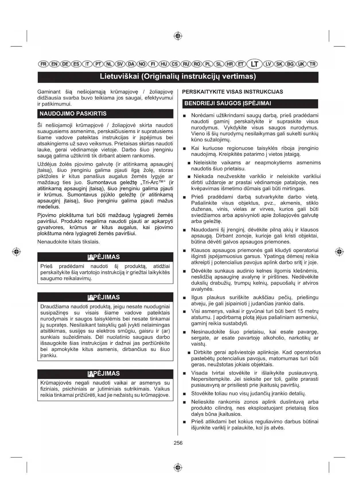 Mootoris on kasutusel L8RTF/NHSP LD või L8RTF/ BOSCH süüteküünal või samaväärne 0,5 mm elektroodide vahemikuga süüteküünal. Kasutage samasugust varuosa. ETTEVAATUST Kontrollige, et süüteküünal oleks otse. Vale keerme asend võib mootorit vigastada.256 Lietuviškai (Originalių instrukcijų vertimas) Gaminant šią nešiojamąją krūmapjovę / žoliapjovę didžiausia svarba buvo teikiama jos saugai, efektyvumui ir patikimumui. NAUDOJIMO PASKIRTIS Ši nešiojamoji krūmapjovė / žoliapjovė skirta naudoti suaugusiems asmenims, perskaičiusiems ir supratusiems šiame vadove pateiktas instrukcijas ir įspėjimus bei atsakingiems už savo veiksmus. Prietaisas skirtas naudoti lauke, gerai vėdinamoje vietoje. Darbo šiuo įrenginiu saugą galima užtikrinti tik dirbant abiem rankomis. Uždėjus žolės pjovimo galvutę (ir atitinkamą apsauginį įtaisą), šiuo įrenginiu galima pjauti ilgą žolę, storas piktžoles ir kitus panašius augalus žemės lygyje ar maždaug ties juo. Sumontavus geležtę „Tri-Arc™“ (ir atitinkamą apsauginį įtaisą), šiuo įrenginiu galima pjauti ir krūmus. Sumontavus pjūklo geležtę (ir atitinkamą apsauginį įtaisą), šiuo įrenginiu galima pjauti mažus medelius. Pjovimo plokštuma turi būti maždaug lygiagreti žemės paviršiui. Produkto negalima naudoti pjauti ar apkarpyti gyvatvores, krūmus ar kitus augalus, kai pjovimo plokštuma nėra lygiagreti žemės paviršiui. Nenaudokite kitais tikslais. ĮSPĖJIMAS Prieš pradėdami naudoti šį produktą, atidžiai perskaitykite šią vartotojo instrukciją ir griežtai laikykitės saugumo reikalavimų. ĮSPĖJIMAS Draudžiama naudoti produktą, jeigu nesate nuodugniai susipažinęs su visais šiame vadove pateiktais nurodymais ir saugos taisyklėmis bei nesate tinkamai jų supratęs. Nesilaikant taisyklių gali įvykti nelaimingas atsitikimas, susijęs su elektros smūgiu, gaisru ir (ar) sunkiais sužeidimais. Dėl nuolatinio saugaus darbo išsaugokite šias instrukcijas ir dažnai jas peržiūrėkite bei apmokykite kitus asmenis, dirbančius su šiuo įrankiu. ĮSPĖJIMAS Krūmapjovės negali naudoti vaikai ar asmenys su fiziniais, psichiniais ar jutiminiais sutrikimais. Vaikus reikia tinkamai prižiūrėti, kad jie nežaistų su krūmapjove.