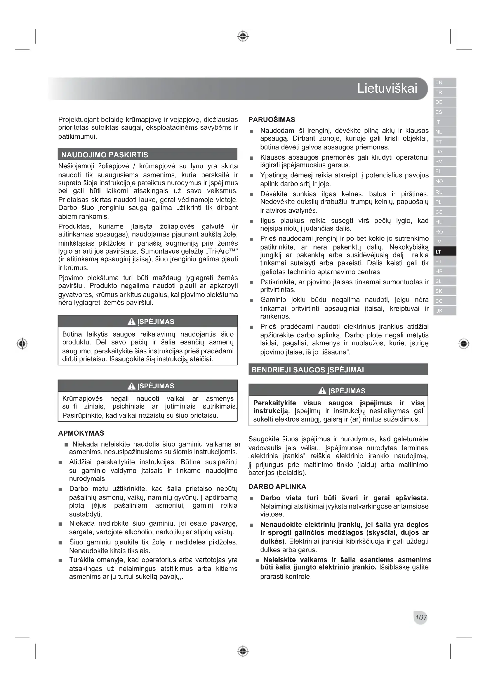 Projektuojant belaidę krūmapjovę ir vejapjovę, didžiausias prioritetas suteiktas saugai, eksploatacinėms savybėms ir patikimumui. NAUDOJIMO PASKIRTIS Nešiojamoji žoliapjovė / krūmapjovė su lynu yra skirta naudoti tik suaugusiems asmenims, kurie perskaitė ir suprato šioje instrukcijoje pateiktus nurodymus ir įspėjimus bei gali būti laikomi atsakingais už savo veiksmus. Prietaisas skirtas naudoti lauke, gerai vėdinamoje vietoje. Darbo šiuo įrenginiu saugą galima užtikrinti tik dirbant abiem rankomis. Produktas, kuriame įtaisyta žoliapjovės galvutė (ir atitinkamas apsaugas), naudojamas pjaunant aukštą žolę, minkštąsias piktžoles ir panašią augmeniją prie žemės lygio ar arti jos paviršiaus. Sumontavus geležtę „Tri-Arc™“ (ir atitinkamą apsauginį įtaisą), šiuo įrenginiu galima pjauti ir krūmus. Pjovimo plokštuma turi būti maždaug lygiagreti žemės paviršiui. Produkto negalima naudoti pjauti ar apkarpyti gyvatvores, krūmus ar kitus augalus, kai pjovimo plokštuma nėra lygiagreti žemės paviršiui. ĮSPĖJIMAS Būtina laikytis saugos reikalavimų naudojantis šiuo produktu. Dėl savo pačių ir šalia esančių asmenų saugumo, perskaitykite šias instrukcijas prieš pradėdami dirbti prietaisu. Išsaugokite šią instrukciją ateičiai. ĮSPĖJIMAS Krūmapjovės negali naudoti vaikai ar asmenys su fi ziniais, psichiniais ar jutiminiais sutrikimais. Pasir ūpinkite, kad vaikai nežaistų su šiuo prietaisu. APMOKYMAS ■ Niekada neleiskite naudotis šiuo gaminiu vaikams ar asmenims, nesusipažinusiems su šiomis instrukcijomis. ■ Atidžiai perskaitykite instrukcijas. Būtina susipažinti su gaminio valdymo įtaisais ir tinkamo naudojimo nurodymais. ■ Darbo metu užtikrinkite, kad šalia prietaiso nebūtų pašalinių asmenų, vaikų, naminių gyvūnų. Į apdirbamą plotą įėjus pašaliniam asmeniui, gaminį reikia sustabdyti. ■ Niekada nedirbkite šiuo gaminiu, jei esate pavargę, sergate, vartojote alkoholio, narkotikų ar stiprių vaistų. ■ Šiuo gaminiu pjaukite tik žolę ir nedideles piktžoles. Nenaudokite kitais tikslais. ■ Turėkite omenyje, kad operatorius arba vartotojas yra atsakingas už nelaimingus atsitikimus arba kitiems asmenims ar jų turtui sukeltą pavojų,. PARUOŠIMAS ■ Naudodami šį įrenginį, dėvėkite pilną akių ir klausos apsaugą. Dirbant zonoje, kurioje gali kristi objektai, būtina dėvėti galvos apsaugos priemones. ■ Klausos apsaugos priemonės gali kliudyti operatoriui išgirsti įspėjamuosius garsus. ■ Ypatingą dėmesį reikia atkreipti į potencialius pavojus aplink darbo sritį ir joje. ■ Dėvėkite sunkias ilgas kelnes, batus ir pirštines. Nedėvėkite dukslių drabužių, trumpų kelnių, papuošalų ir atviros avalynės. ■ Ilgus plaukus reikia susegti virš pečių lygio, kad neįsipainiotų į judančias dalis. ■ Prieš naudodami įrenginį ir po bet kokio jo sutrenkimo patikrinkite, ar nėra pakenktų dalių. Nekokybišką jungiklį ar pakenktą arba susidėvėjusią dalį reikia tinkamai sutaisyti arba pakeisti. Dalis keisti gali tik įgaliotas techninio aptarnavimo centras. ■ Patikrinkite, ar pjovimo įtaisas tinkamai sumontuotas ir pritvirtintas. ■ Gaminio jokiu būdu negalima naudoti, jeigu nėra tinkamai pritvirtinti apsauginiai įtaisai, kreiptuvai ir rankenos. ■ Prieš pradėdami naudoti elektrinius įrankius atidžiai apžiūrėkite darbo aplinką. Darbo plote negali mėtytis laidai, pagaliai, akmenys ir nuolaužos, kurie, įstrigę pjovimo įtaise, iš jo „iššauna“.