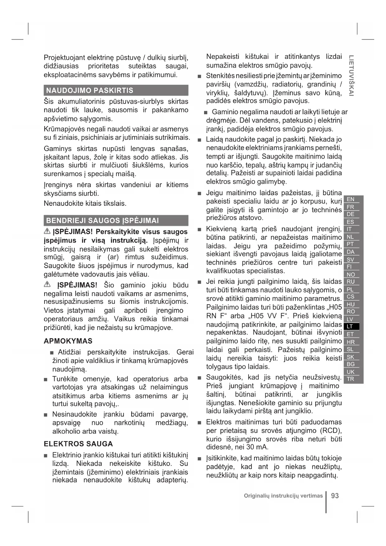 Tulkots no oriģinālās instrukcijasProjektuojant elektrinę pūstuvę / dulkių siurblį, didžiausias prioritetas suteiktas saugai, eksploatacinėms savybėms ir patikimumui. NAUDOJIMO PASKIRTIS Šis akumuliatorinis pūstuvas-siurblys skirtas naudoti tik lauke, sausomis ir pakankamo apšvietimo sąlygomis. Krūmapjovės negali naudoti vaikai ar asmenys su fi ziniais, psichiniais ar jutiminiais sutrikimais. Gaminys skirtas nupūsti lengvas sąnašas, įskaitant lapus, žolę ir kitas sodo atliekas. Jis skirtas siurbti ir mulčiuoti šiukšlėms, kurios surenkamos į specialų maišą. Įrenginys nėra skirtas vandeniui ar kitiems skysčiams siurbti. Nenaudokite kitais tikslais.