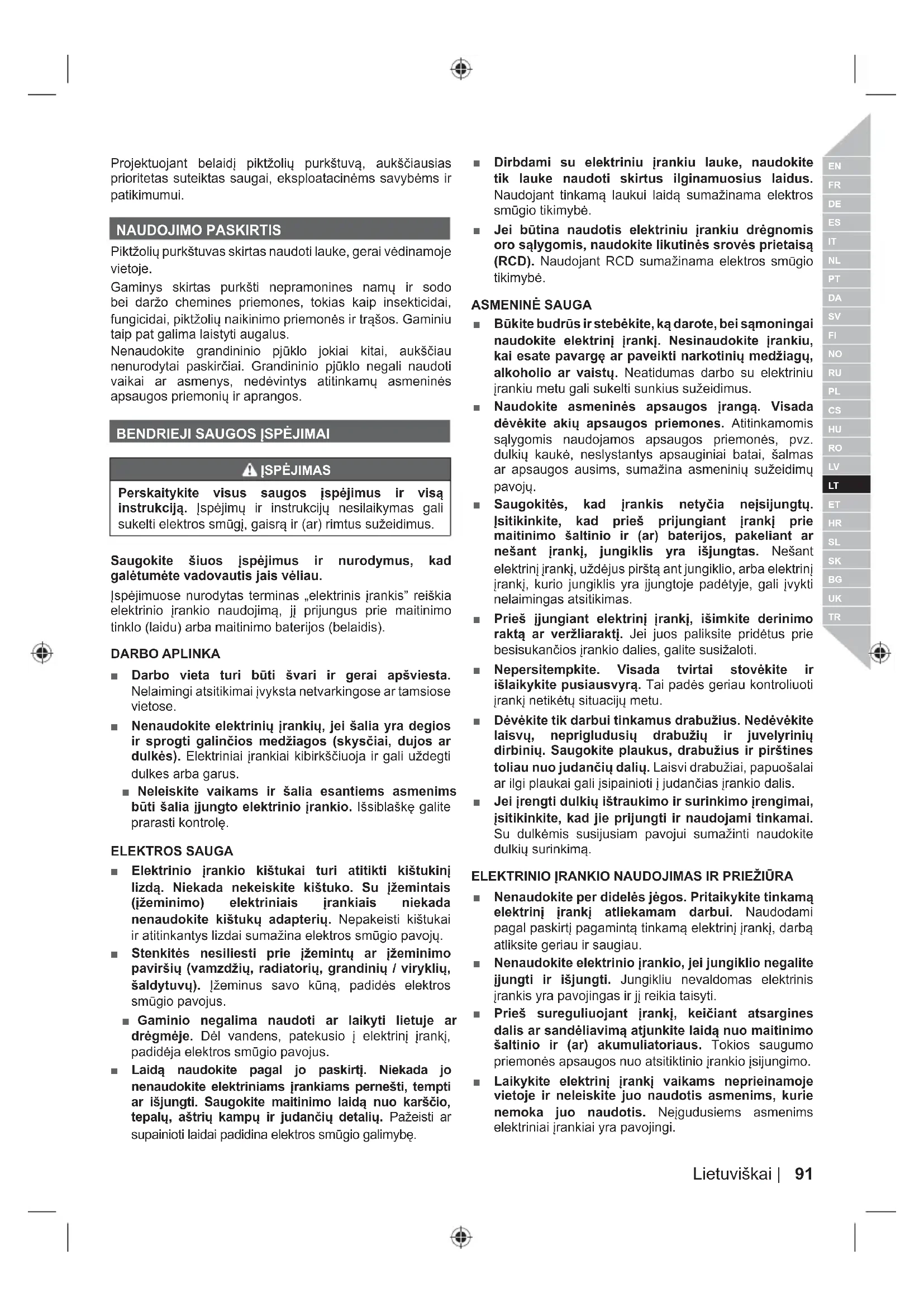 ■ Pakartotinai kraukite prietaisą tik naudodami gamintojo nurodytą kroviklį. Vieno tipo akumuliatoriui tinkantis įkroviklis gali kelti gaisro pavojų kitokiam akumuliatoriui. ■ Elektrinius įrankius naudokite tik su jiems skirtais baterijų paketais. Naudojant kitokius akumuliatorius, galima susižeisti ar sukelti gaisrą. ■ Kai akumuliatorius nenaudojamas, jį laikykite toliau nuo kitų metalinių daiktų, pavyzdžiui, sąvaržėlių, monetų, raktų, vinių, varžtų ar kitų mažų metalinių daiktų, kurie vieną gnybtą gali sujungti su kitu. Sutrumpinus vieną akumuliatoriaus gnybtą su kitu, galima nusideginti arba sukelti gaisrą. ■ Netinkamomis sąlygomis iš akumuliatoriaus gali ištekėti skystis - nelieskite jo. Jei atsitiktinai prisilietėte - nuplaukite vandeniu. Jei skysčio pateko į akis, papildomai kreipkitės į gydytoją. Iš akumuliatoriaus ištekėjęs skystis gali nudeginti ar sukelti sudirginimus. TECHNINIS APTARNA VIMAS ■ Elektrinį įrankį turi remontuoti tik kvalifikuoti darbuotojai, kurie naudoja identiškas atsargines dalis. Tai užtikrina elektrinio įrankio saugumą. PIKTŽOLIŲ PURKŠTUVO SAUGOS ĮSPĖJIMAI ■ Nepurkšti degių skysčių, tokių kaip benzinas, kad gaisro ar sprogimo pavojus būtų kuo mažesnis. ■ Būtinai vadovaukitės cheminės priemonės gamintojo nurodymais, pateiktais ant gaminio naudojimo, valymo ir laikymo etikečių. Chemines priemones reikia laikyti vaikams nepasiekiamoje vietoje. ■ Nepurkšti jokios medžiagos nežinant apie jos keliamą pavojų. ■ Kad purškiamų medžiagų patektų kuo mažiau, reikia dėvėti patvirtintas saugos priemones, tokias kaip purškimui skirta apsauginė veido kaukė, pirštinės ir kitos tinkamos apsauginės priemonės. ■ Gaminio valymui nenaudoti degių tirpiklių ar abrazyvinių valymo medžiagų. ĮSPĖJIMAS Saugoti akis nuo purškimo medžiagų. Purškimo medžiagoms patekus į akis, nedelsiant jas praplauti švariu vandeniu. Jeigu dirginimas nesiliauja, nedelsiant kreiptis pagalbos į gydytoją.