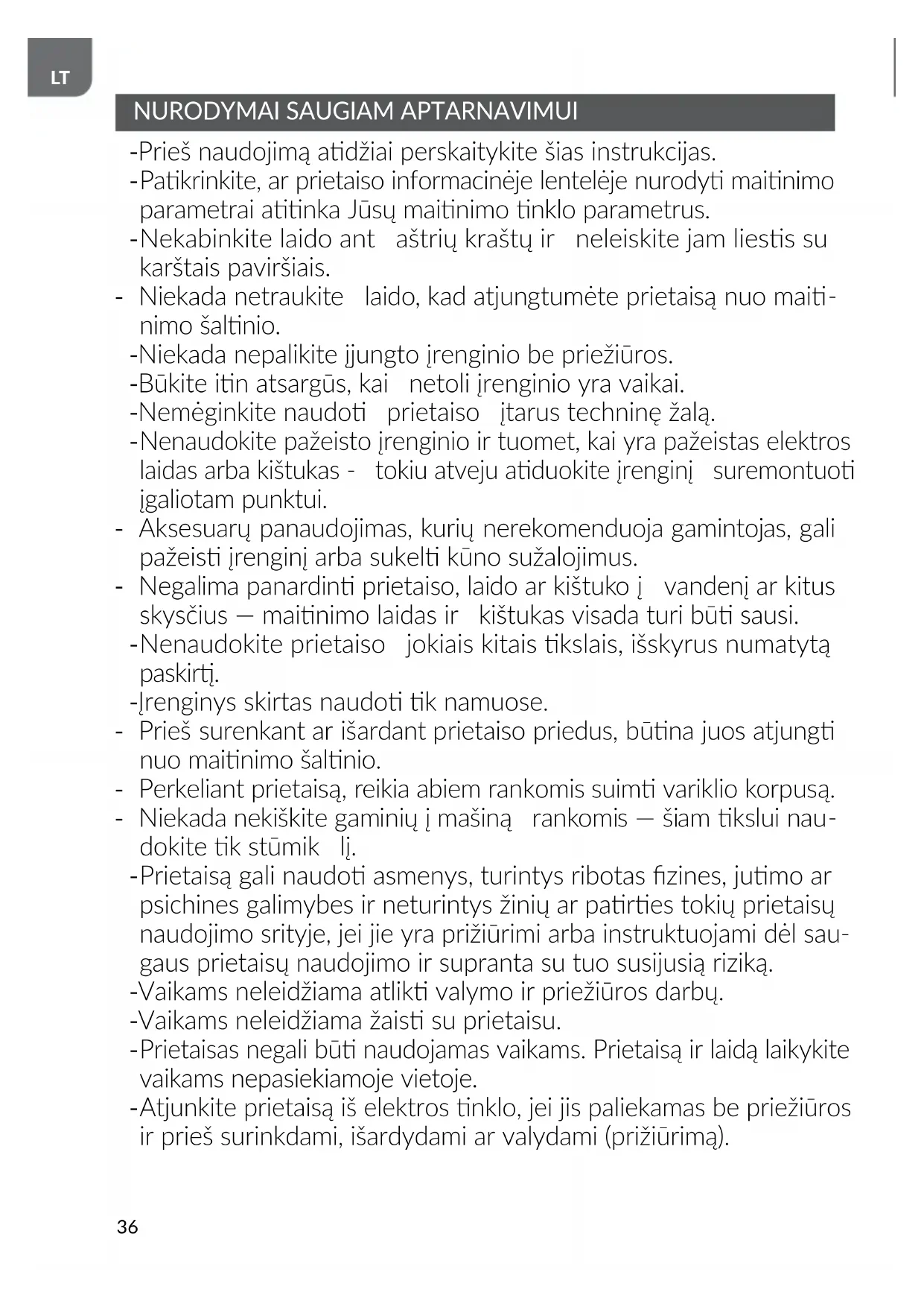 Atjunkite prietaisą iš elektros nklo, jei jis paliekamas be priežiūros ir prieš surinkdami, išardydami ar valydami (prižiūrimą).37