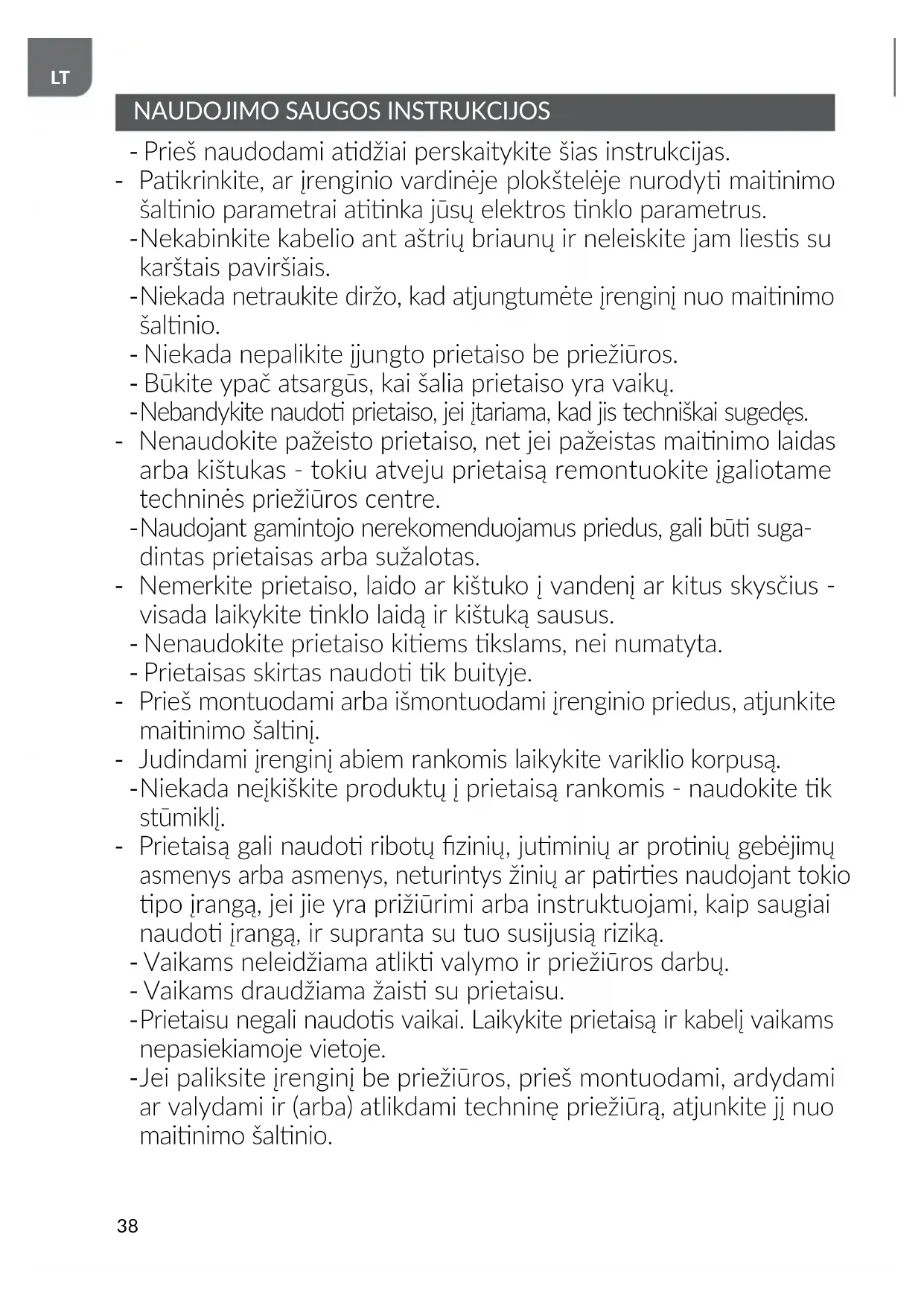 Prieš pradėdami darbą visada įsikinkite, kad visi įrenginio kompo- nentai yra nkamai sumontuo. - Prietaiso negalima naudo lauke. - Nestatykite įrenginio ant karštų paviršių. - Neišimkite kištuko iš elektros lizdo traukdami už laido. - Nekiškite kištuko į elektros lizdą šlapiomis rankomis.