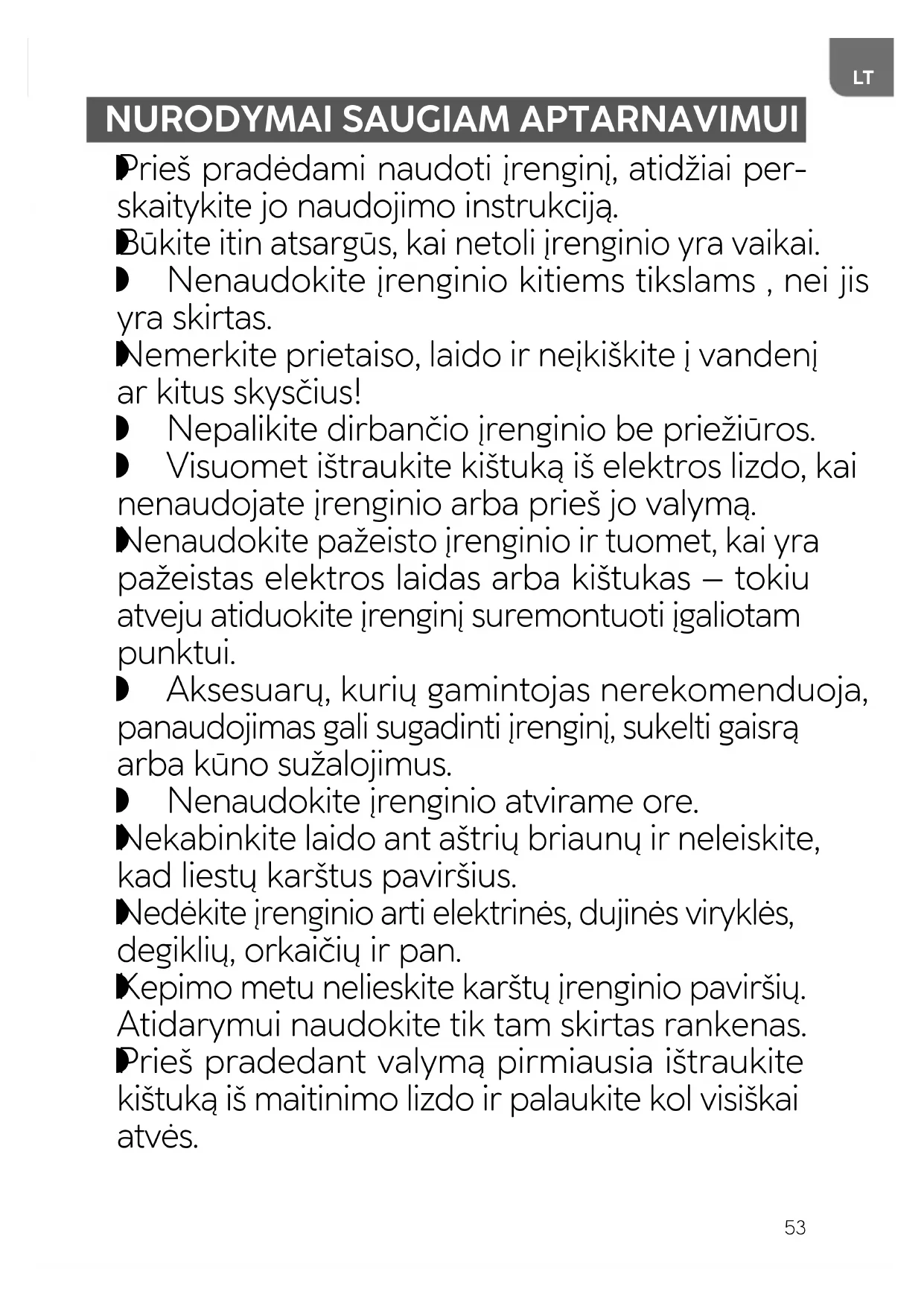 Nedėkite įrenginio arti lengvai užsidegančių medžiagų, tokių kaip užuolaidos, staltiesės ir kiti, tai gali sukelti gaisrą. Netraukite kištuko iš elektros lizdo už laido.55